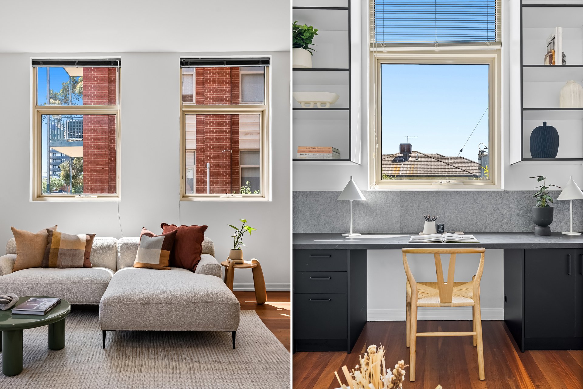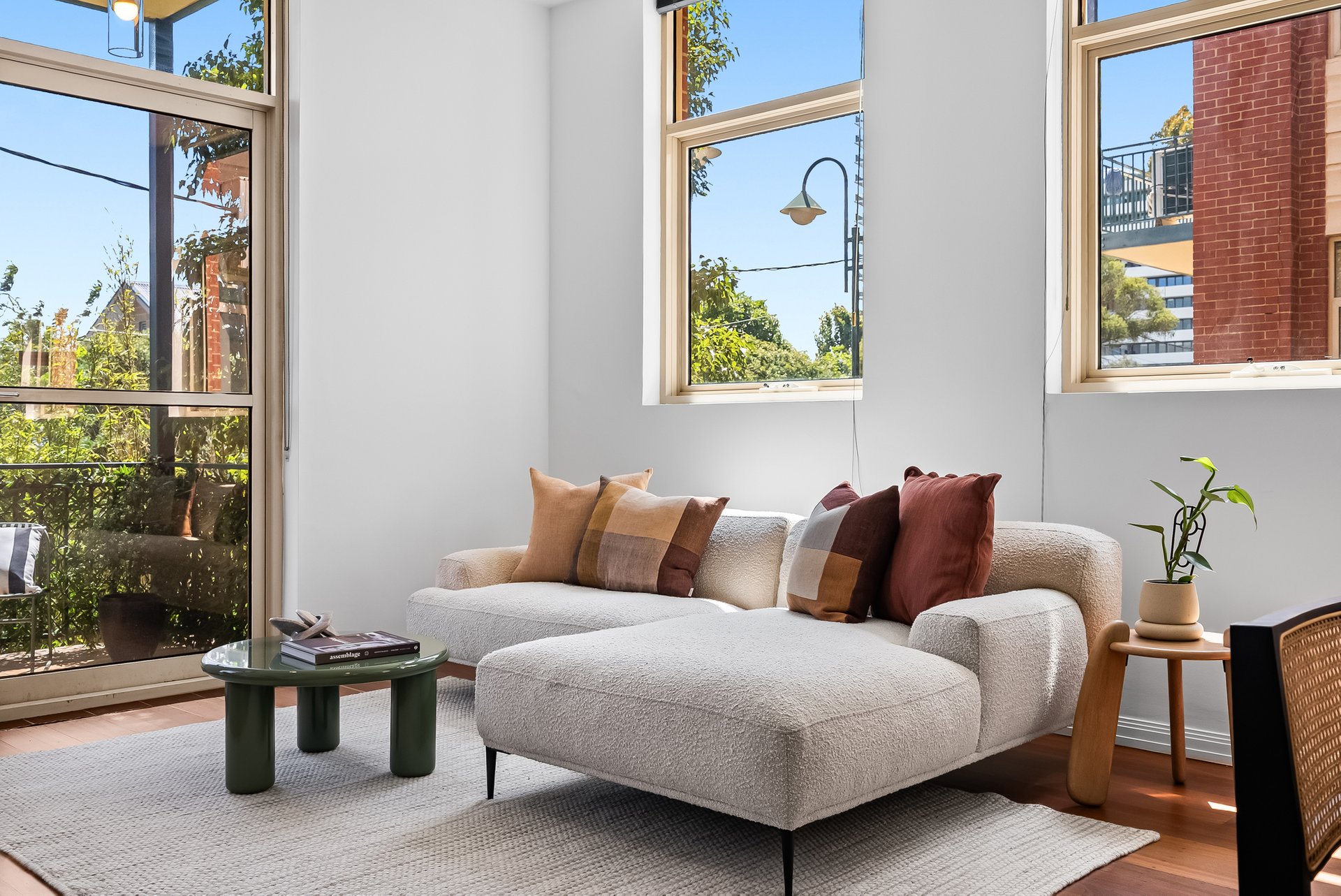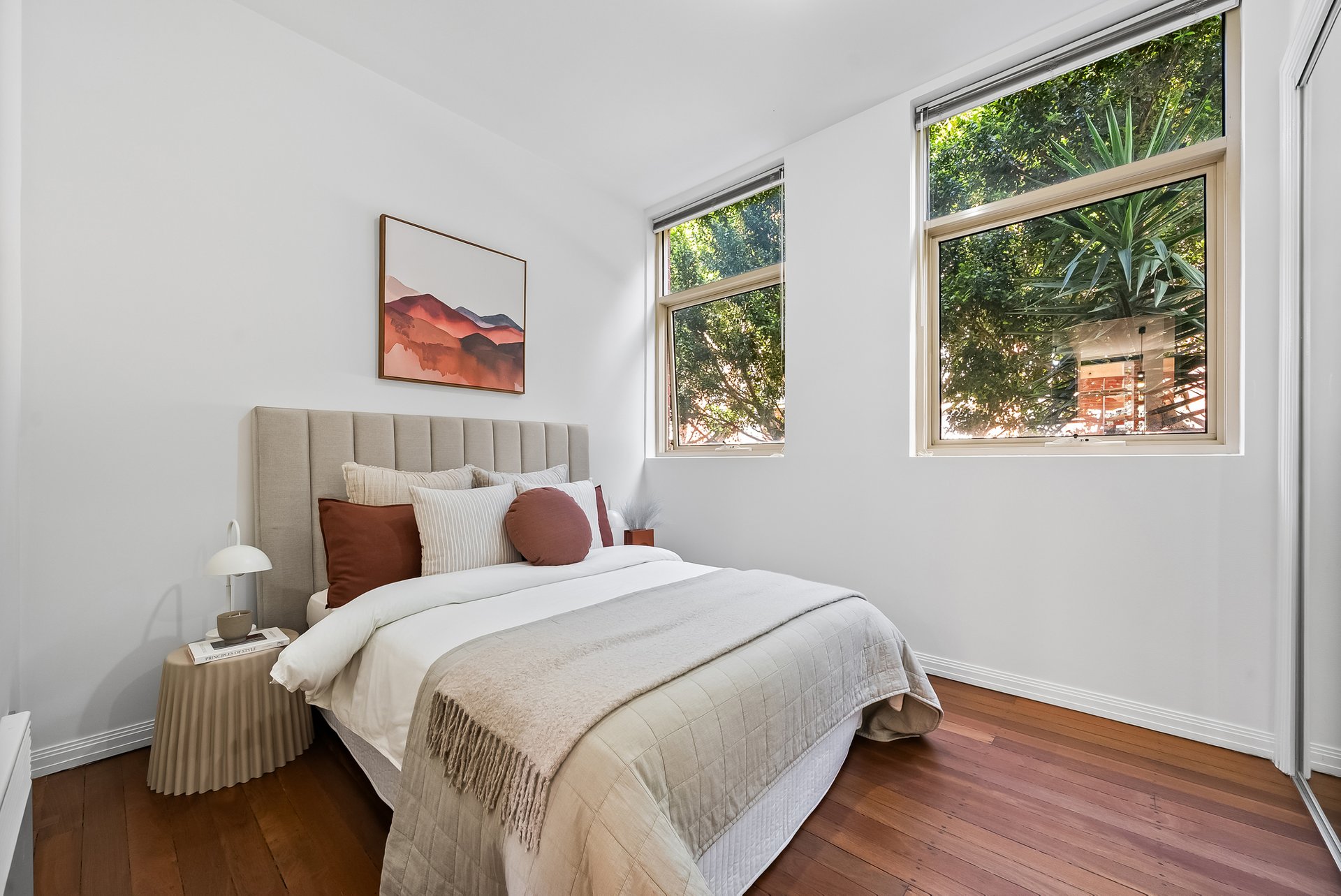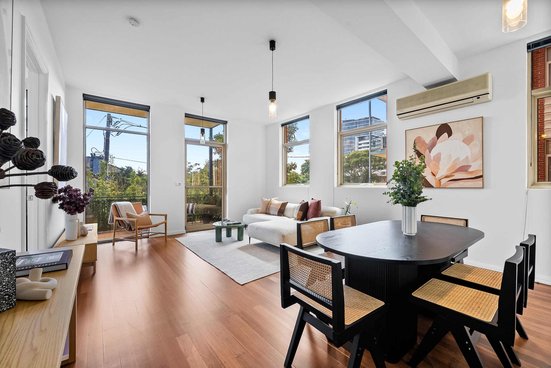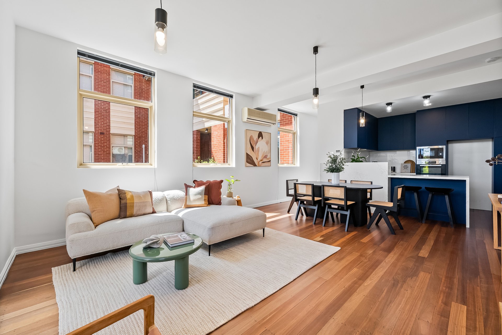 This beautifully presented three bedroom, two bathroom apartment delivers an inviting lifestyle defined by natural light, generous proportions and effortless everyday comfort. Set in a solid brick heritage building, the apartment is laid out on one level, with the open plan living and dining area at the heart of the home. Floor to ceiling, north facing windows, draw in sunlight throughout the day with the high ceilings enhancing the sense of space, while warm timber flooring adds an earthy, calming atmosphere.