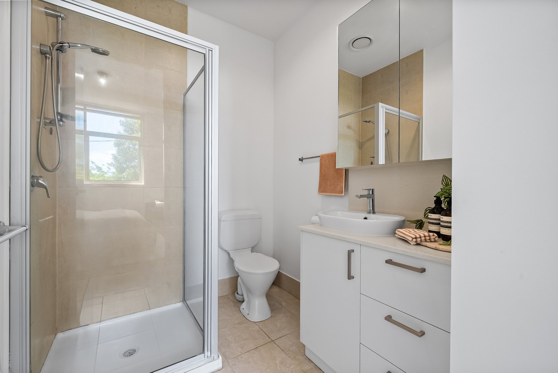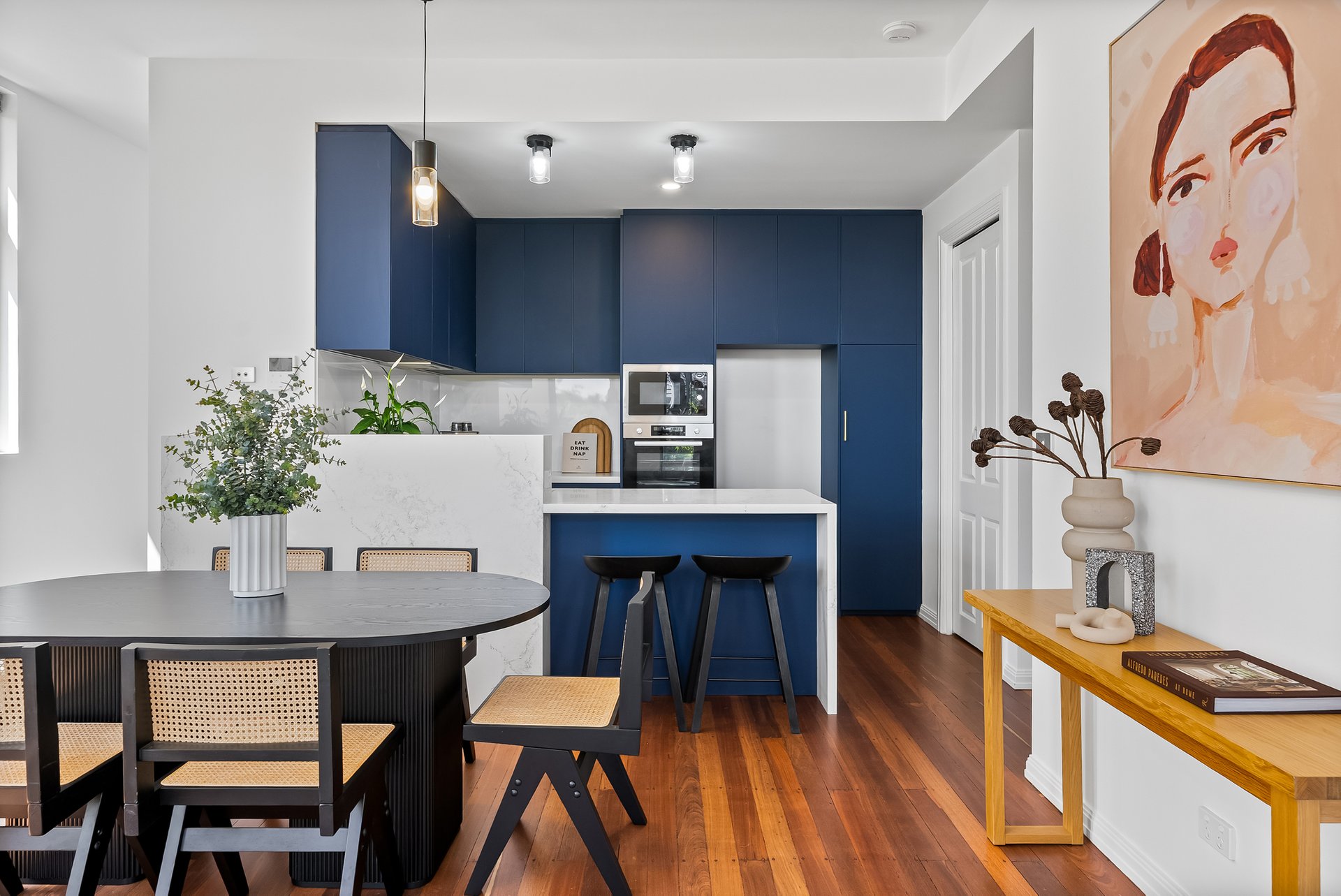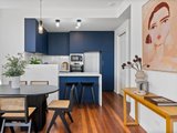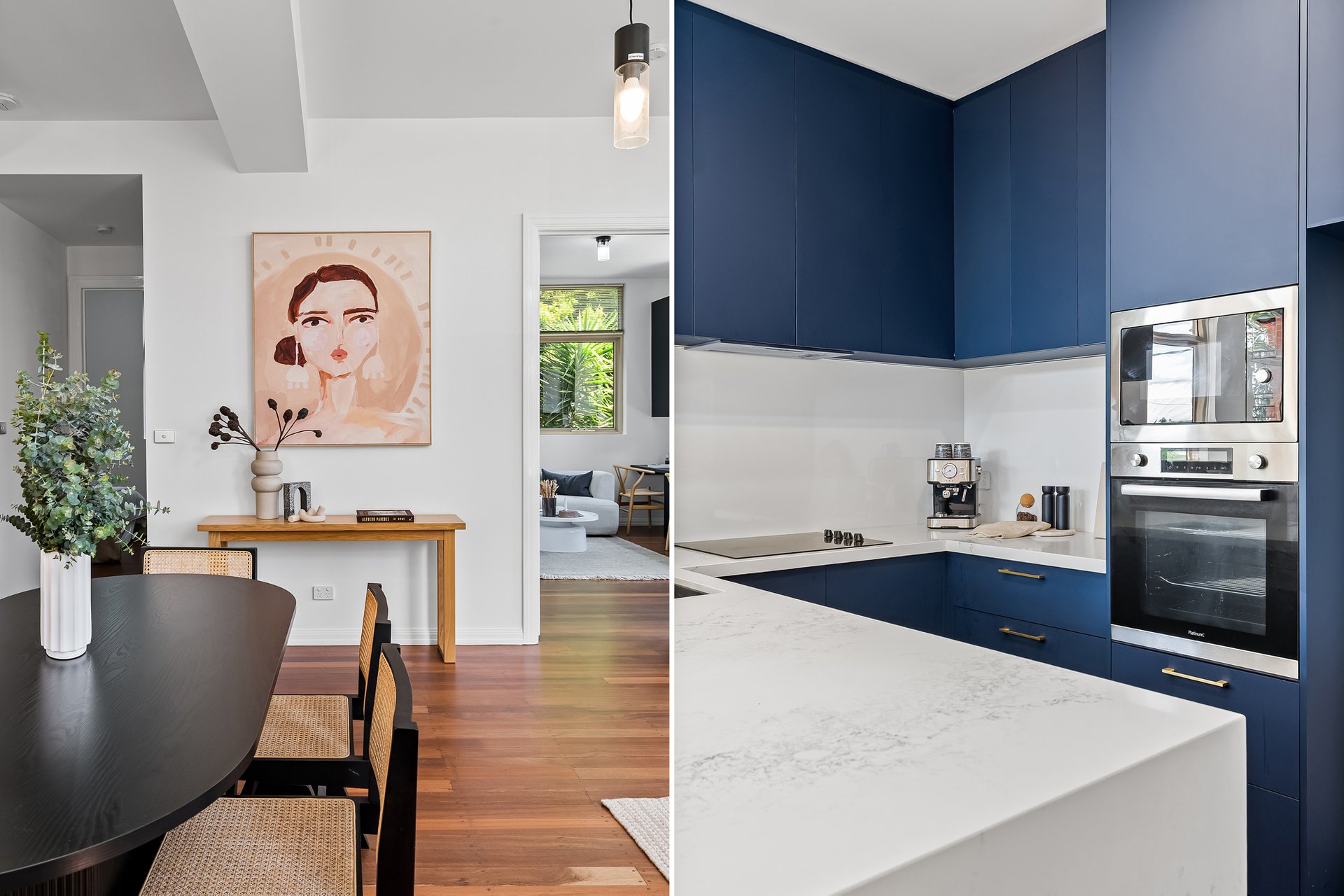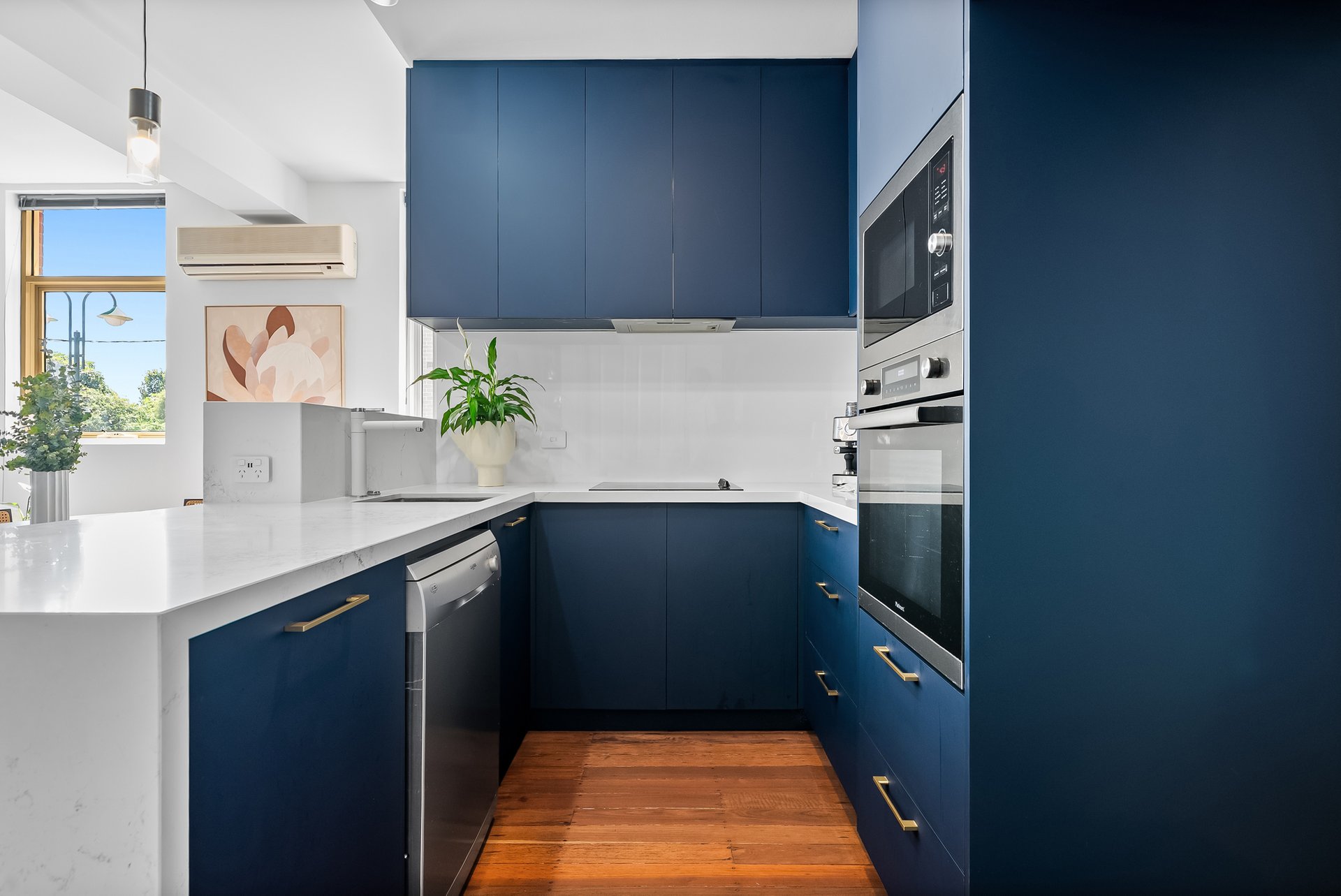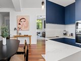 The newly renovated kitchen blends style and practicality with stone benchtops featuring a waterfall finish, navy cabinetry, golden hardware and electric cooktop paired with a modern oven. Each bedroom enjoys its own unique feel. The large front bedroom with a full length built in desk, offers flexibility as a work from home space. The second bedroom boasts timber flooring, high ceilings and a leafy outlook and the master bedroom offers north facing windows, a generous walk in robe and a private ensuite. The home also features a full size laundry with stone topped bench and spacious central bathroom with bathtub for added relaxation.