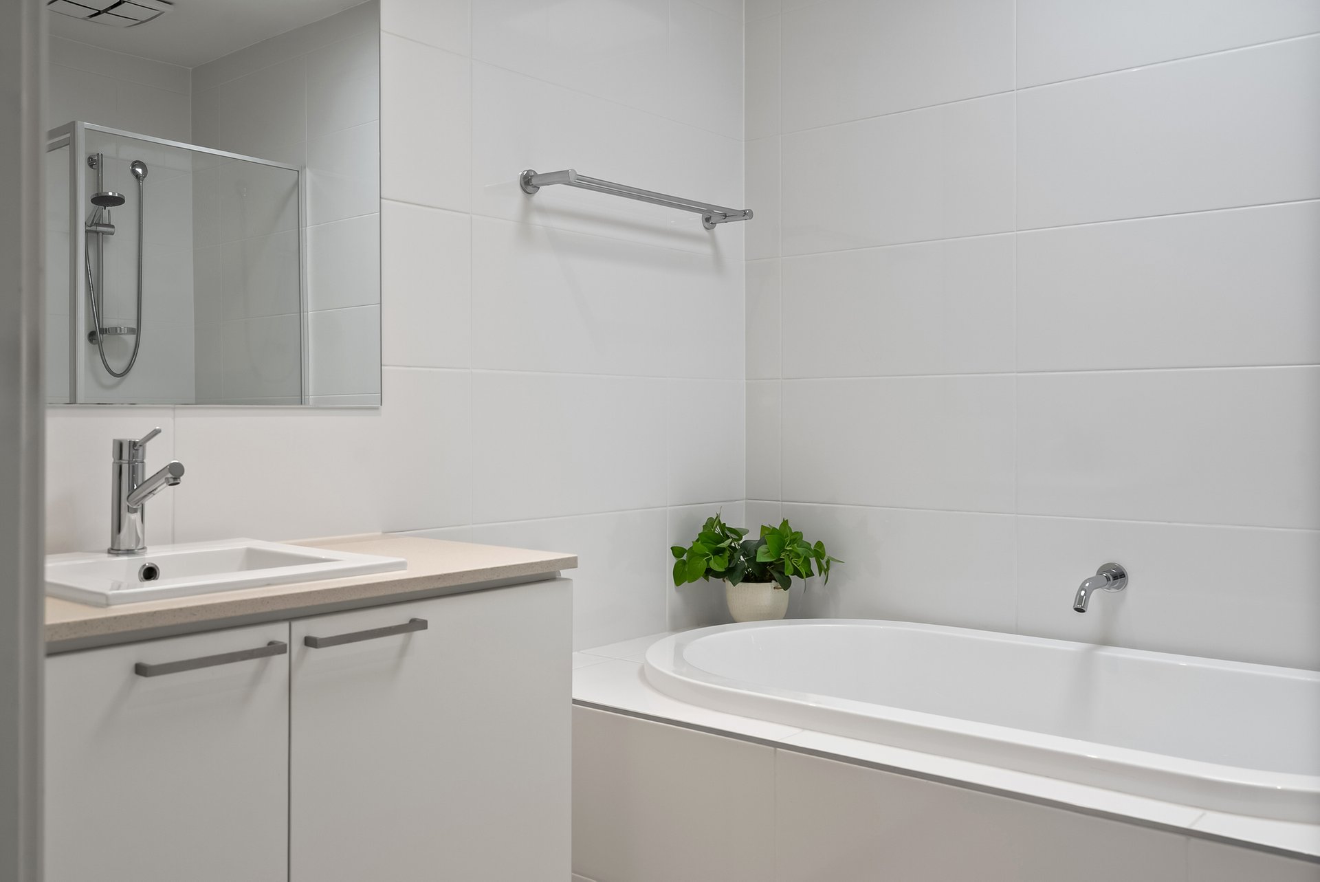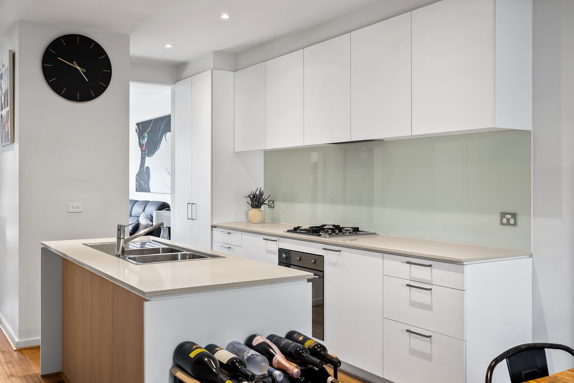Centrally positioned, the kitchen acts as the heart of the home, separating the living zones while remaining visually connected. Finished with stone benchtops, white cabinetry, glass splashback and quality stainless steel appliances including a gas cooktop, electric oven and dishwasher, it offers a clean, functional space designed for daily use.