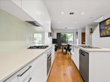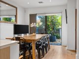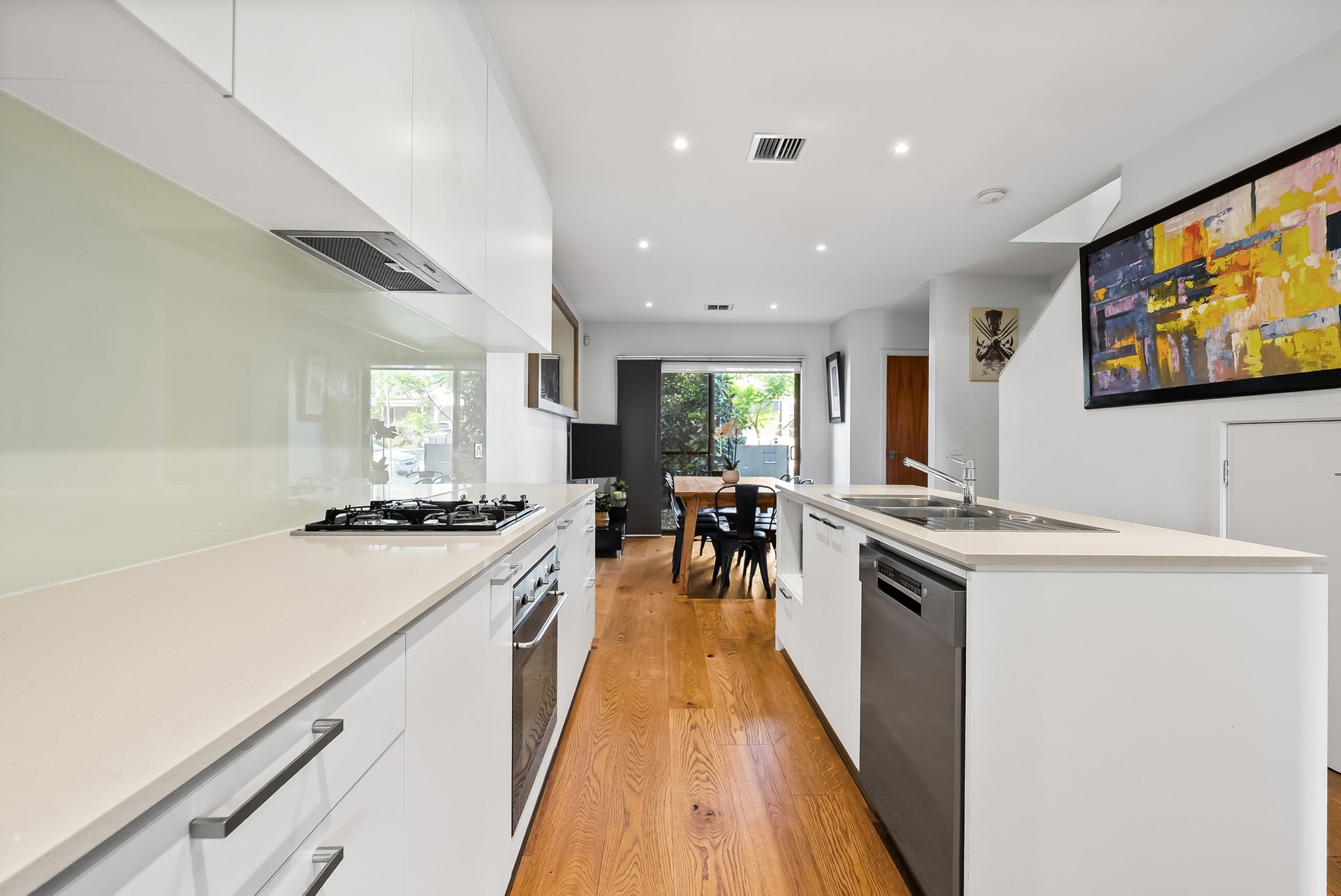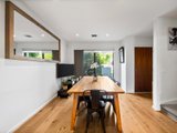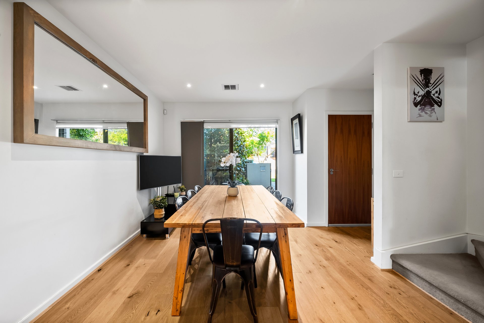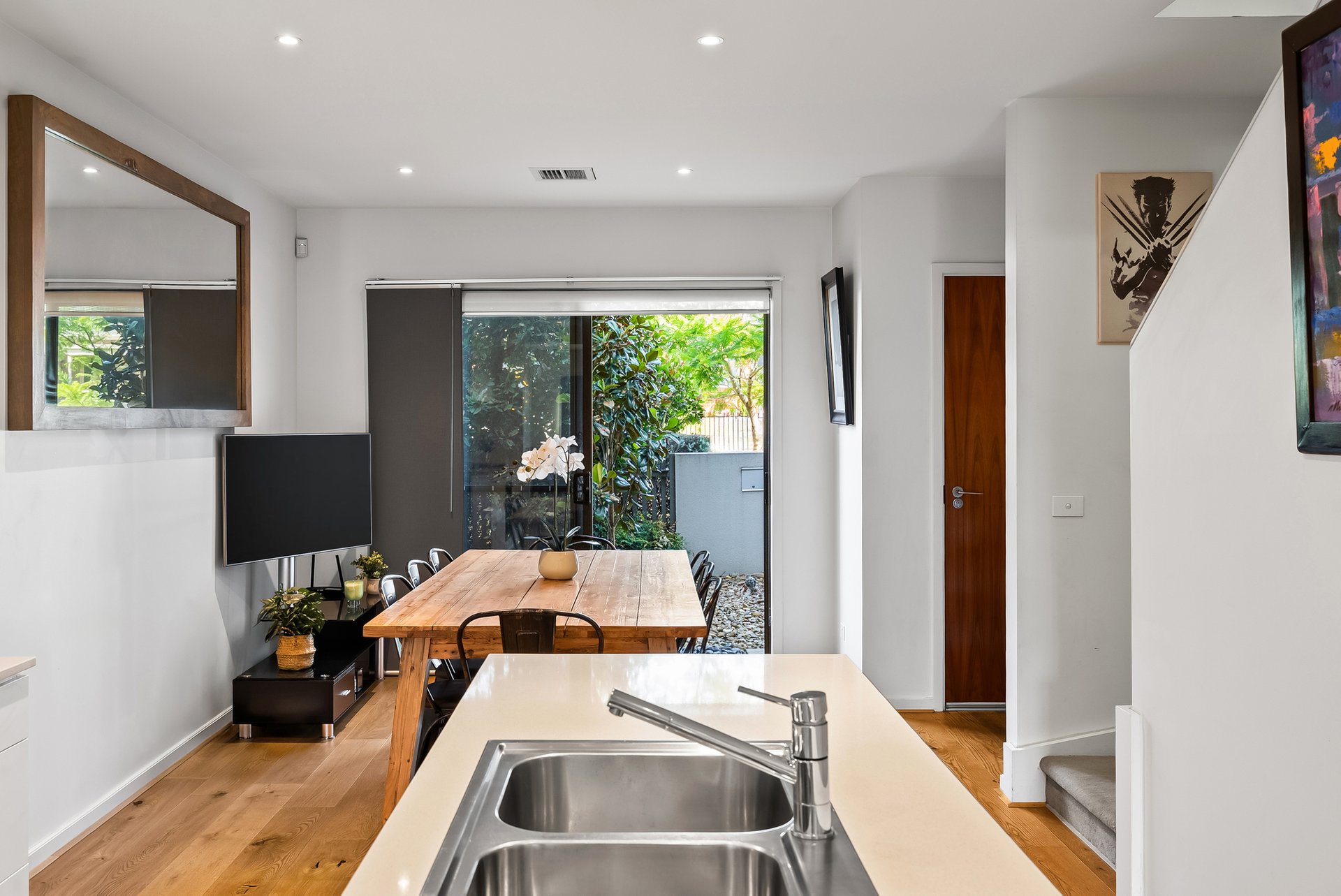 The ground floor brings living, dining and kitchen together in a well-considered layout. The dining zone sits at the entry and opens through a full-width sliding door, allowing greenery and natural light to flow inside and create an immediate sense of freshness. Timber flooring through the ground level enhancing warmth and continuity, while crisp white walls reflect light and give the home an airy, open feel. Toward the rear, the living area feels both open and comfortably defined, with large windows and direct access to the backyard, making it equally suited to everyday living or entertaining. Reverse-cycle heating and cooling ensures year-round comfort.