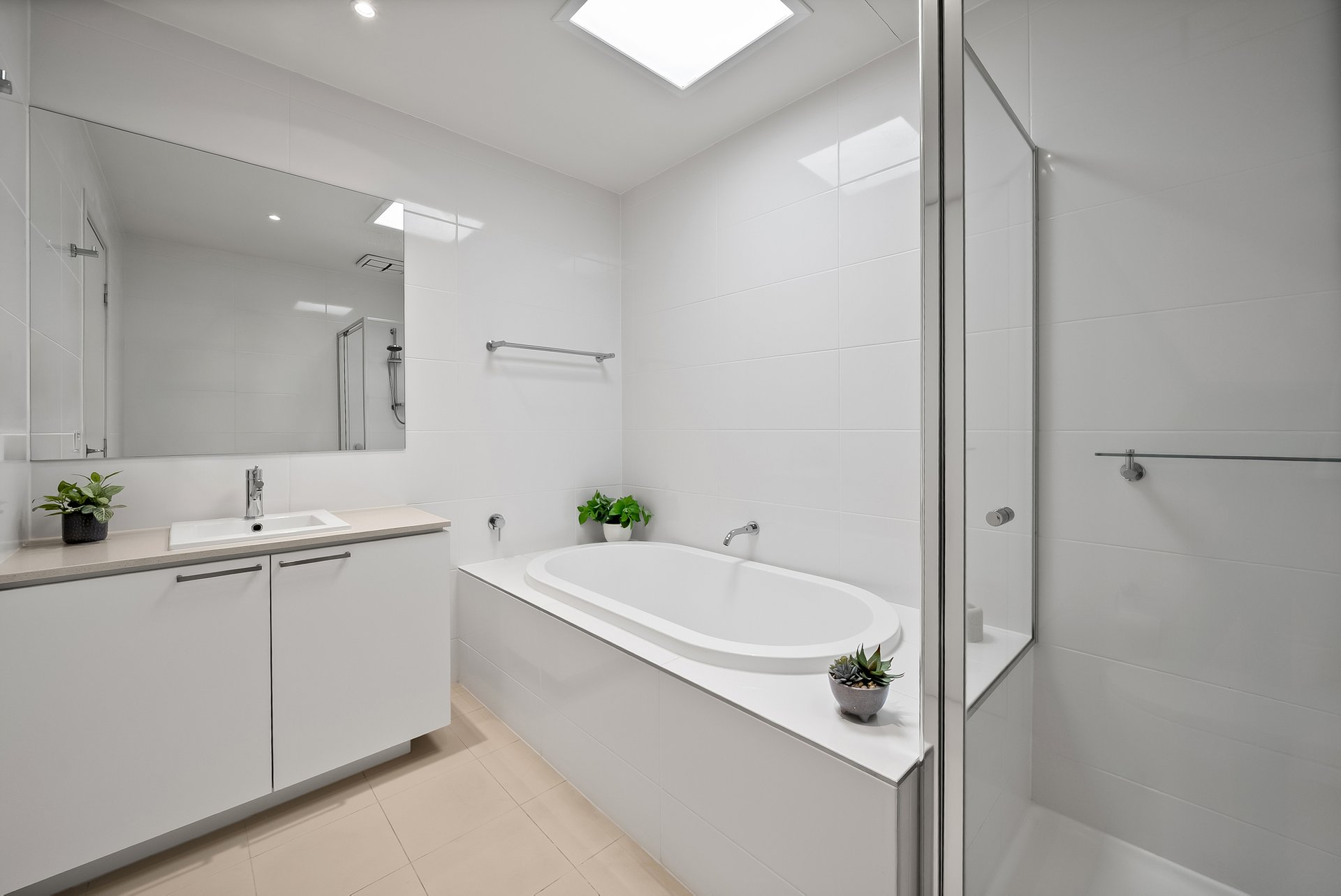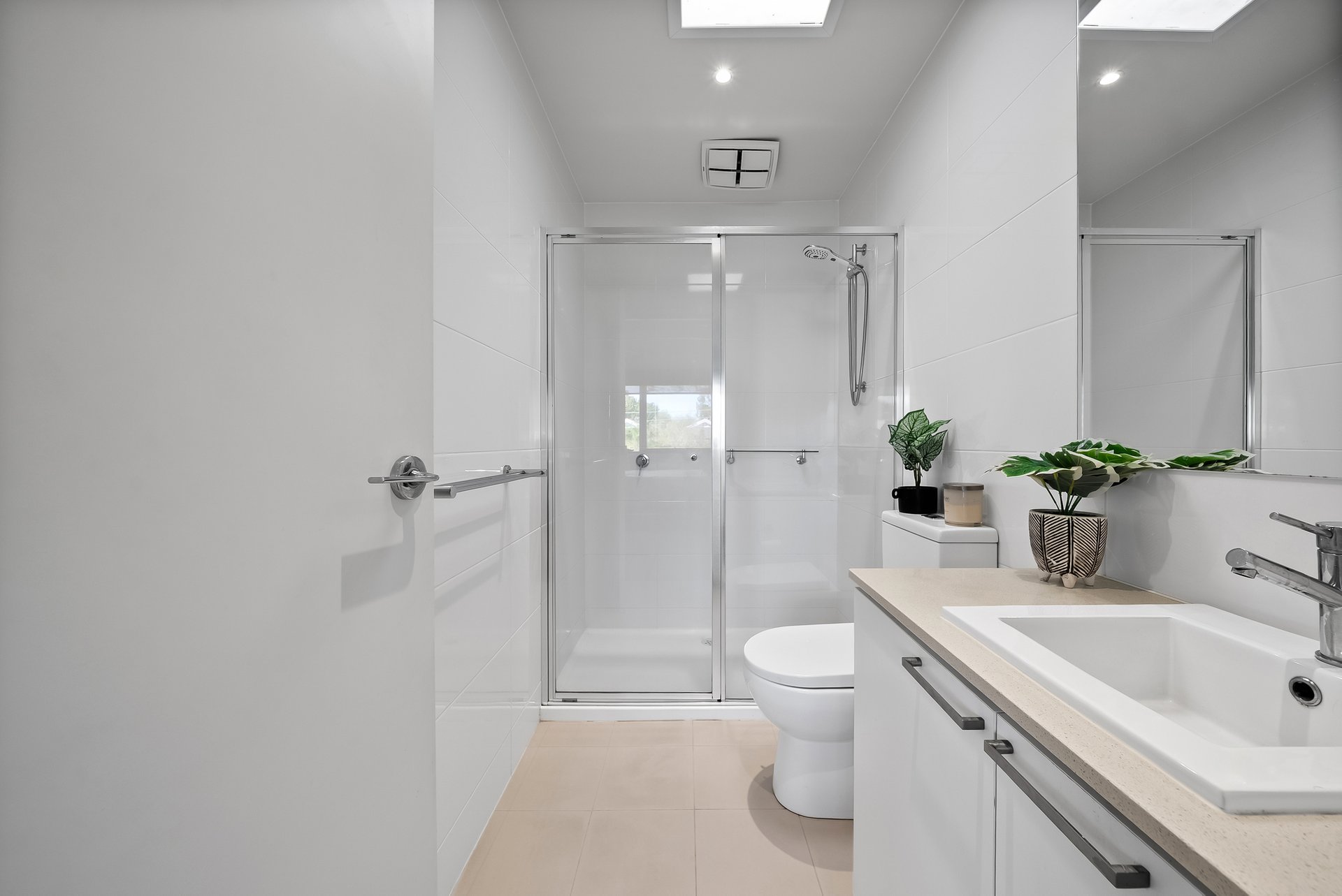 The home includes a main bathroom and ensuite, both finished in light tones and enhanced by skylights that flood the spaces with natural light. The separate bath offering a welcome place to unwind. A study nook positioned on the upper landing beneath a striking skylight adds valuable flexibility for working from home or study.