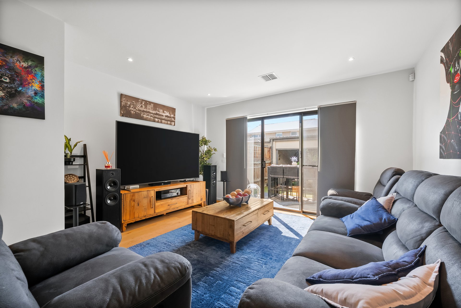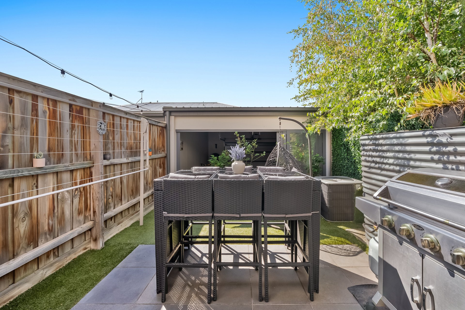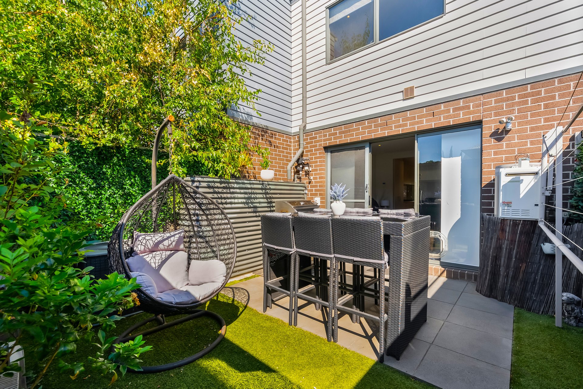 Outdoors, the rear yard is designed for easy enjoyment, featuring tiled areas ideal for BBQs and outdoor dining, astroturf for low maintenance and leafy neighbouring trees that bloom in spring. A secure garage provides parking plus additional storage.