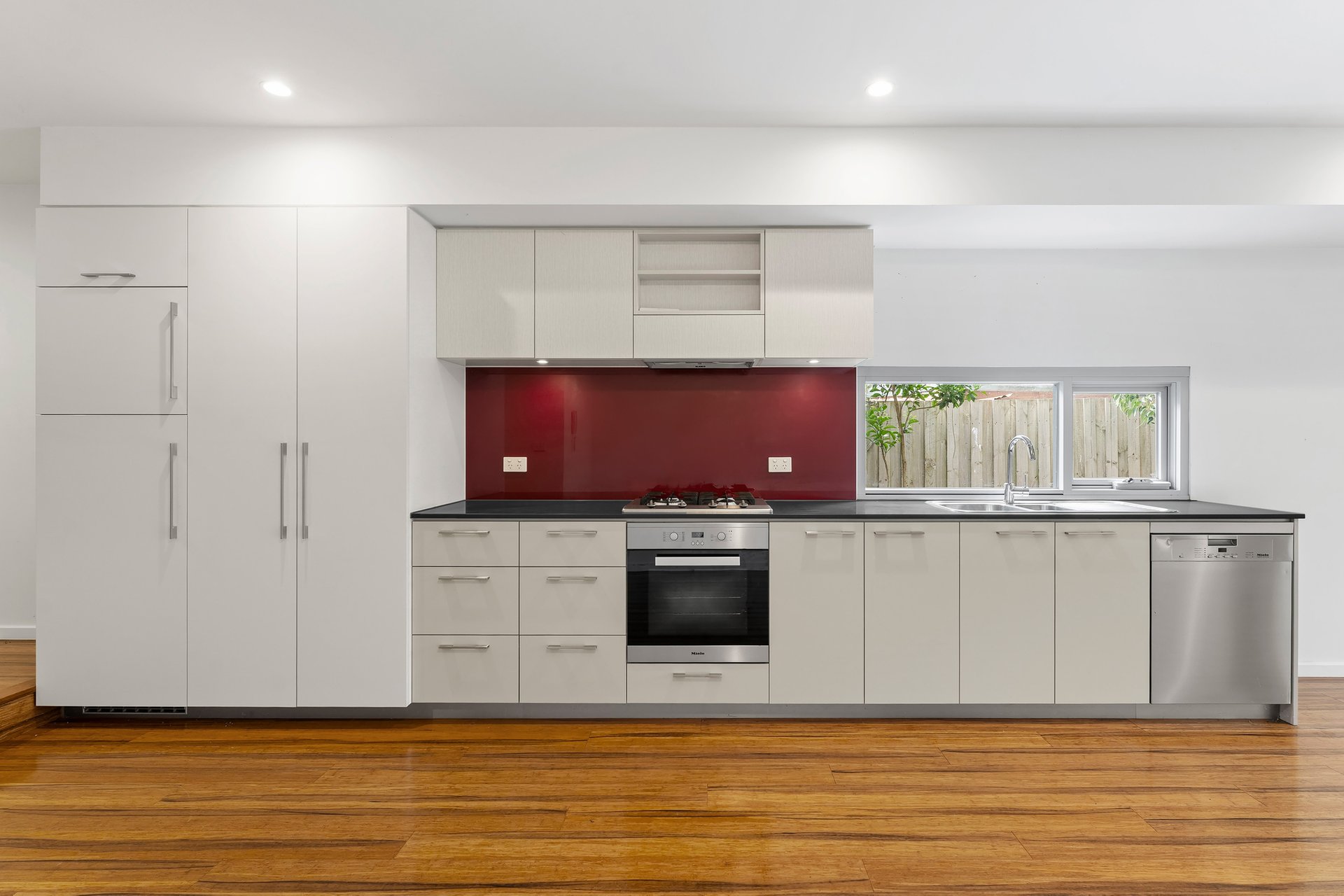 Thoughtfully designed across two spacious levels, the home maximises space and natural light throughout. The ground floor reveals an open-plan living and dining domain, complemented by high ceilings and warm timber flooring, creating an inviting setting for both everyday living and entertaining. At the centre, a sleek modern kitchen is appointed with stone benchtops, stainless steel appliances, a glass splashback and integrated fridge. A powder room and European laundry add further practicality.