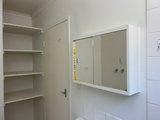Well-appointed bathroom with shower-over-bath and a convenient laundry space with built-in shelves