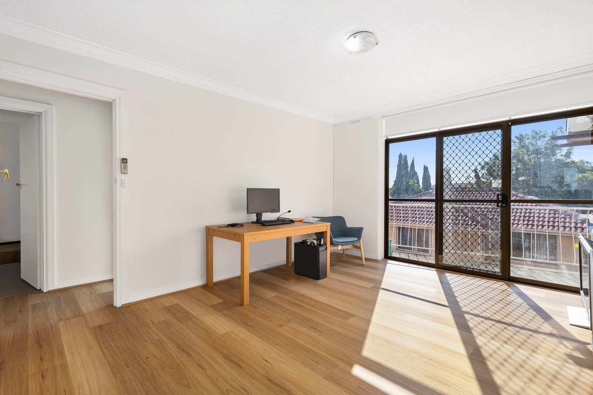 A seamless open-plan layout is bathed in natural light, with a well-appointed kitchen featuring stone benchtops, stainless steel appliances, and abundant storage—a space that effortlessly combines form and function. Flowing beyond, the private outdoor area offers an inviting retreat, perfect for entertaining or unwinding with city glimpses as your backdrop.