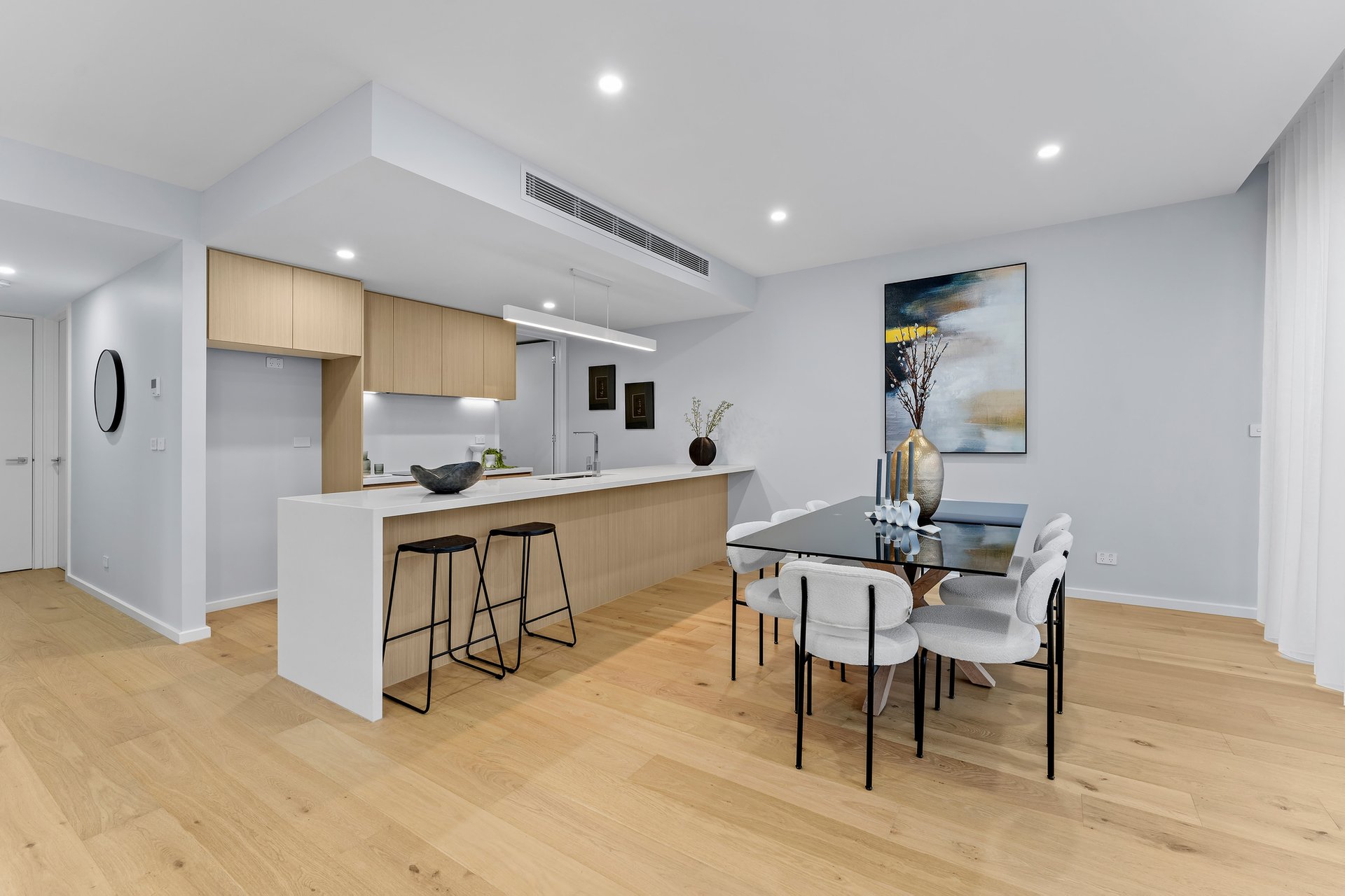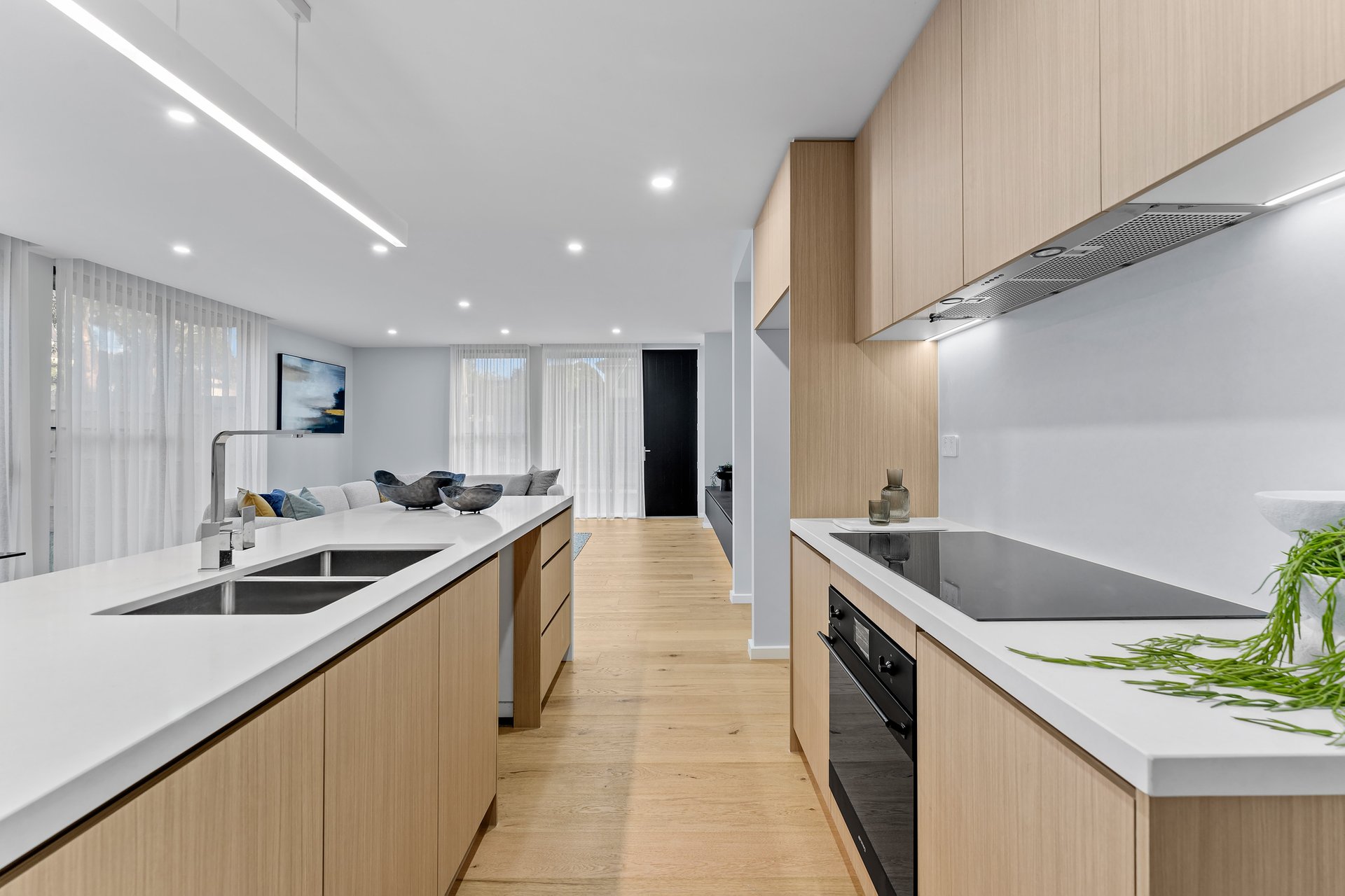 Thoughtfully designed for modern living, the home opens to a light-filled open-plan living and dining domain enhanced by warm timber flooring and generous proportions. At its heart sits a sleek and well-appointed kitchen featuring stone benchtops, quality appliances, extensive cabinetry and a walk-in pantry, providing the perfect environment for both everyday cooking and entertaining. Large sliding doors extend the living space outdoors to a private alfresco area, creating an effortless indoor-outdoor connection ideal for relaxed gatherings with family and friends.