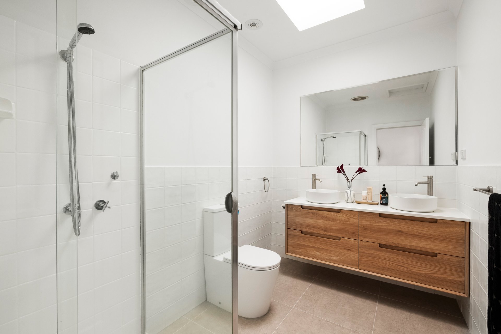 A floating twin vanity with brushed nickel tapware is a highlight of the stylishly updated bathroom, where a soaring skylight brings in abundant natural sunlight. A laundry and separate WC complete the main home, while the large rear bungalow (with power and lighting) is perfect as guest accommodation, a peaceful home office or kids’ retreat.