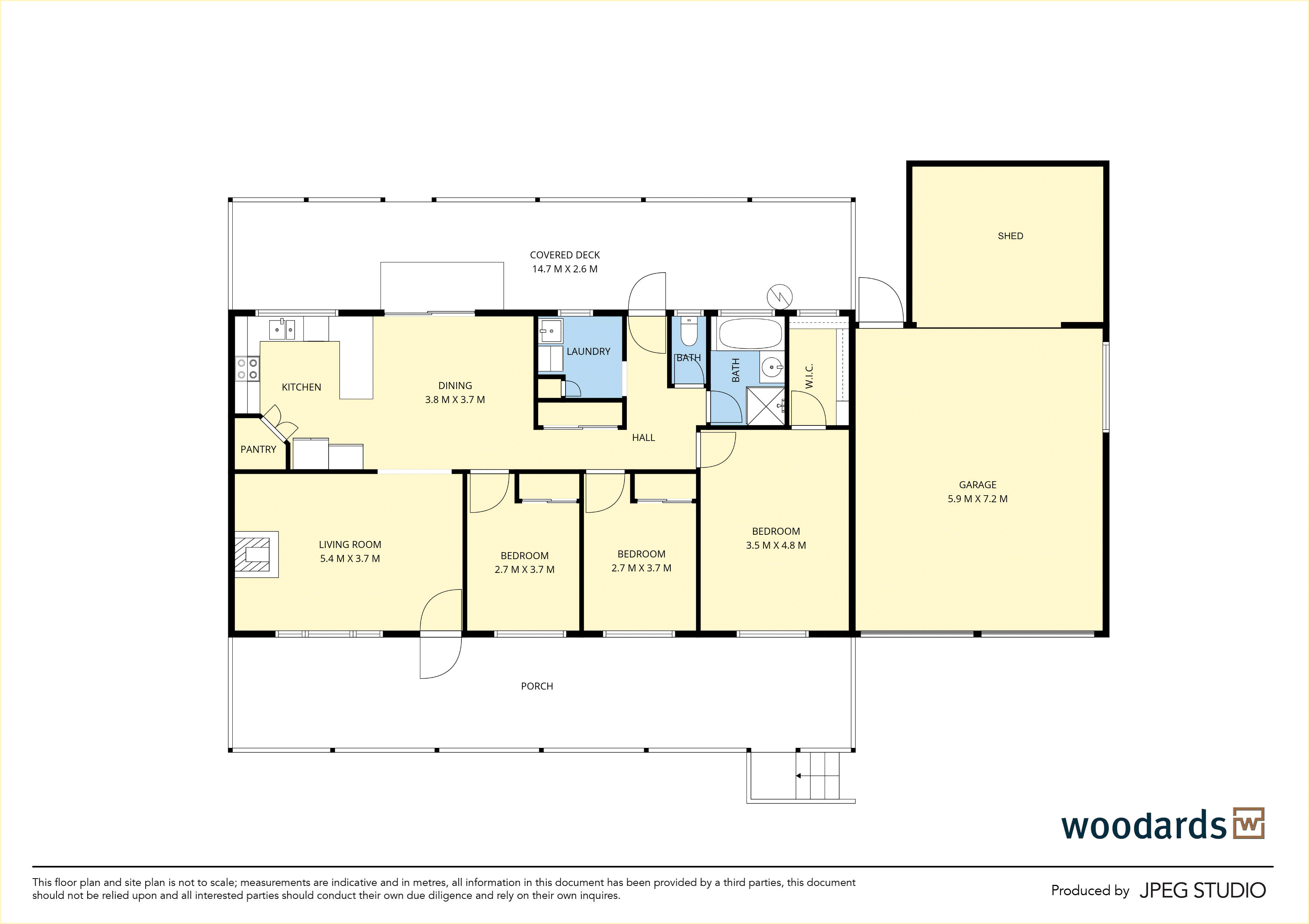 Accommodation includes three bedrooms, two with built-in robes and a main with walk-in robe and shelving. The central bathroom offers a bath, shower, vanity with storage and a separate toilet, while the laundry incorporates a linen cupboard. A large double sliding-door cupboard enhances practical storage.