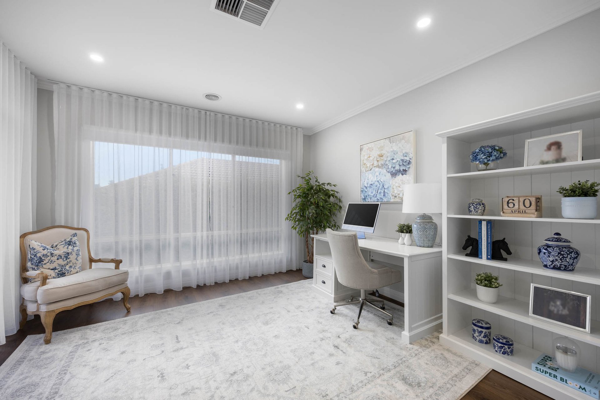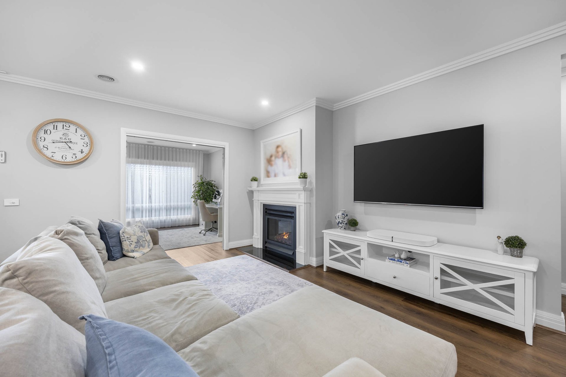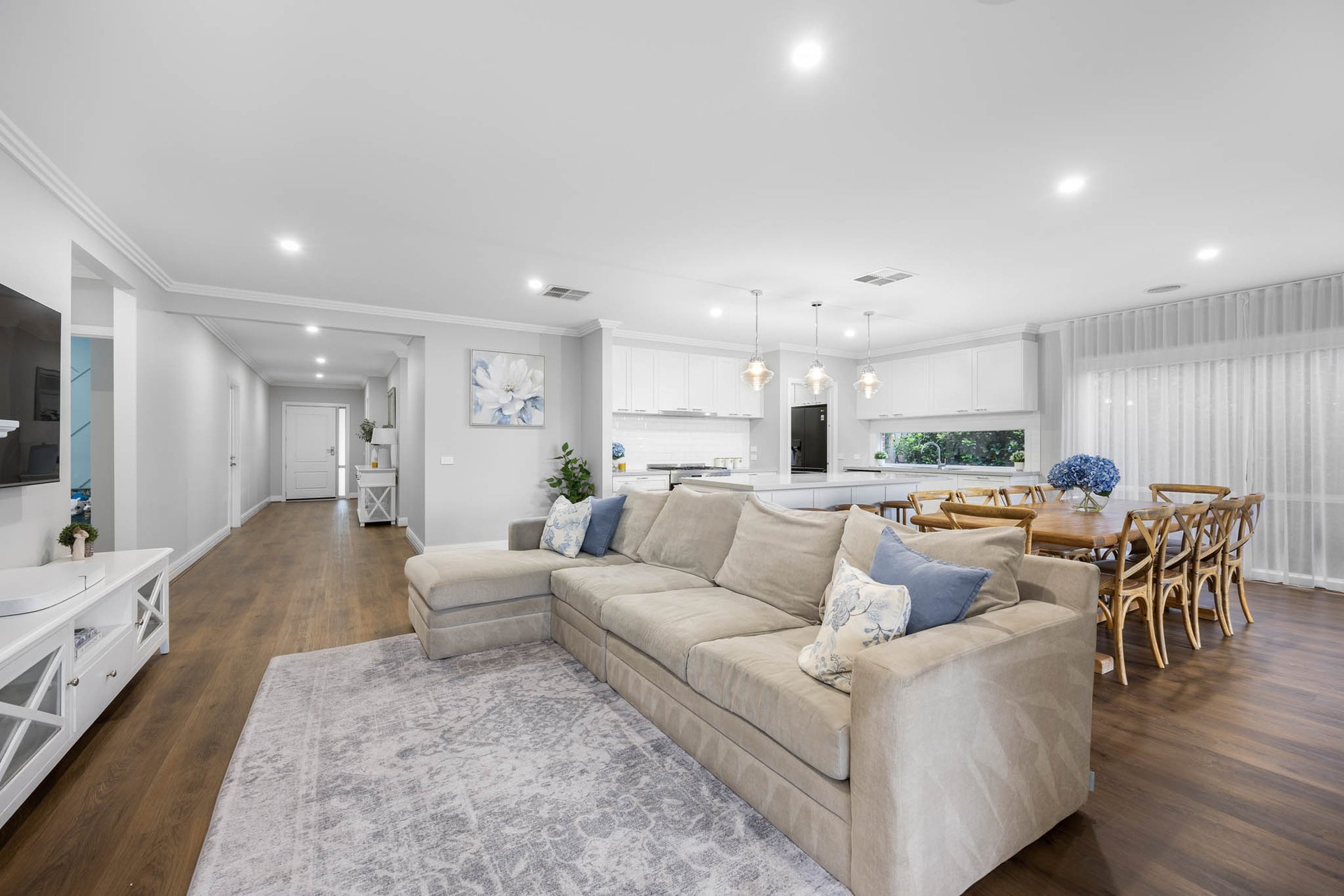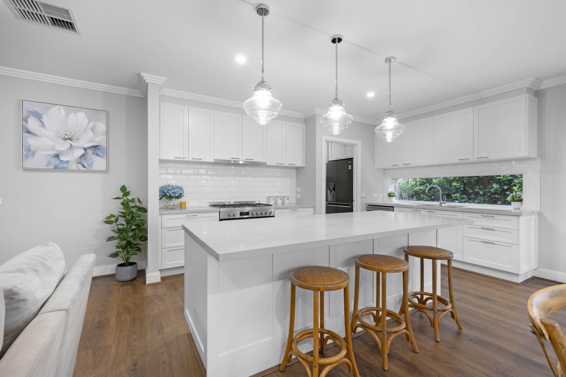 Instantly captivating with its combination of crisp white and soft greys to the façade framed by Buxus and roses, the home opens to interiors that exude classic elegance, brought by high ceilings with trio cornices and wide-plank timber-look flooring underfoot.