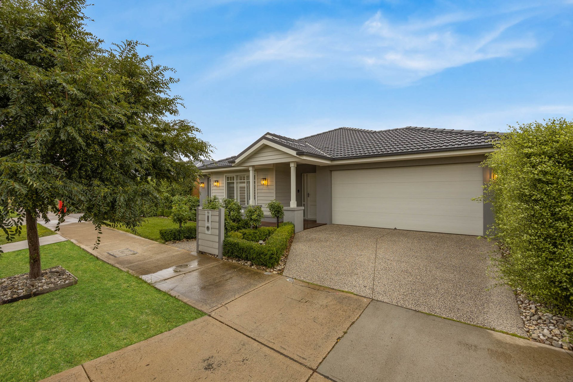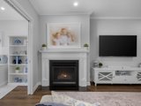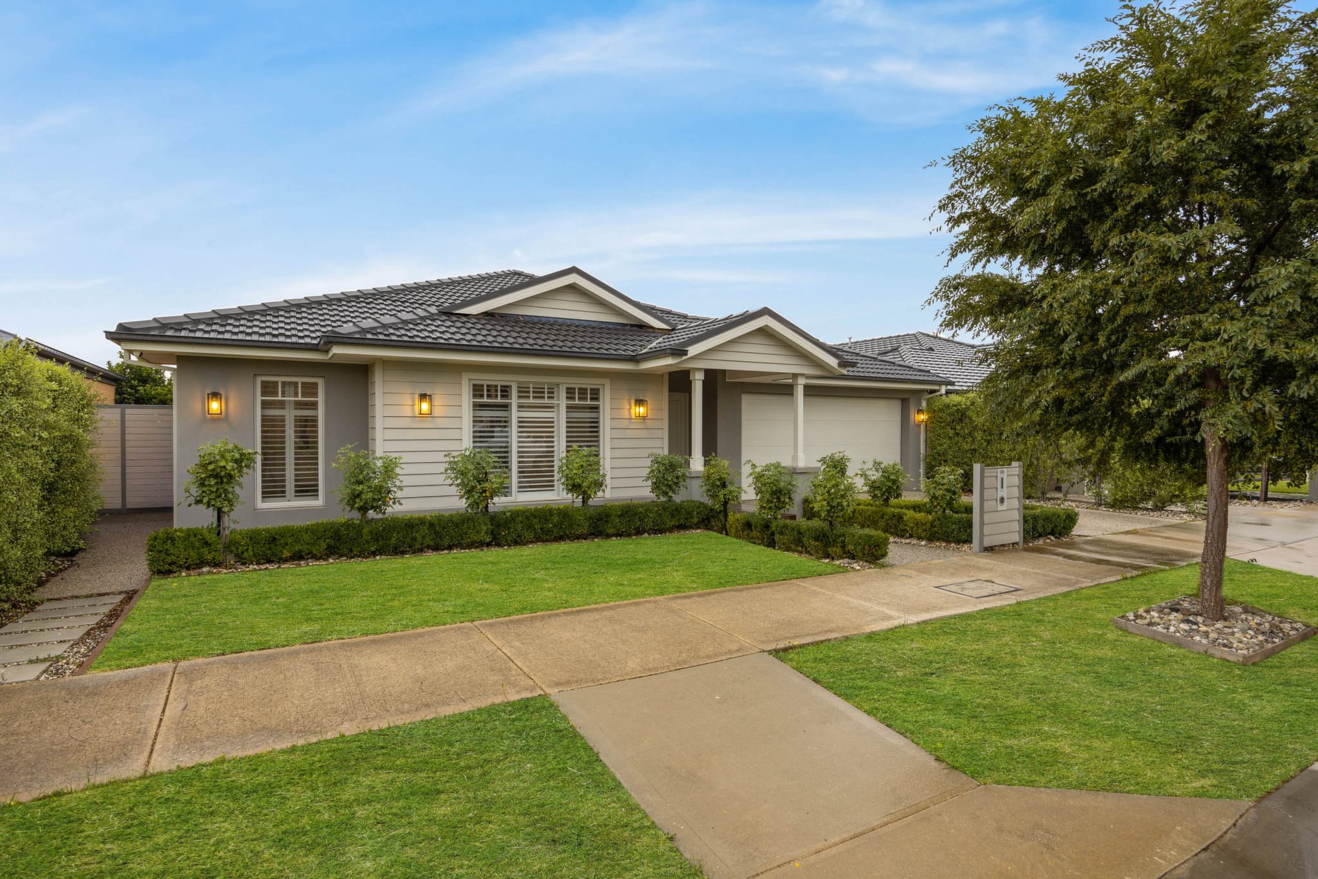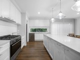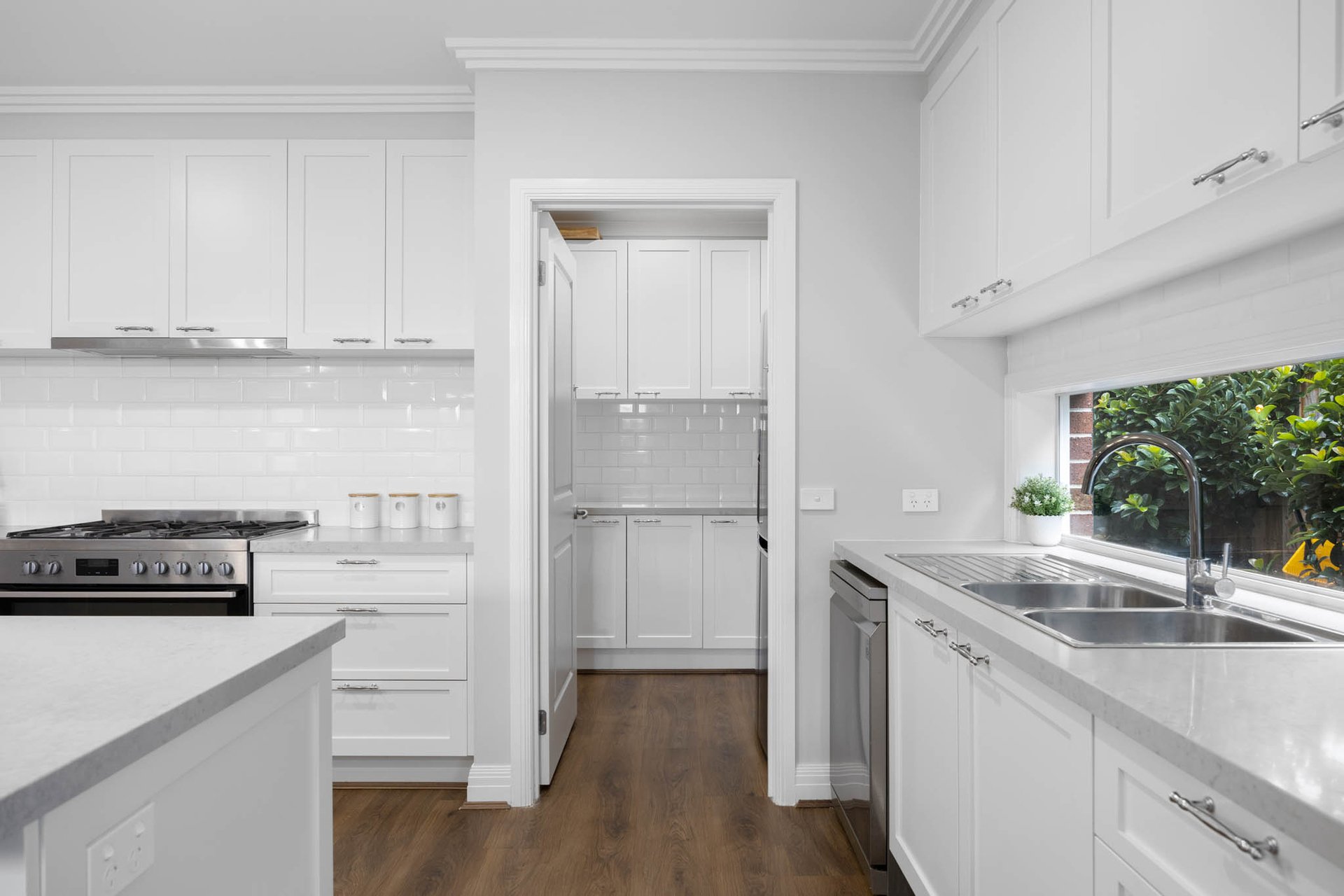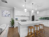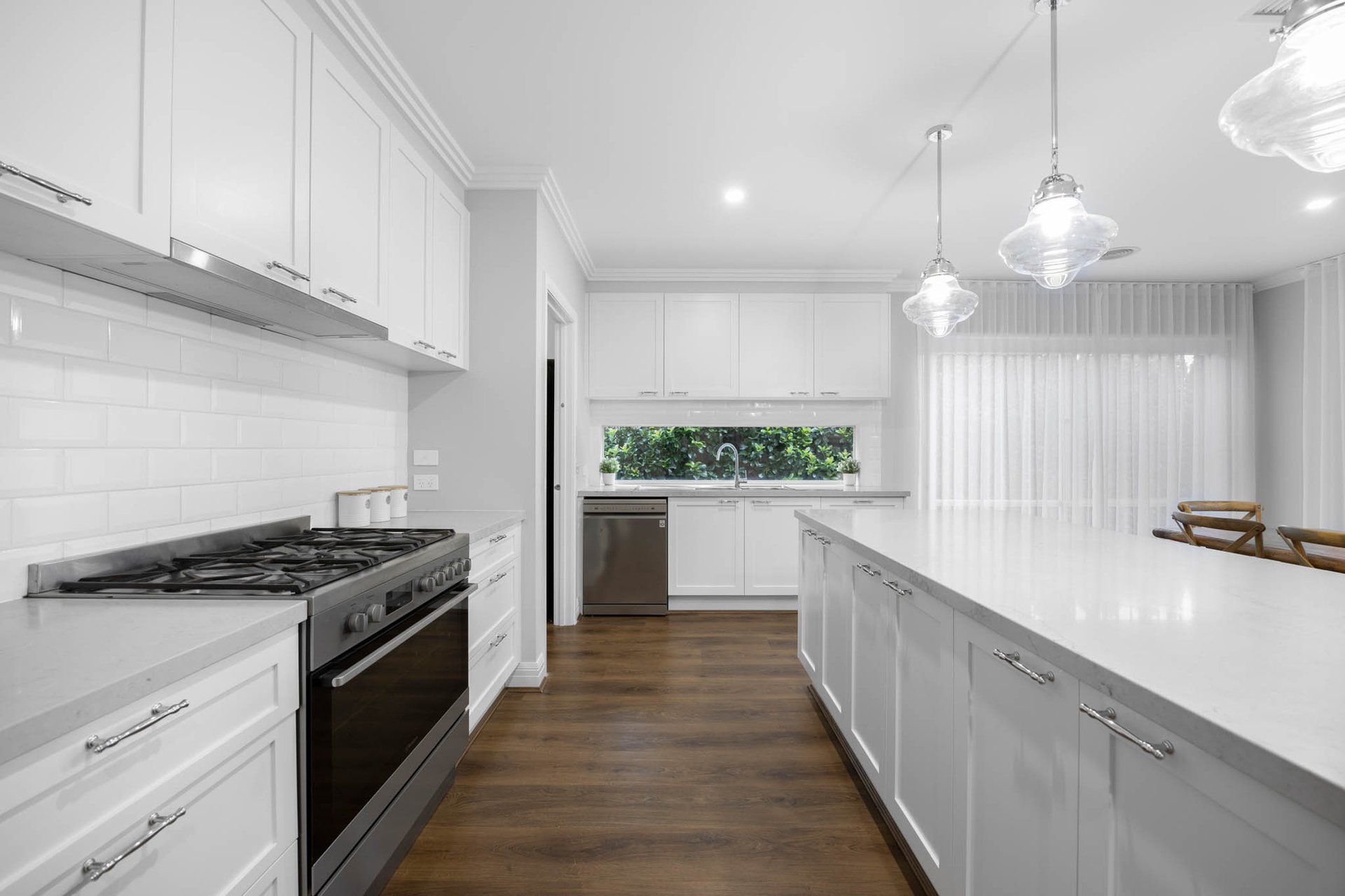 Instantly captivating with its combination of crisp white and soft greys to the façade framed by Buxus and roses, the home opens to interiors that exude classic elegance, brought by high ceilings with trio cornices and wide-plank timber-look flooring underfoot.
