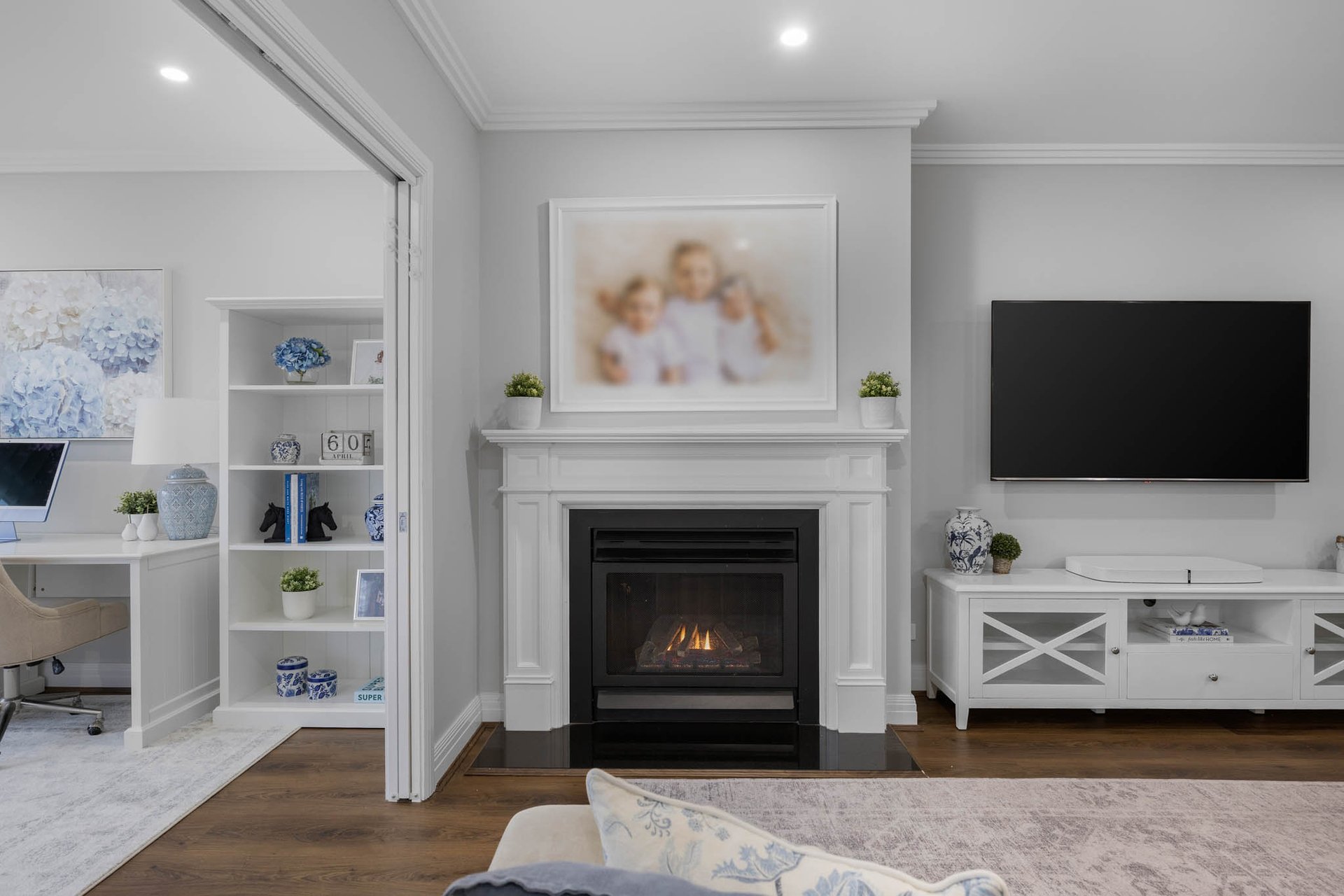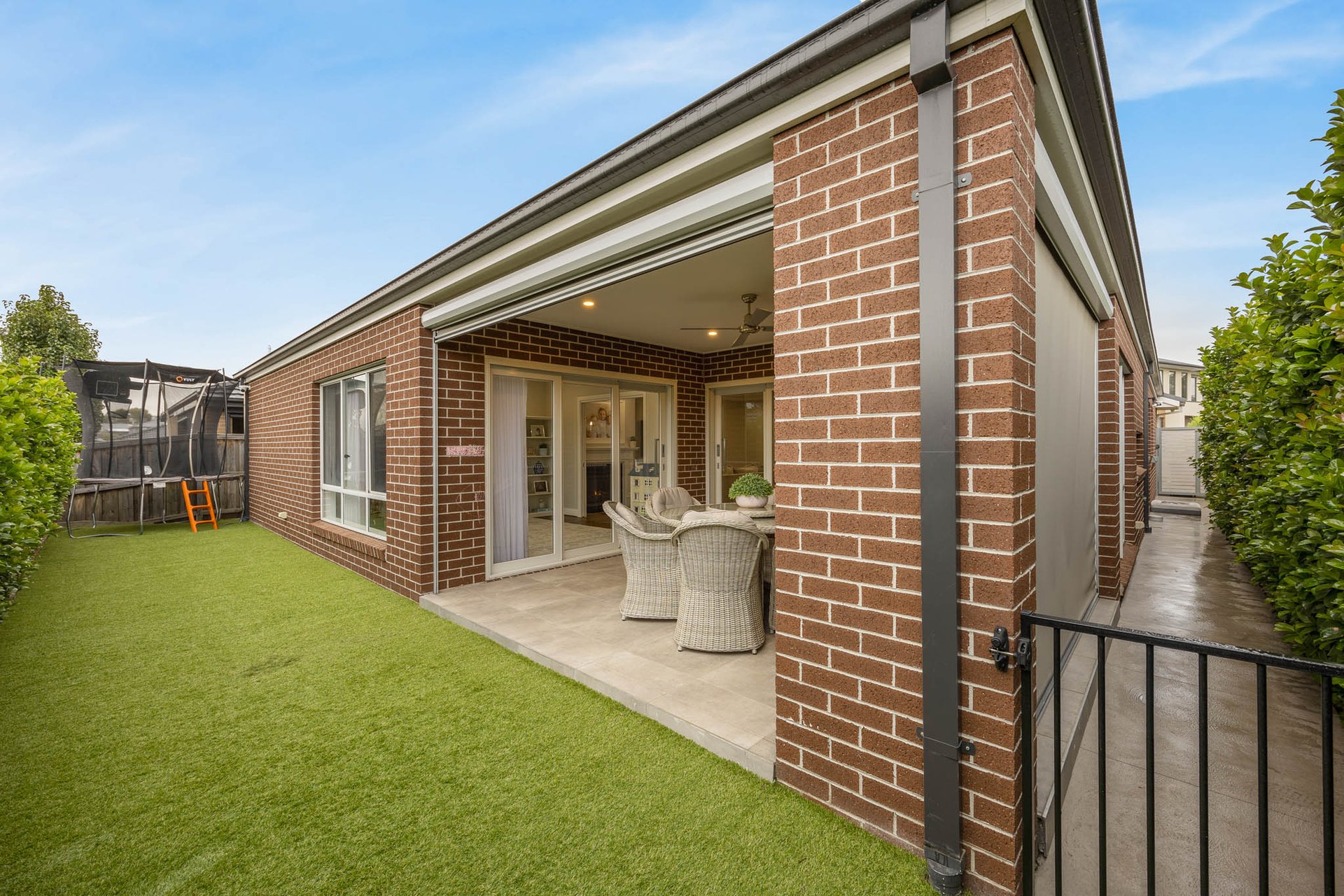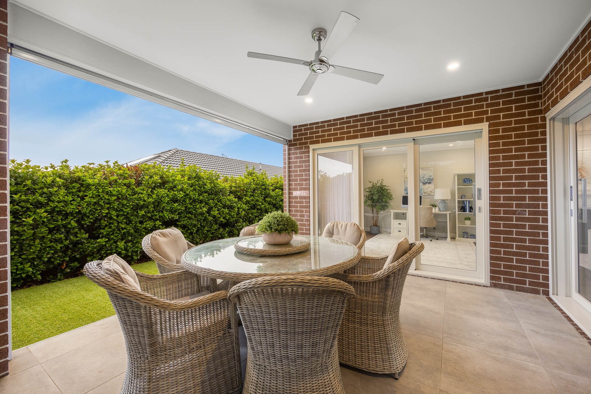 Open meals and family living zones extend from this hub, with the family room warmed by a gas log fireplace with ornate mantle, while a separate multipurpose room offers flexibility as a lounge, study, or home office. Outdoor living continues with a generous alfresco fitted with automated bistro blinds and an exterior fan, overlooking an astro-turf rear yard bordered by a lush privacy hedge.