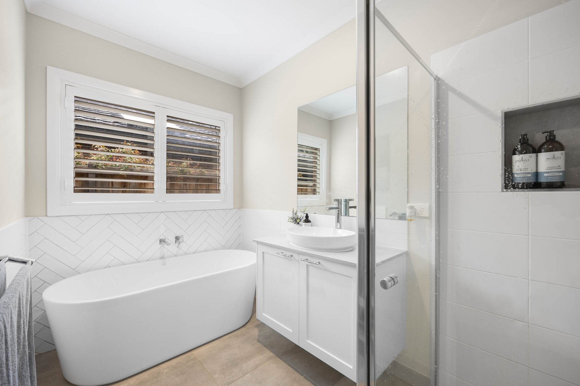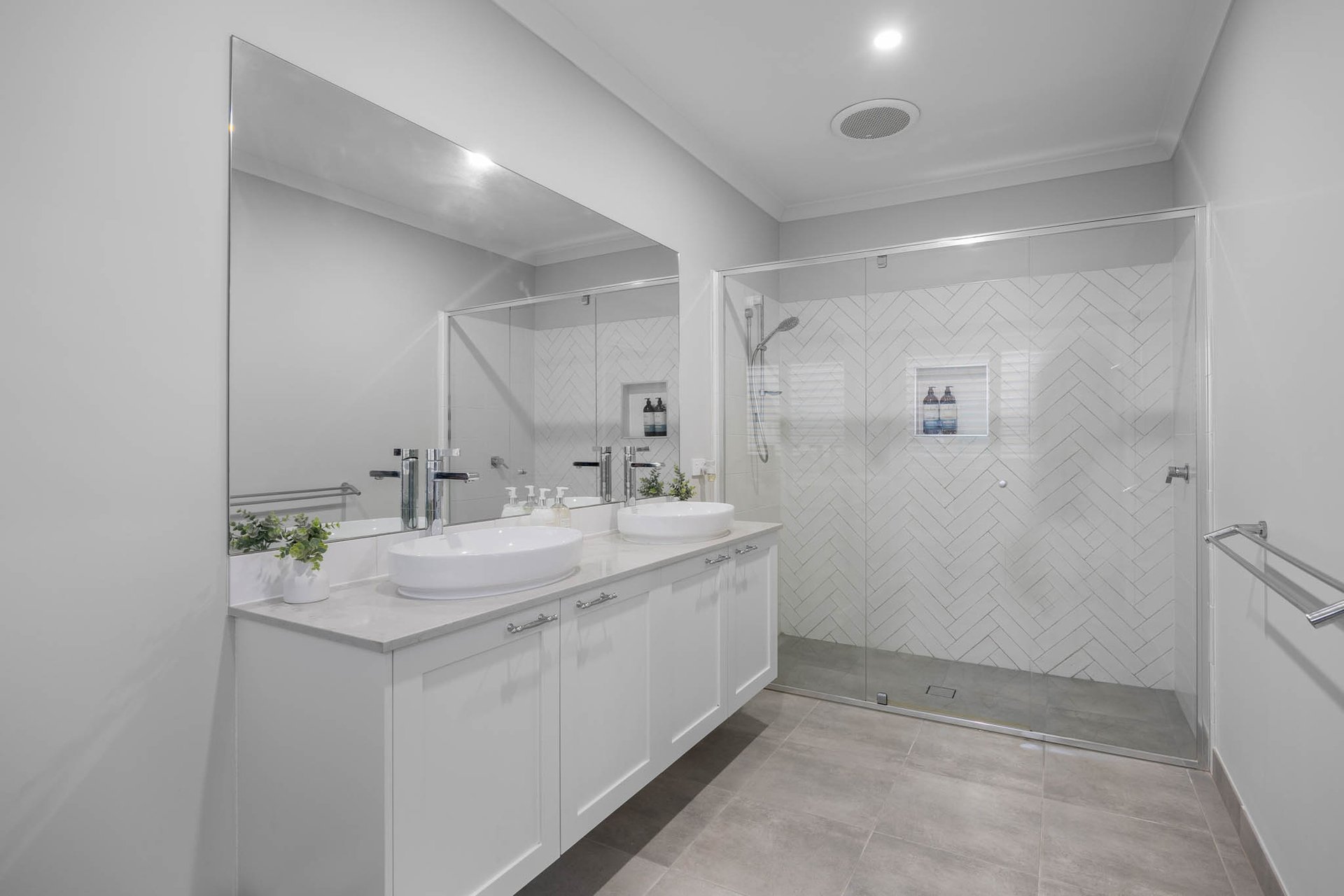 Accommodation is thoughtfully zoned, with a main bedroom positioned to the front of the home featuring dual fitted walk-in robes and a hotel-style ensuite appointed with a twin stone vanity and a herringbone-tiled oversized niched shower. The remaining 3 bedrooms occupy a separate wing, each with built-in robes and serviced by a main bathroom with stone vanity, niched shower, and bath.