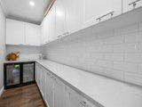 At its heart, a stunning Hamptons kitchen presents 40mm marbled stone surfaces, including a substantial island with bar seating positioned beneath a trio of pendant lights. Soft-close cabinetry and drawers are complemented by a 900mm-wide Westinghouse upright oven with 5-hob cooktop, an LG dishwasher, and a custom butler’s-style pantry with drinks fridge.