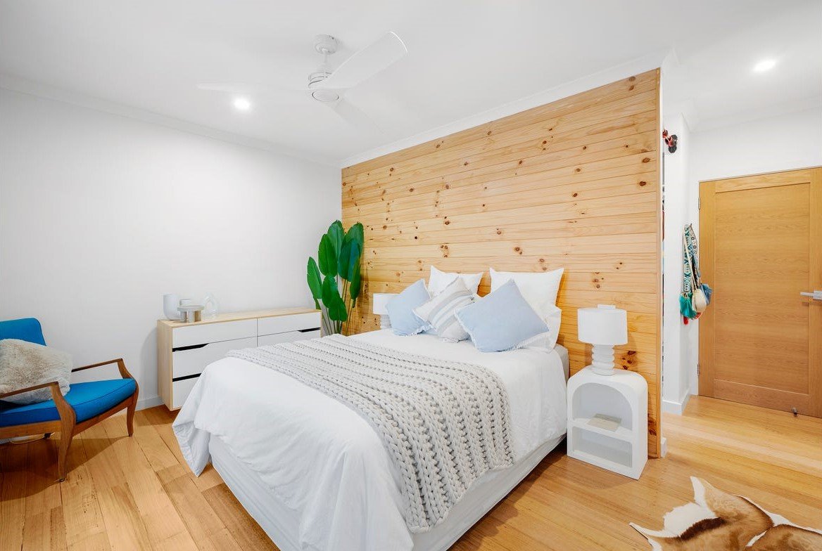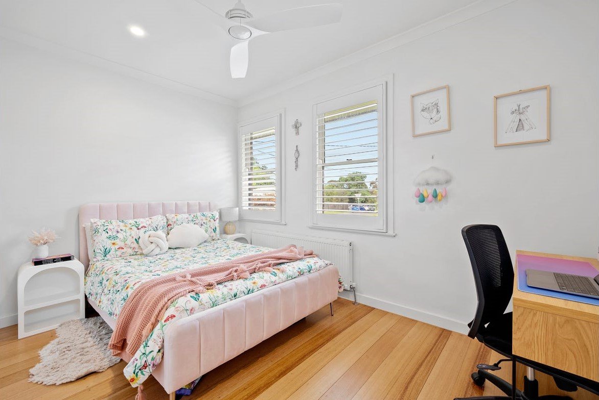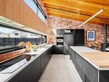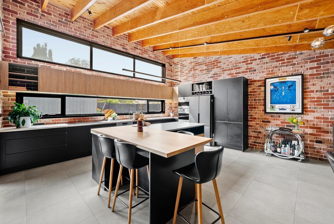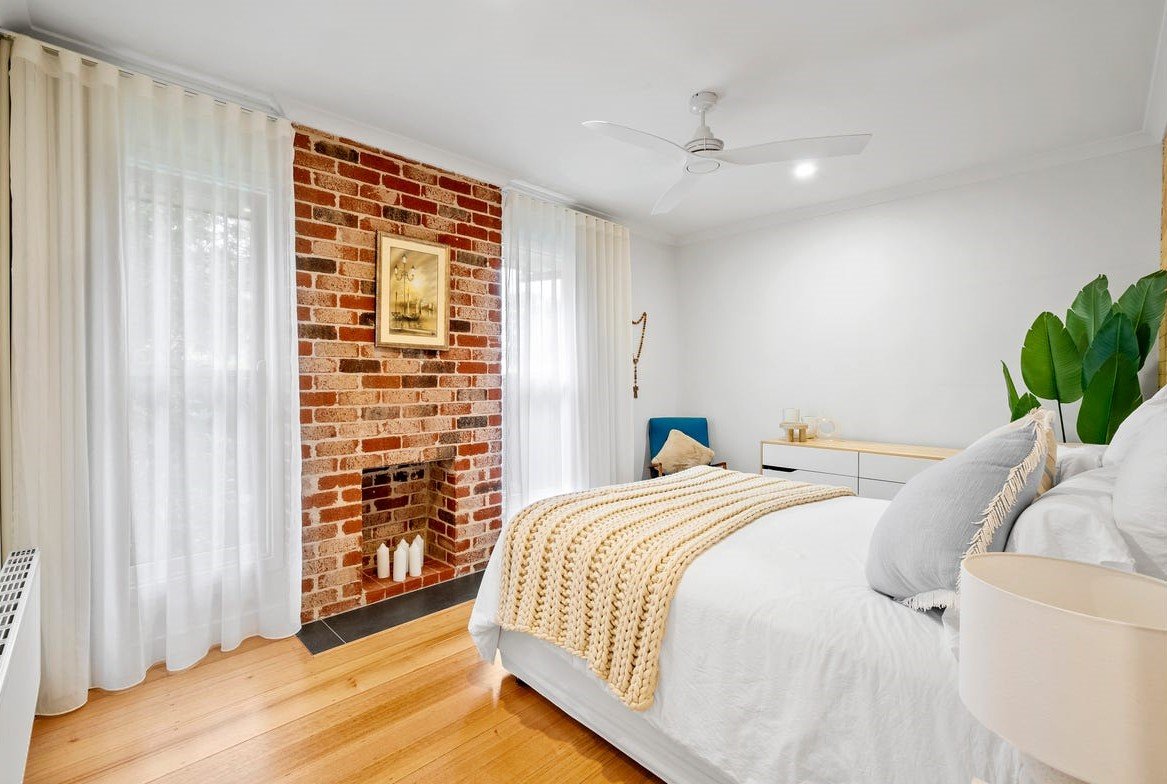 The heart of the home is the expansive open-plan living and dining domain, where soaring timber-lined ceilings and exposed brickwork create striking architectural impact. Large windows flood the space with natural light, while a wood fireplace forms a beautiful focal point and adds warmth through the cooler months. The gourmet kitchen is finished to an exceptional standard, showcasing stone benchtops, quality appliances, extensive cabinetry and an oversized island bench designed for both everyday living and effortless entertaining. A refrigerator is included, adding further convenience to an already impressive space. Accommodation is equally impressive, with light-filled bedrooms featuring polished timber floors, plantation shutters and ceiling fans, creating spaces that are both refined and functional. The luxurious central bathroom would not look out of place in a designer magazine, complete with a freestanding bath, a walk-in shower with matte black fittings, a floating timber vanity and premium fixtures throughout. A washing machine is also included, making the home move-in ready from day one.