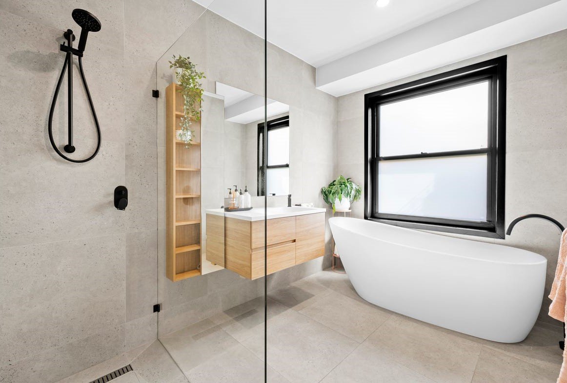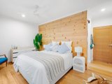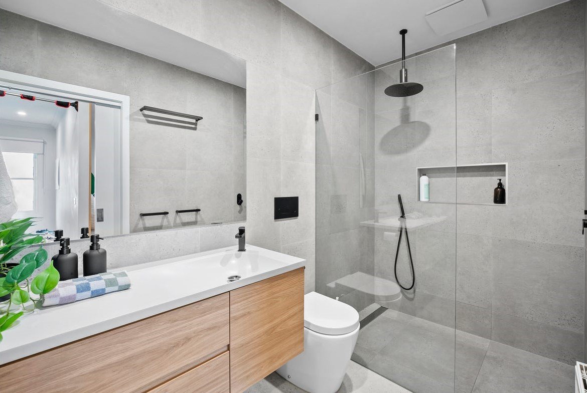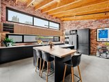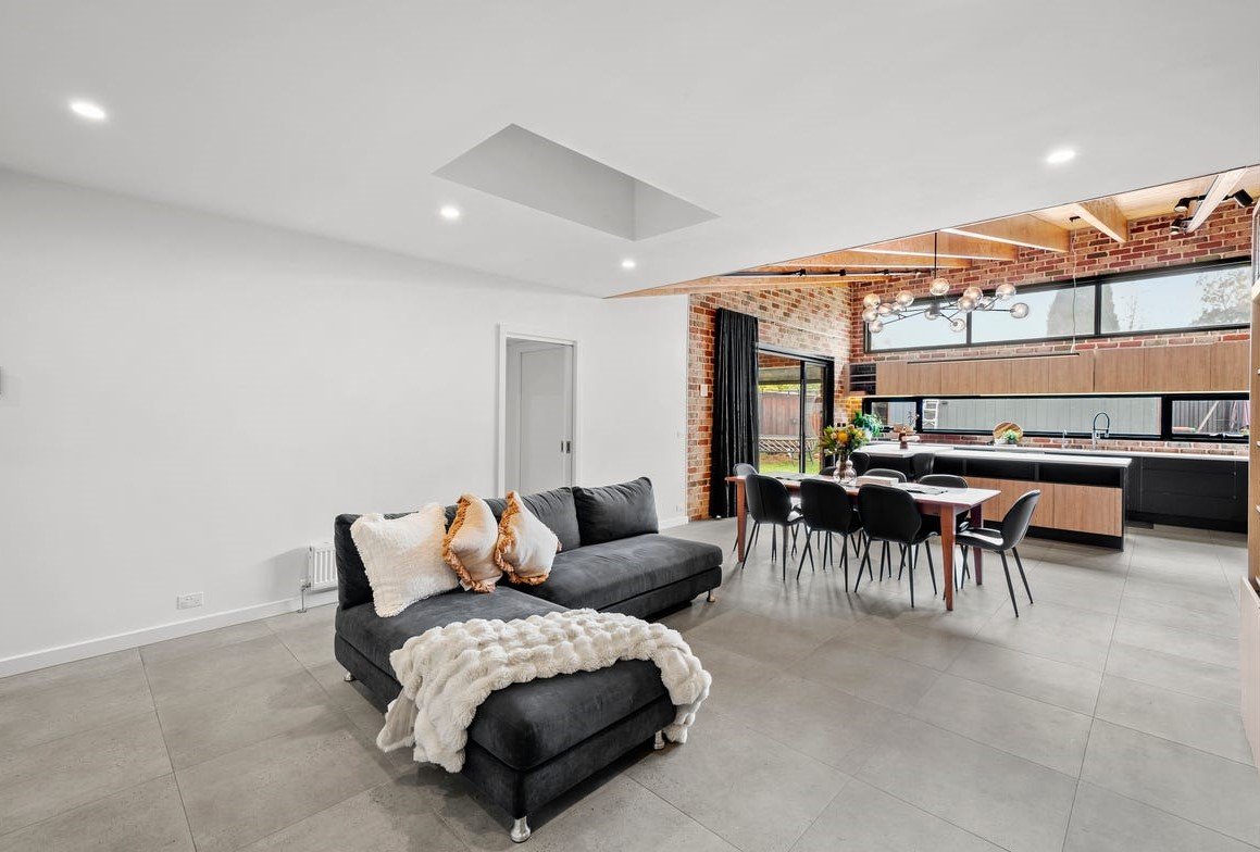 The heart of the home is the expansive open-plan living and dining domain, where soaring timber-lined ceilings and exposed brickwork create striking architectural impact. Large windows flood the space with natural light, while a wood fireplace forms a beautiful focal point and adds warmth through the cooler months. The gourmet kitchen is finished to an exceptional standard, showcasing stone benchtops, quality appliances, extensive cabinetry and an oversized island bench designed for both everyday living and effortless entertaining. A refrigerator is included, adding further convenience to an already impressive space. Accommodation is equally impressive, with light-filled bedrooms featuring polished timber floors, plantation shutters and ceiling fans, creating spaces that are both refined and functional. The luxurious central bathroom would not look out of place in a designer magazine, complete with a freestanding bath, a walk-in shower with matte black fittings, a floating timber vanity and premium fixtures throughout. A washing machine is also included, making the home move-in ready from day one.