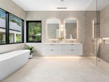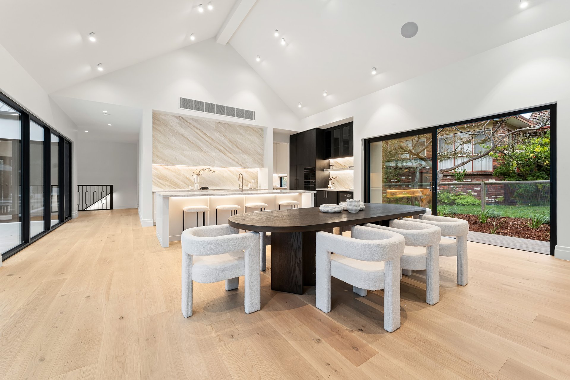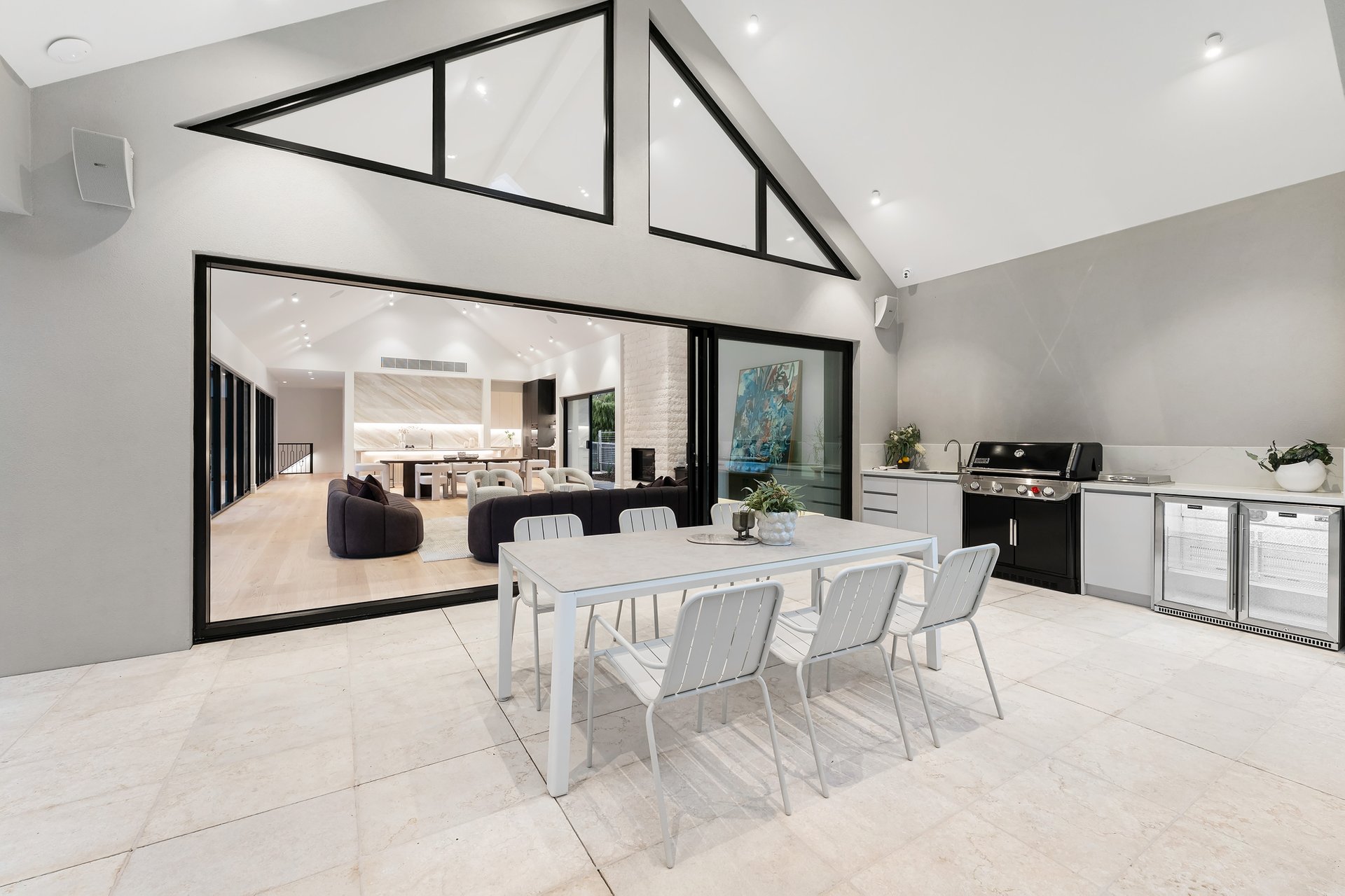 Outdoors, a resort-style alfresco is fully equipped with an outdoor BBQ and fridge, overlooking the swimming pool and creating a private sanctuary for year-round entertaining. A Sonos sound system throughout the home enhances both indoor and outdoor living, while the expansive landscaped allotment adds to the sense of privacy and tranquillity.