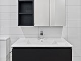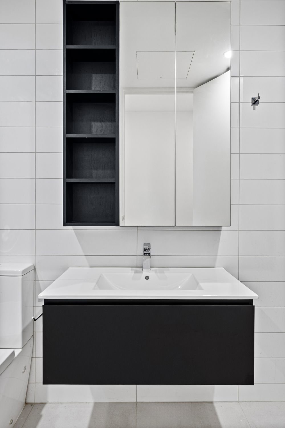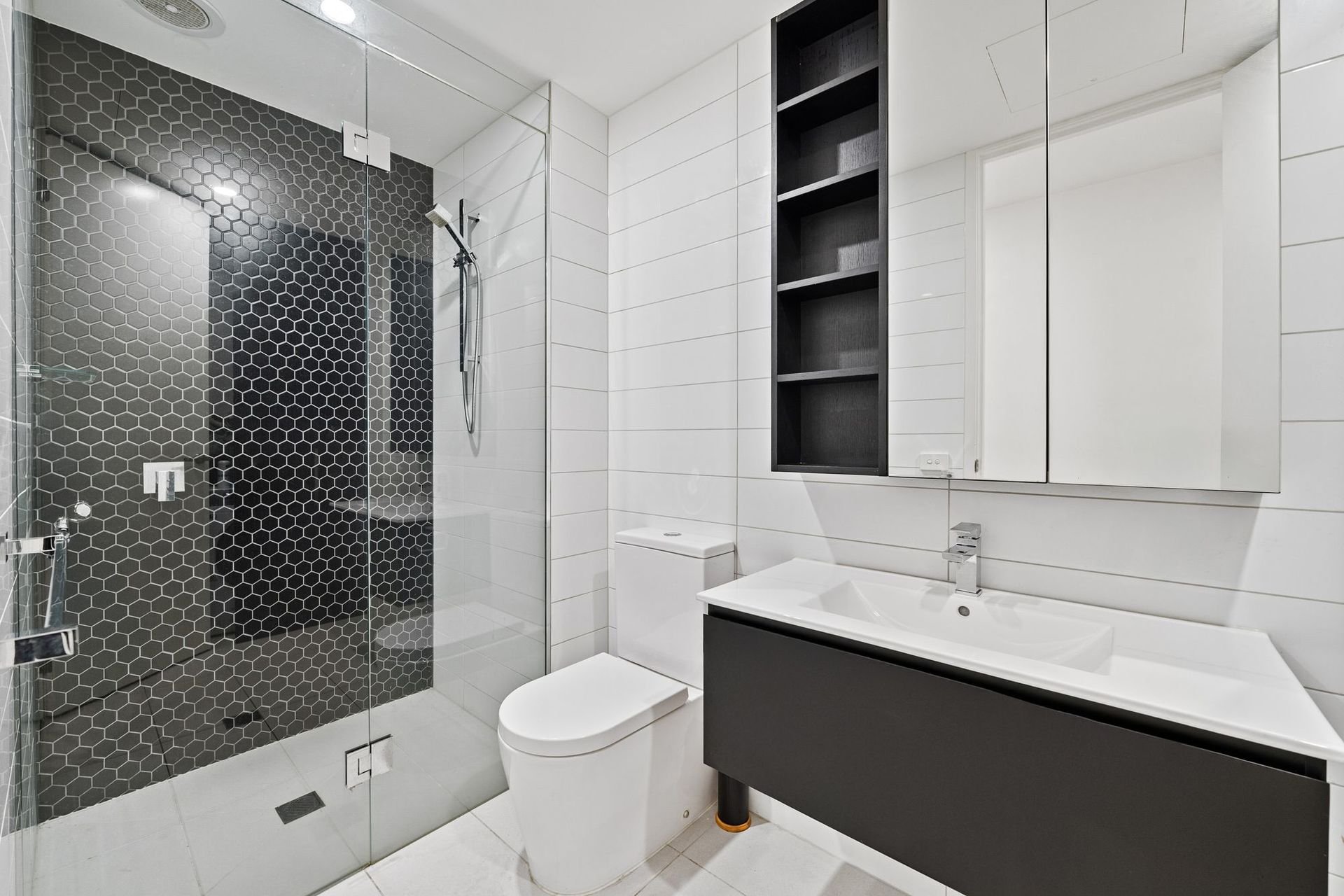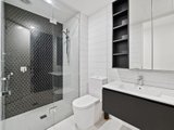 Both bedrooms are generous in size and include mirrored built-in robes, while the central bathroom offers a sophisticated design with floor-to-ceiling tiles, black feature shelving and a walk-in rainfall shower. The European laundry is neatly tucked away for convenience.