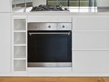 The designer kitchen is equipped with sleek cabinetry, mirrored splashback, gas cooktop and premium appliances including an integrated dishwasher and microwave. There's ample bench space for meal prep and casual dining.