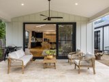 Four skylights and glazing to all sides bathe the adjoining dining and living areas in natural light, with glass sliders opening to a grand travertine alfresco entertaining area. Precision landscaped and fully fenced; the grounds are enhanced by garden lighting and rustic Corten steel edging.
