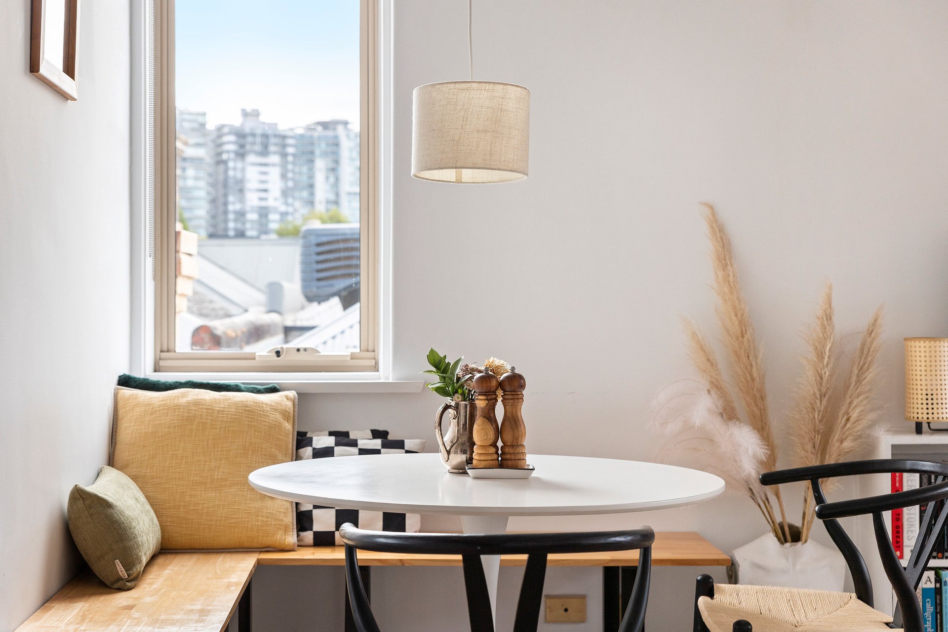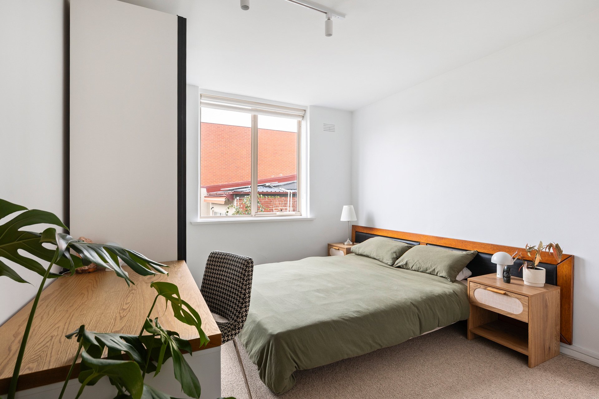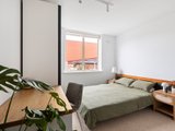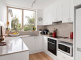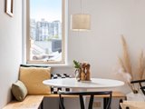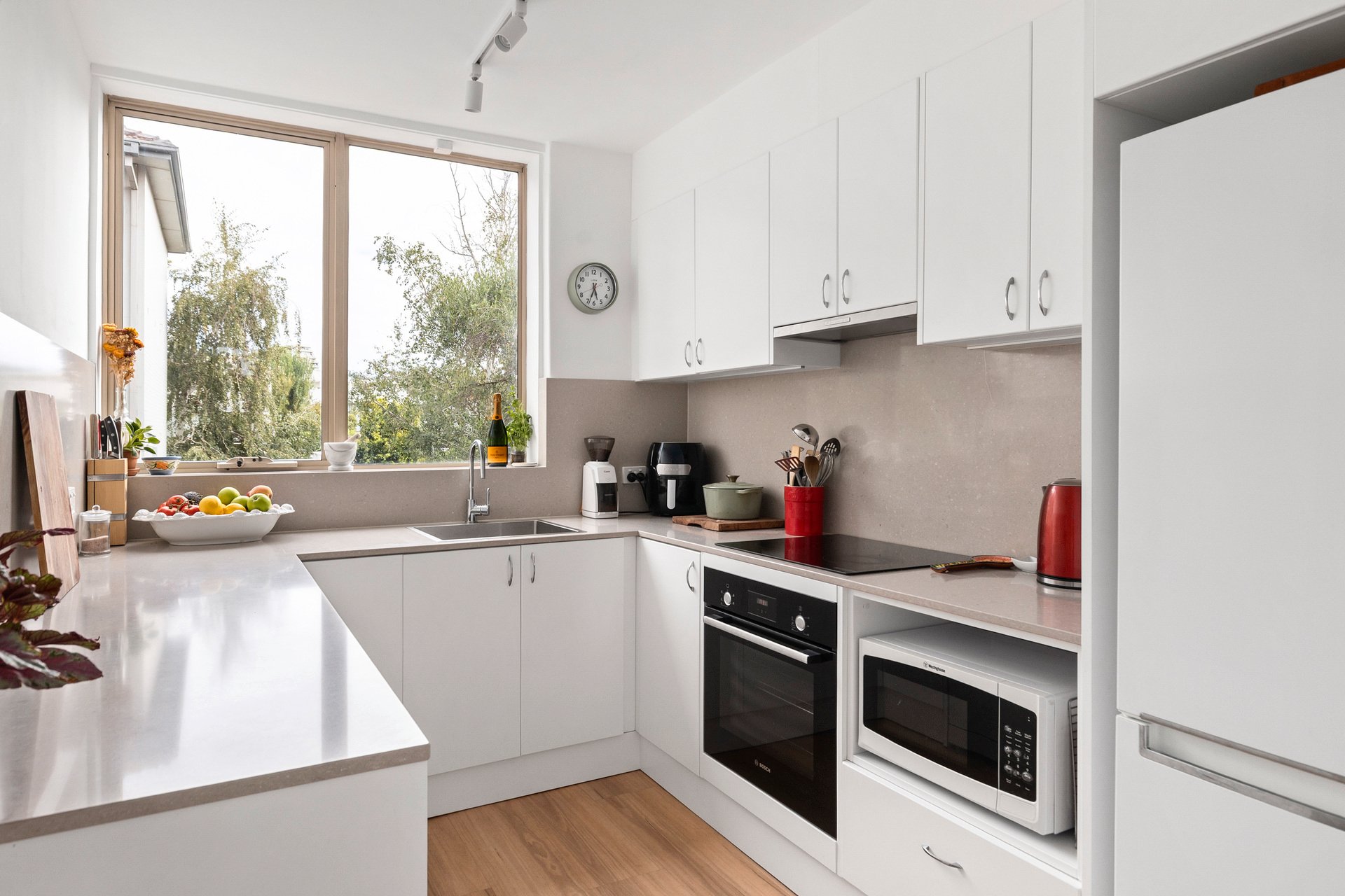 Designed to follow the sun, the residence features North-facing balcony, living area and master bedroom suite. Large-format windows on all three sides ensure every room is bathed in natural light. Framing views of the communal gardens. The heart of the home is a brand-new designer kitchen that marries form with function. Expansive Caesarstone benches and splashbacks complemented by integrated LED strip lighting. A suite of high-end applicances, including induction cooktop and a full-sized dishwasher.