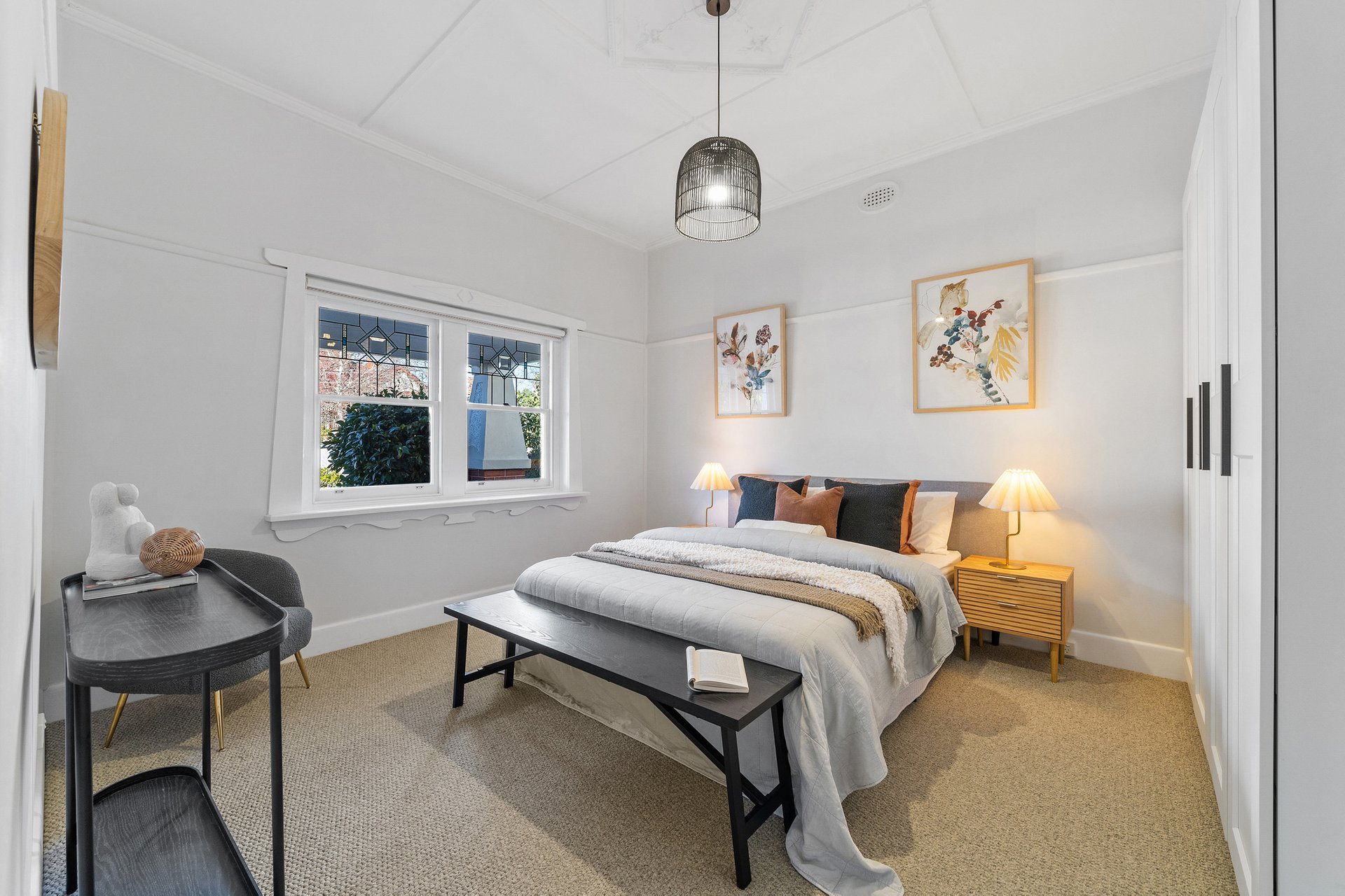 The home’s inviting façade hints at the charm within, where textured ceilings, minimalist stained-glass windows, and a decorative fireplace create a warm and welcoming atmosphere. Original features are complemented by wooden flooring throughout, while abundant windows fill the interiors with natural light.