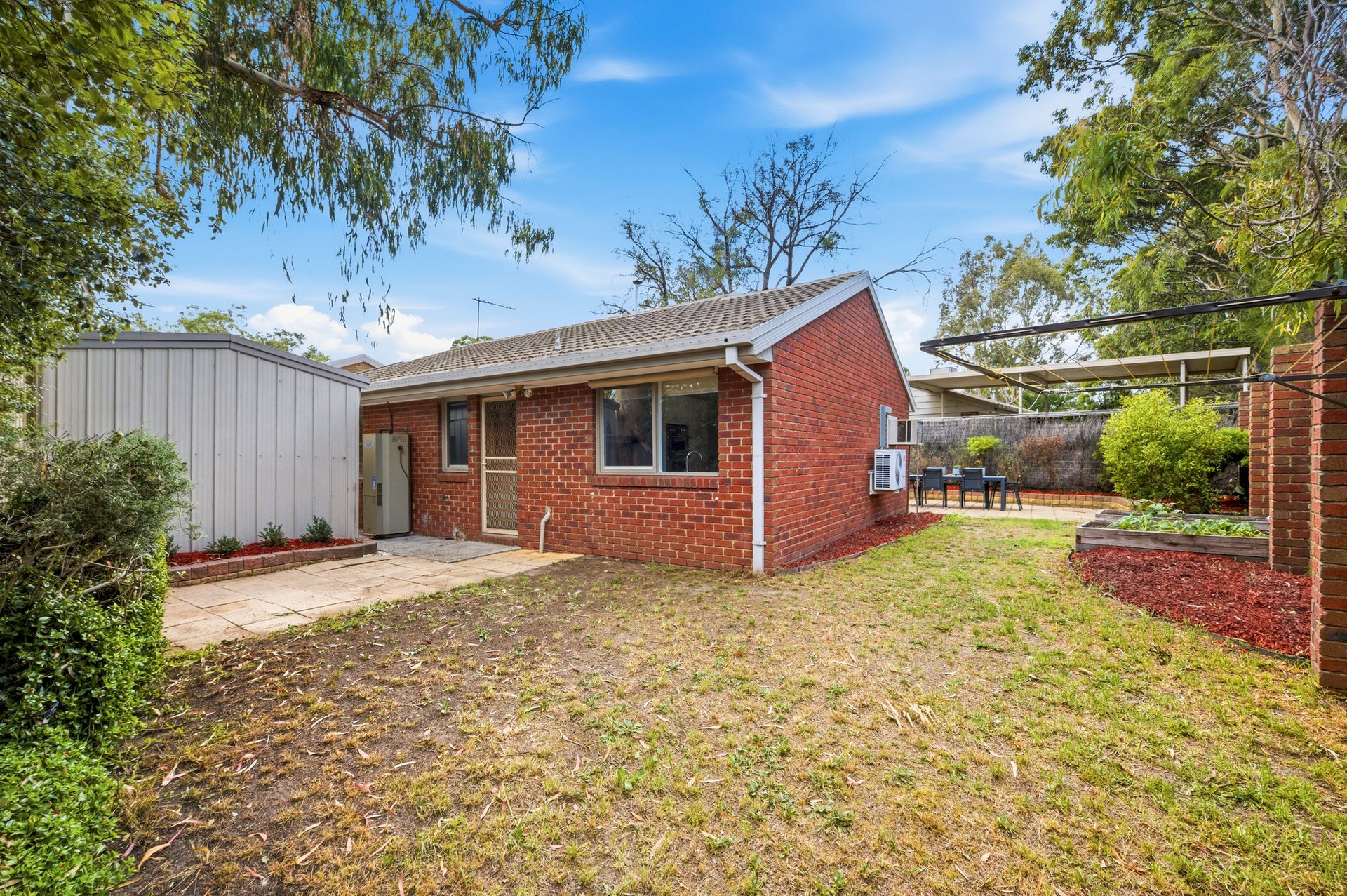 Outside the generous garden includes paved areas for bbq entertaining and a large storage shed adds valuable additional storage. There is a drive through single carport which allows on title parking for two cars. A valuable asset for two bedroom units.