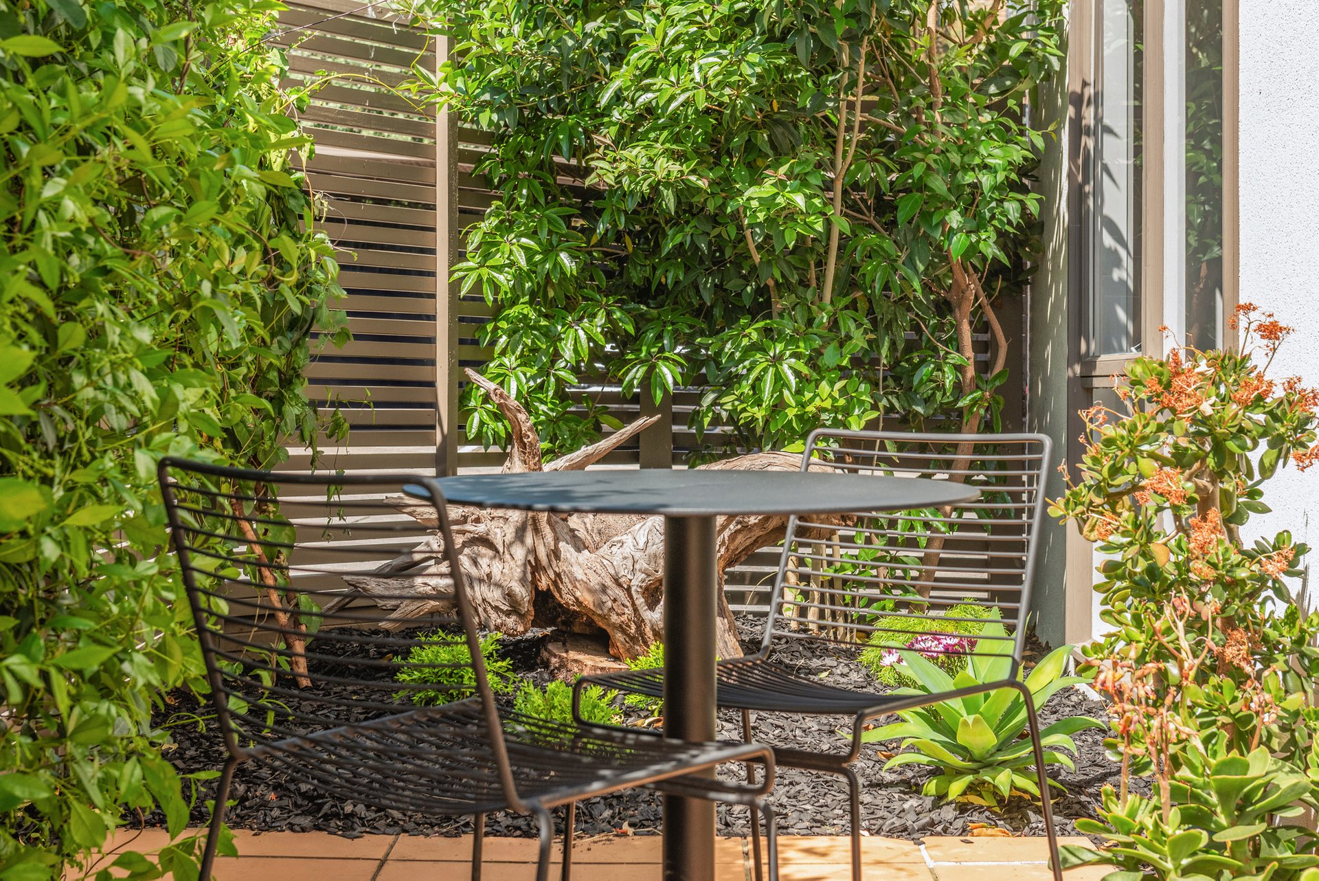 Outdoors, a private patio and landscaped courtyard offer an inviting setting for relaxing or entertaining, complemented by a covered porch and one car space.