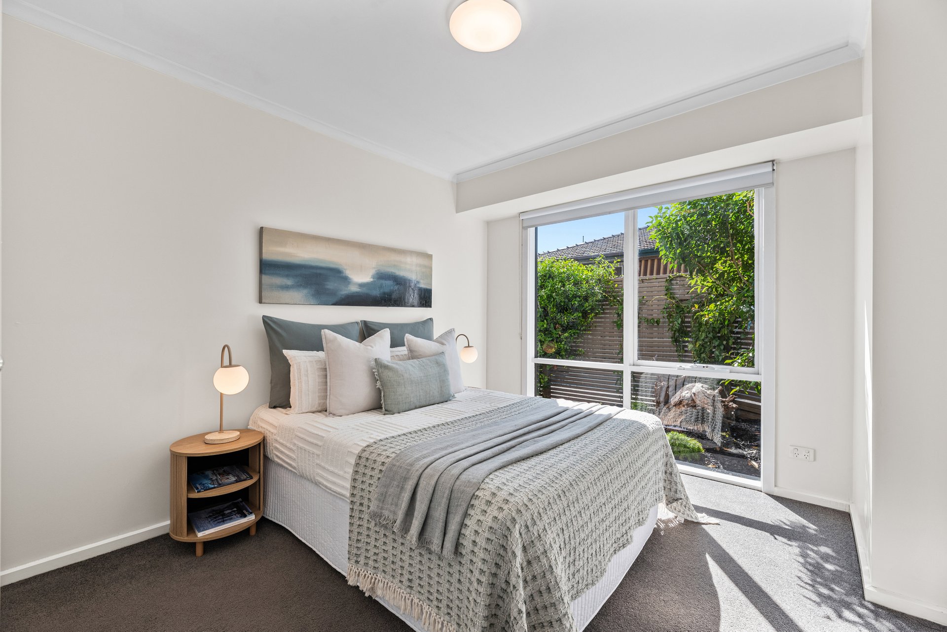 The kitchen stands out with abundant storage, a wide benchtop for casual dining, and an induction cooktop. Main bedroom with built-in robes and soft carpet, while the tiled bathroom and discreet laundry are designed for practicality. A split-system unit ensures comfort year-round.