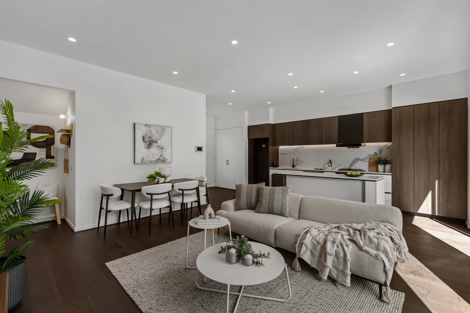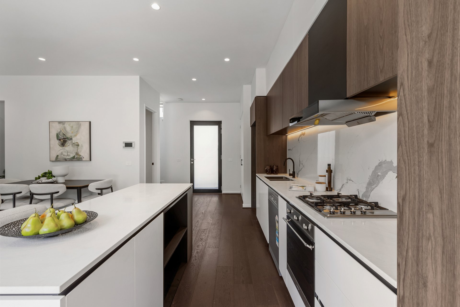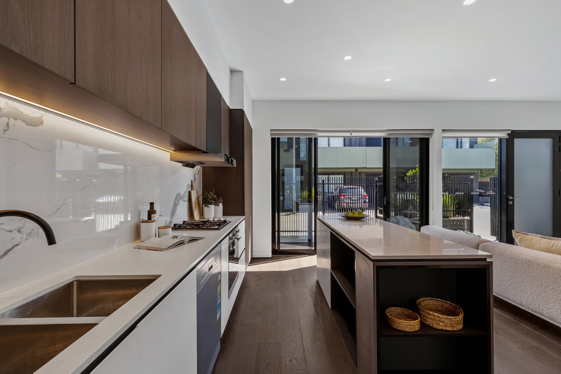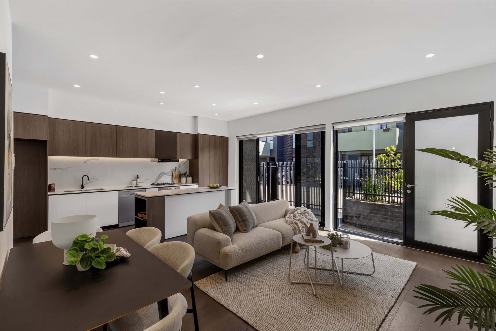 Step inside to an interior bathed in natural light, where open-plan living and dining areas flow effortlessly into a sophisticated kitchen featuring stone benchtops, premium appliances, and generous storage. Expansive windows and clean architectural lines amplify the sense of space, while the seamless indoor-outdoor connection creates a welcoming setting for both relaxed living and effortless entertaining.