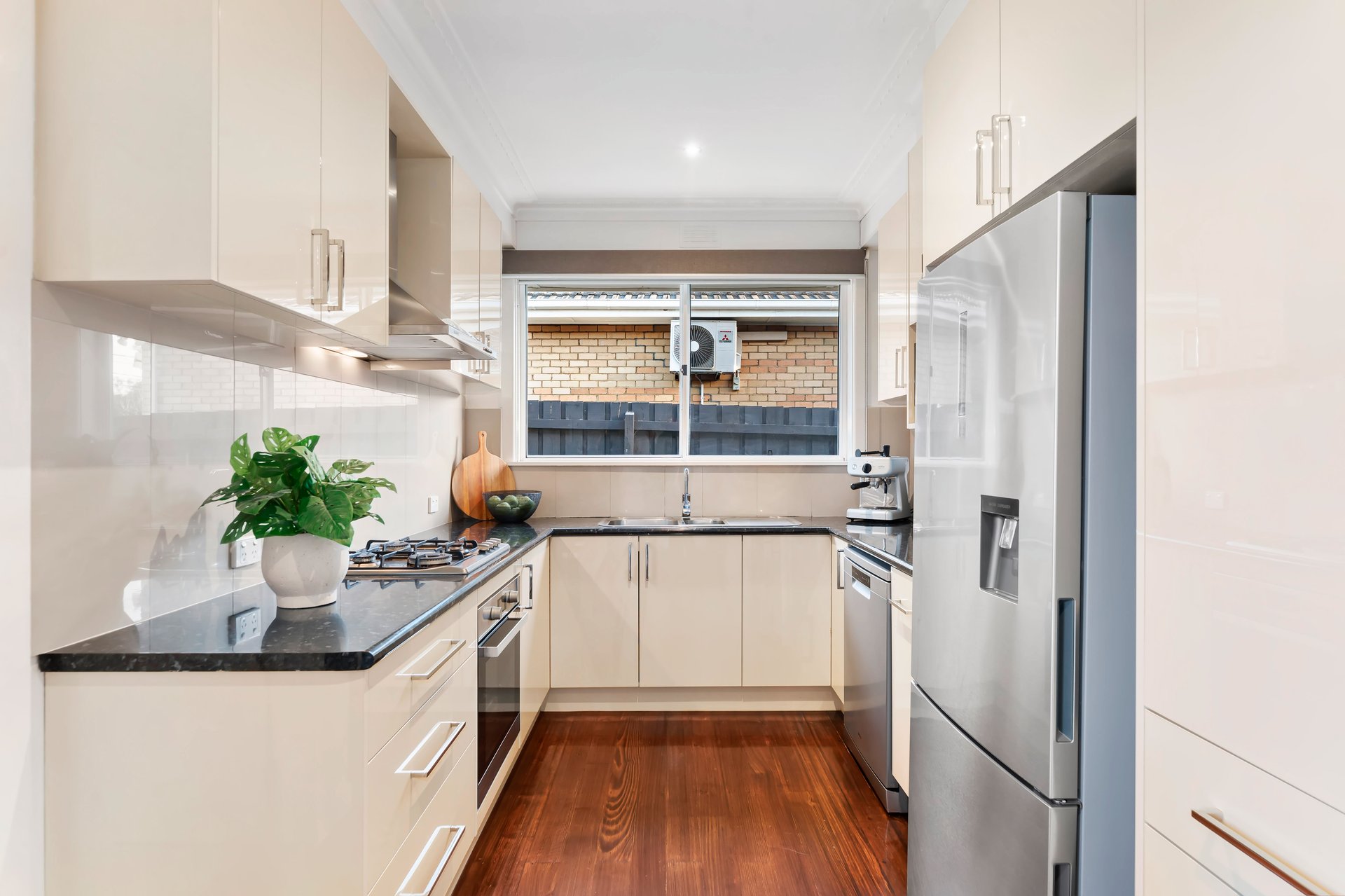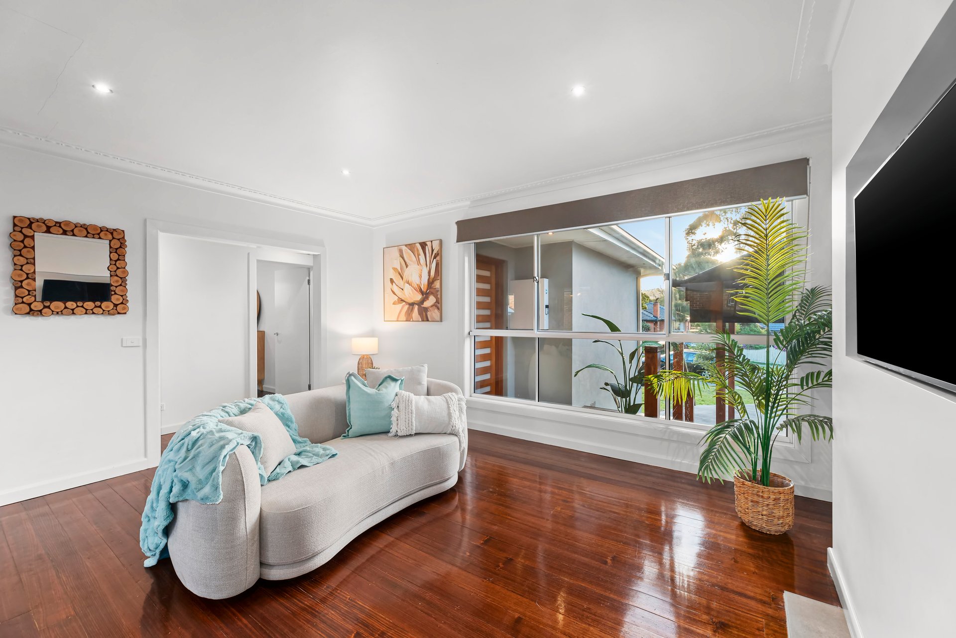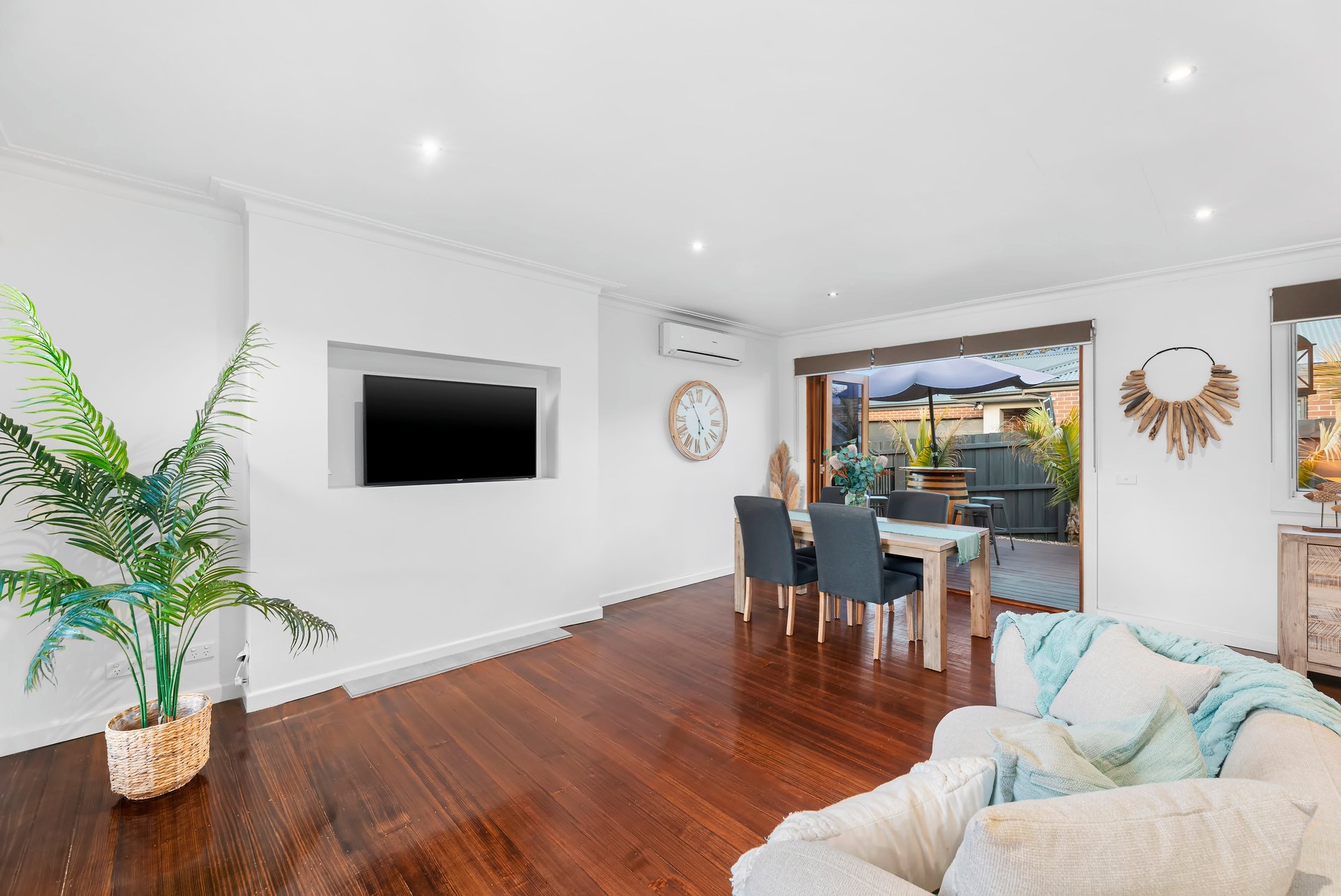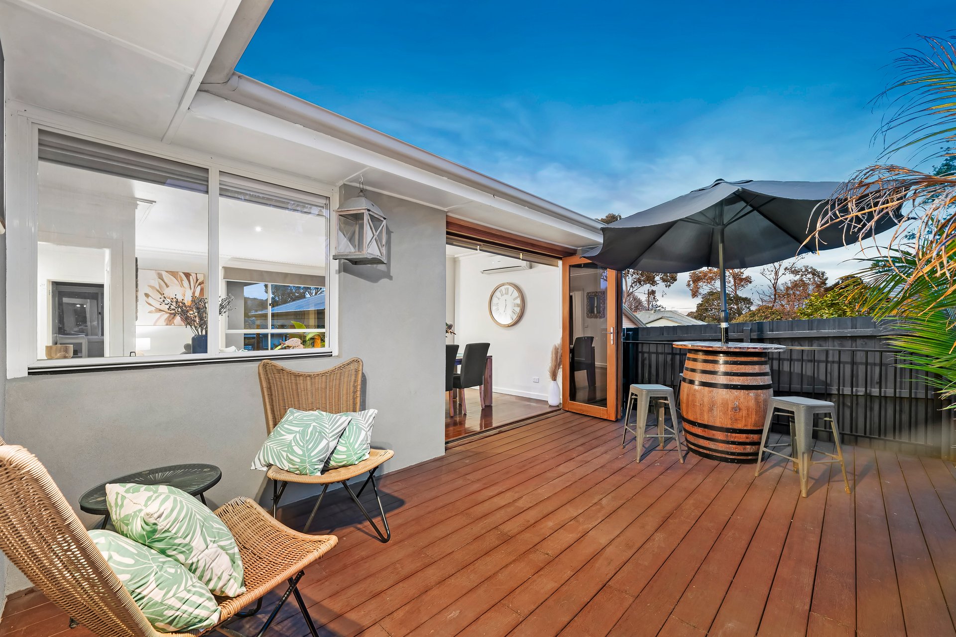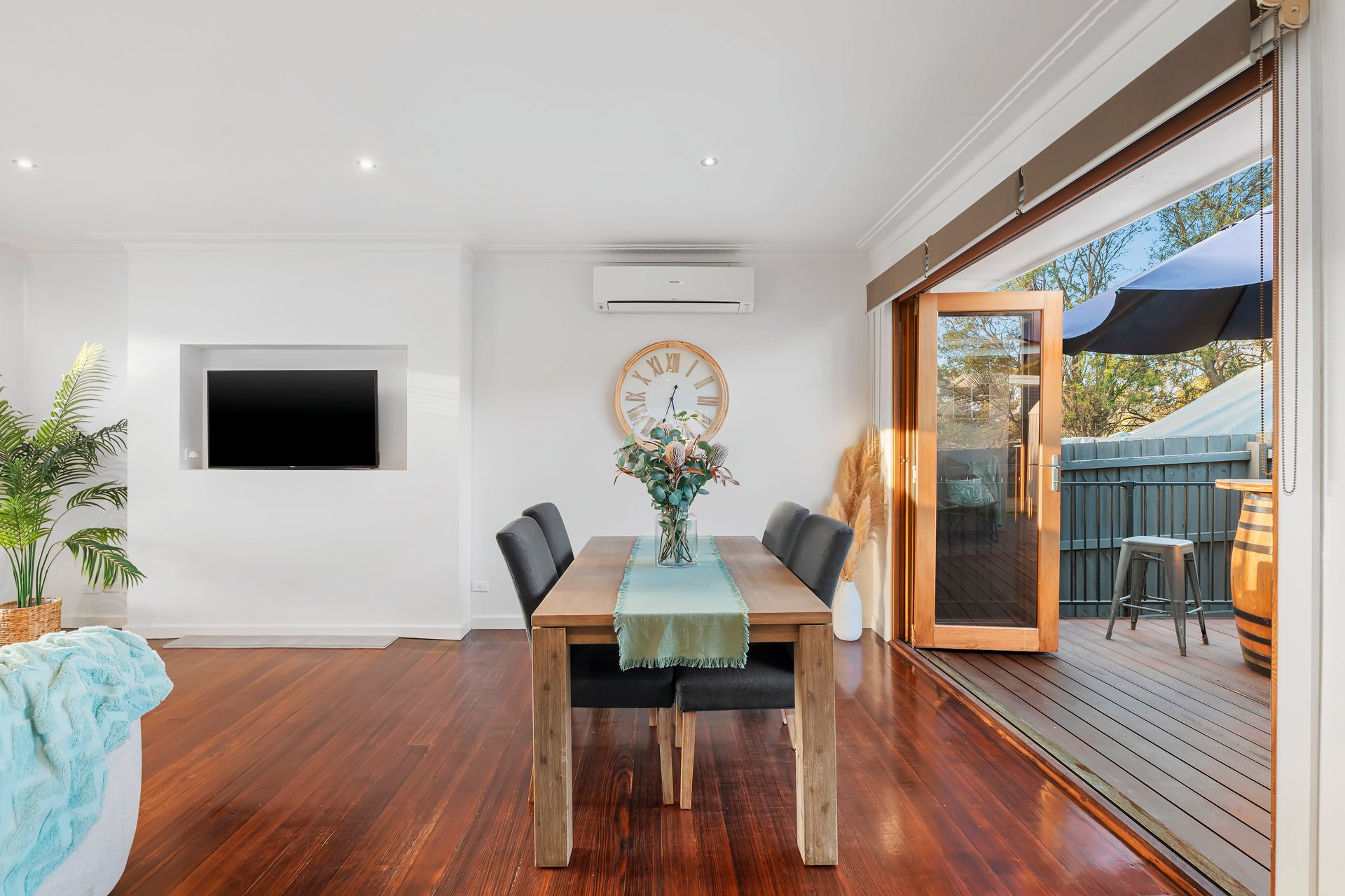 Glossy hardwood floorboards extend from the front entrance into a light-filled living and dining room, adjoined by a fully equipped kitchen with stainless steel appliances, tiled splashbacks and ample storage. Timber bi-fold doors open to create one large indoor-outdoor entertaining space, seamlessly catering to all your special occasions.