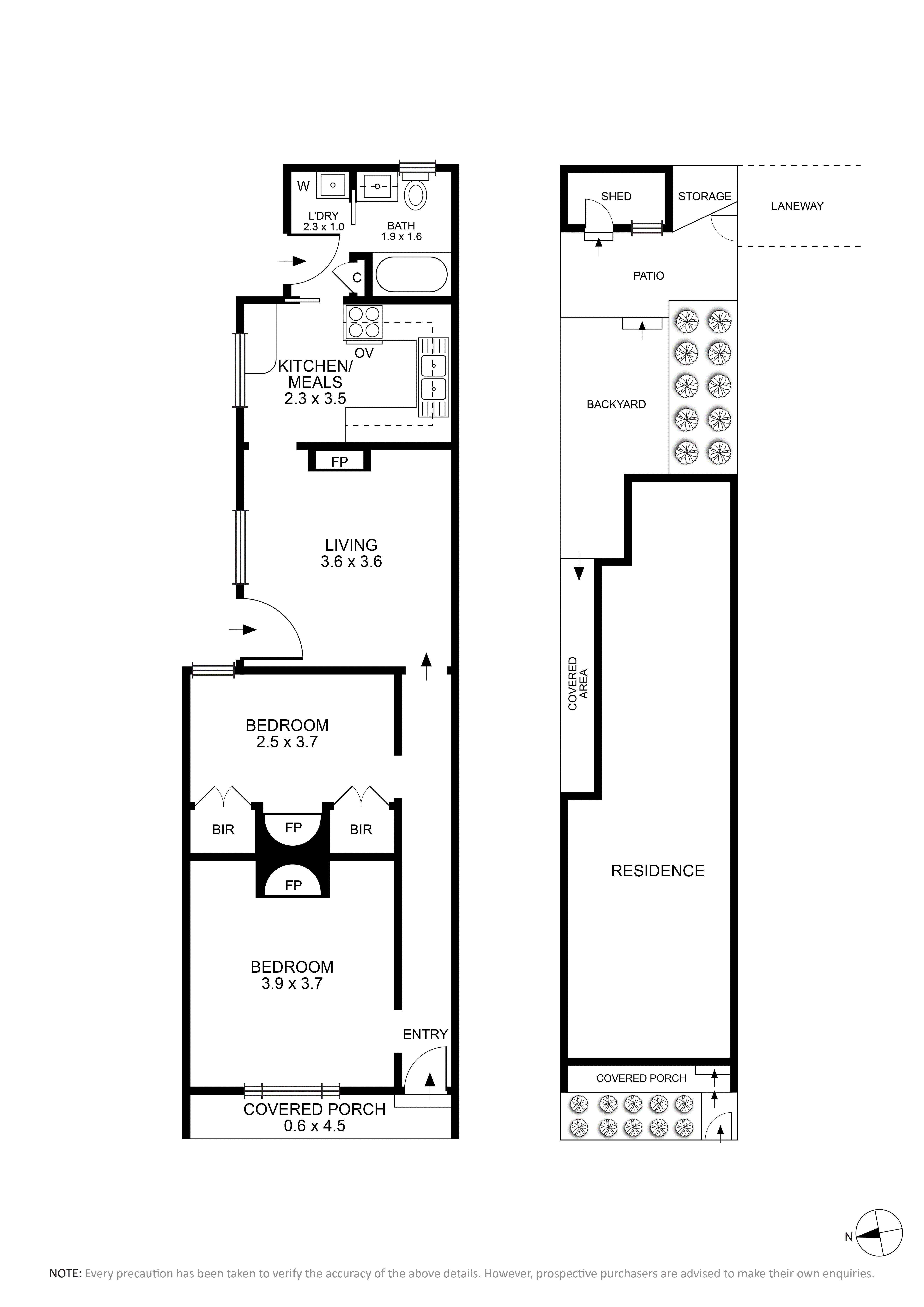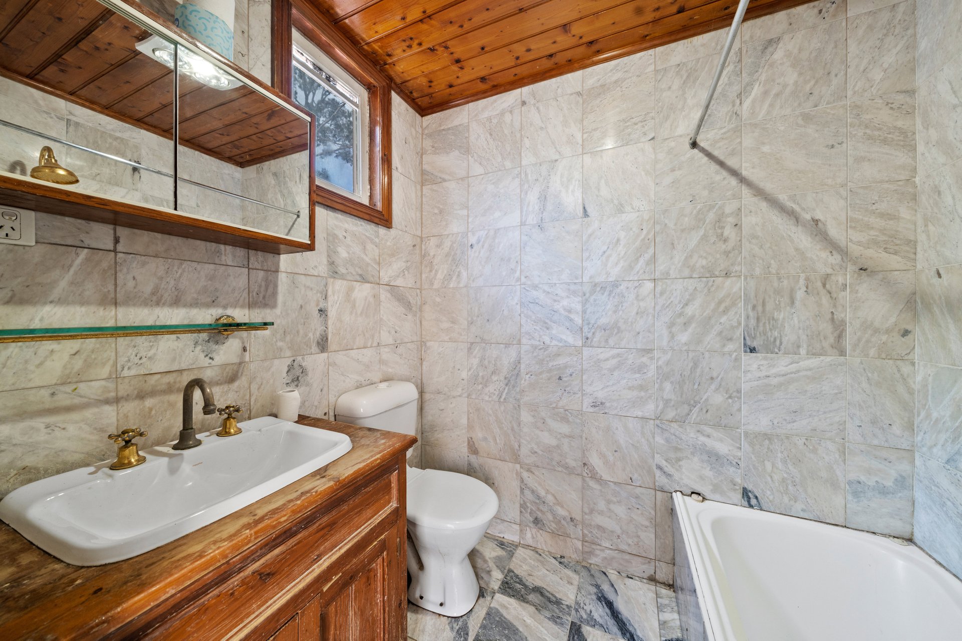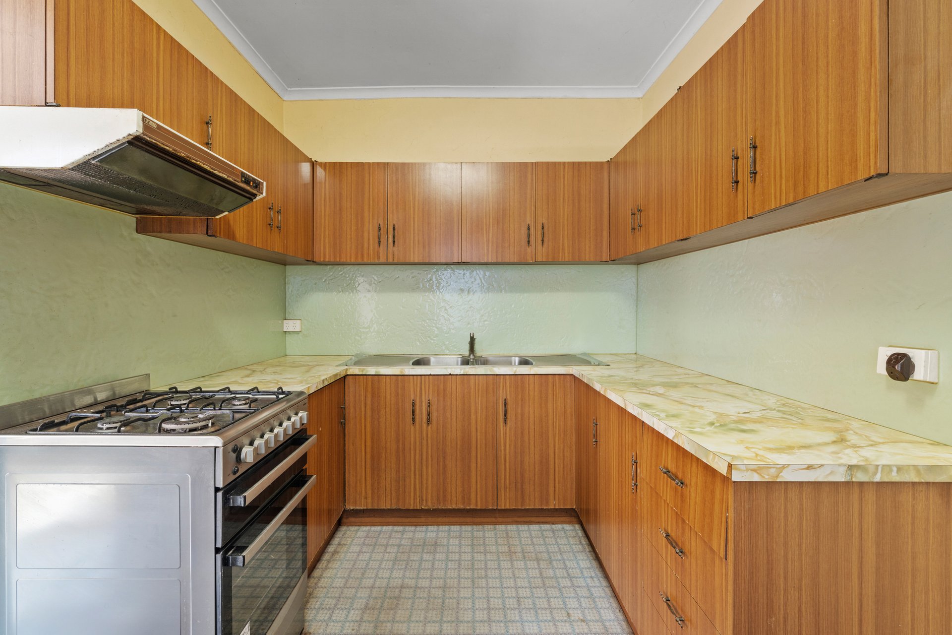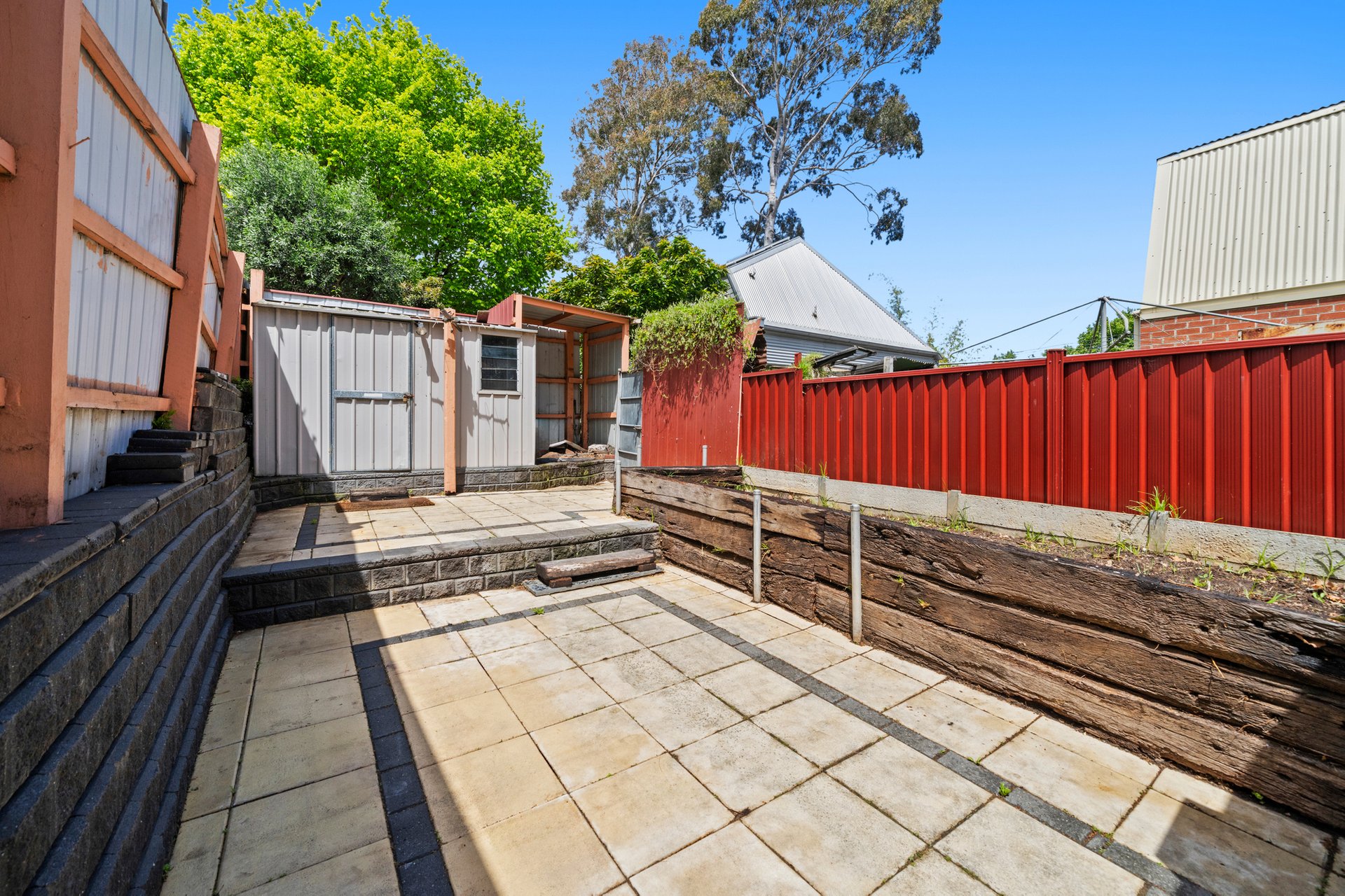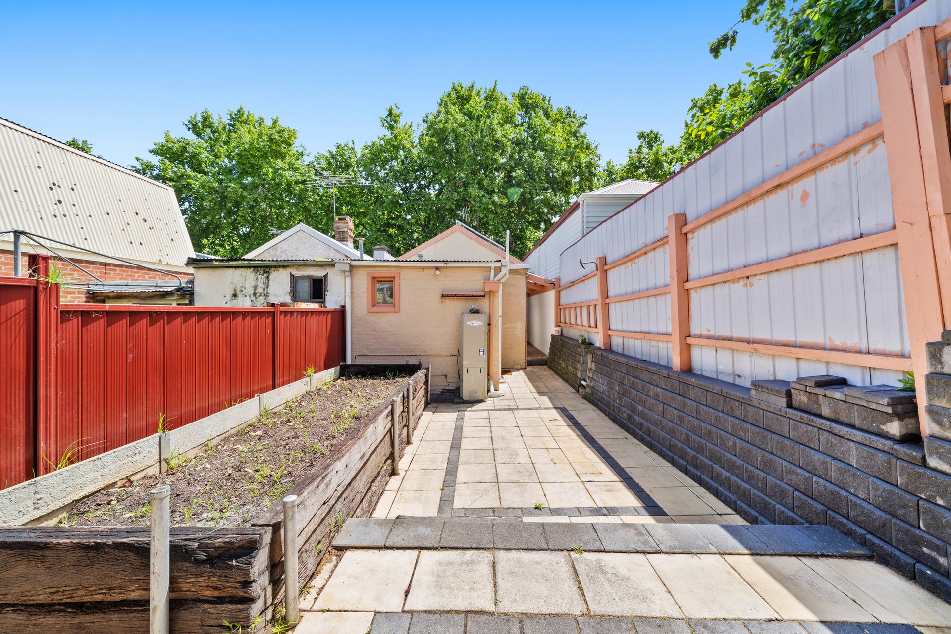 The older style kitchen with laminate benchtops, freestanding oven and window overlooking the backyard remains functional while offering clear scope for an open plan upgrade. The entrance bedroom features an original fireplace and good light, with the second bedroom including built in cupboards for flexible use as a study, office or studio. The bathroom, fitted with a shower over bath and tiled flooring, appears to have been updated at some stage and provides a solid base for future improvement.