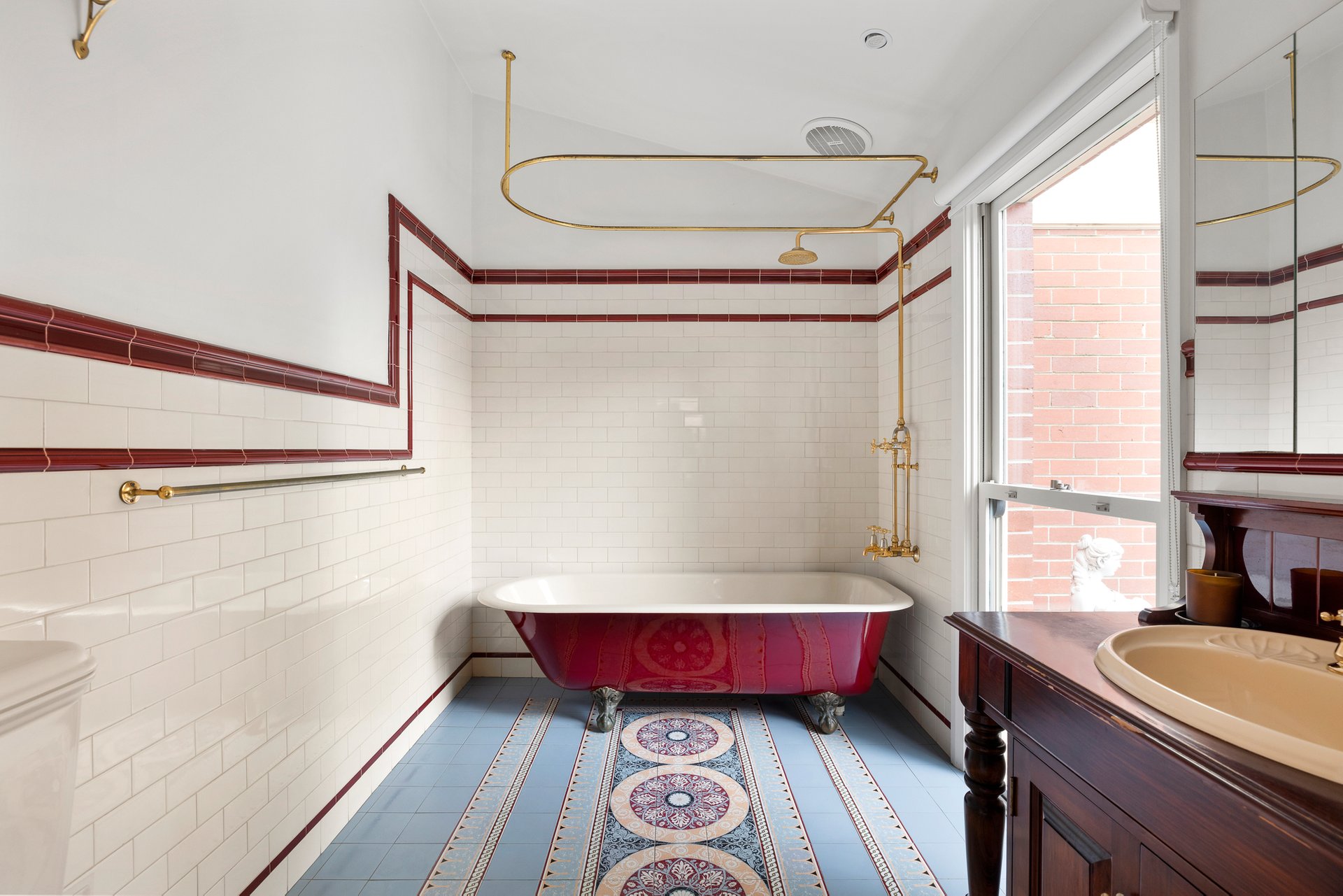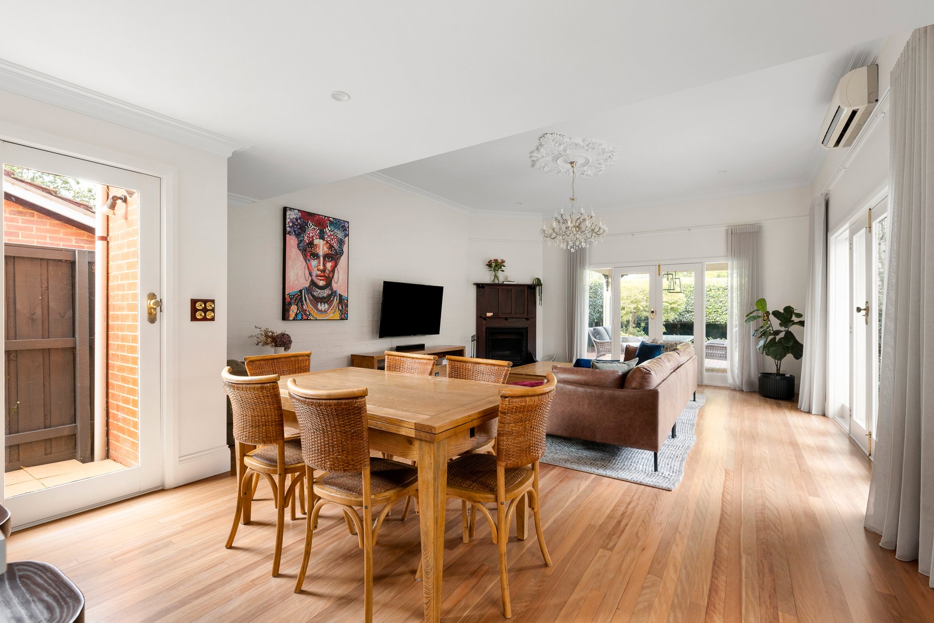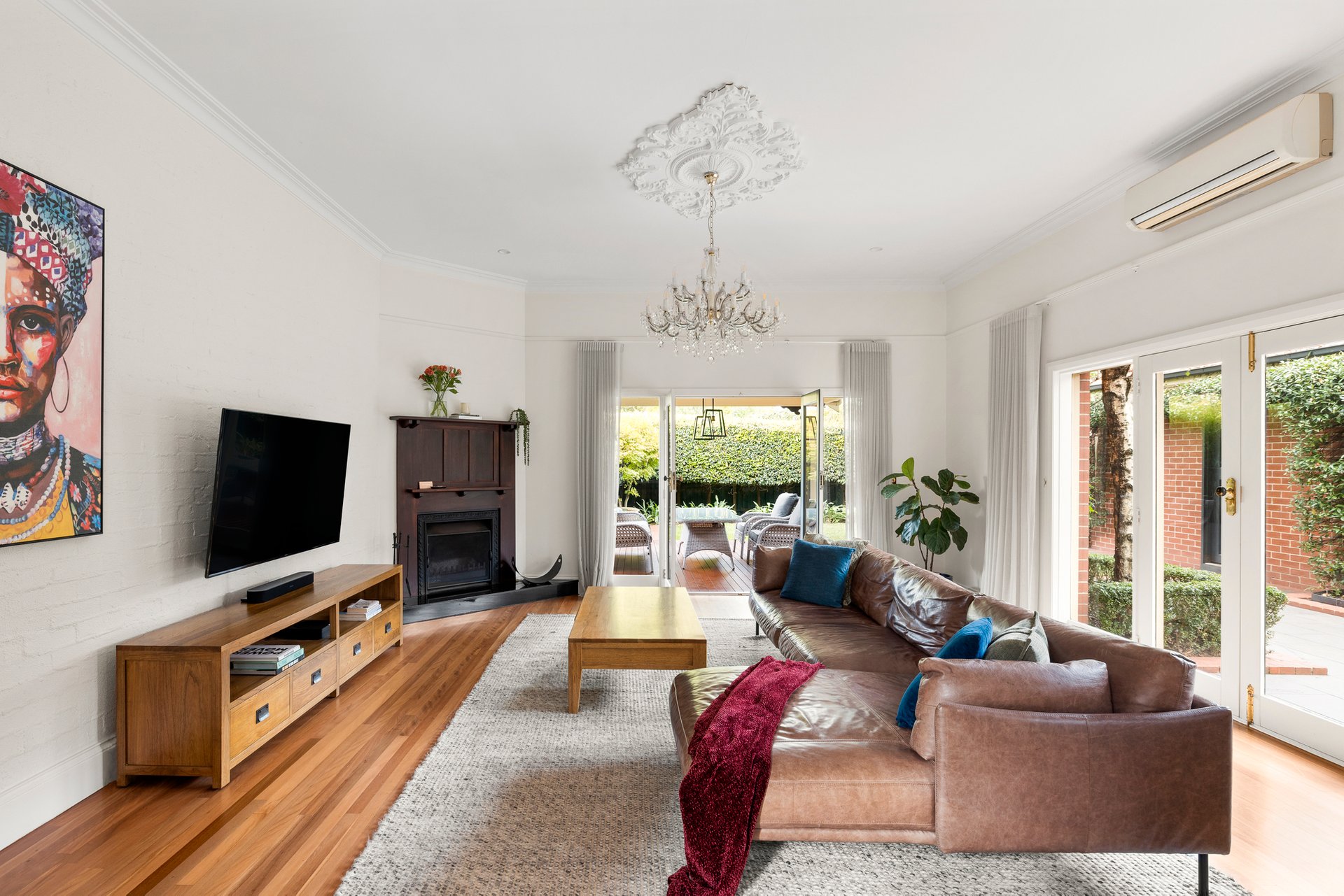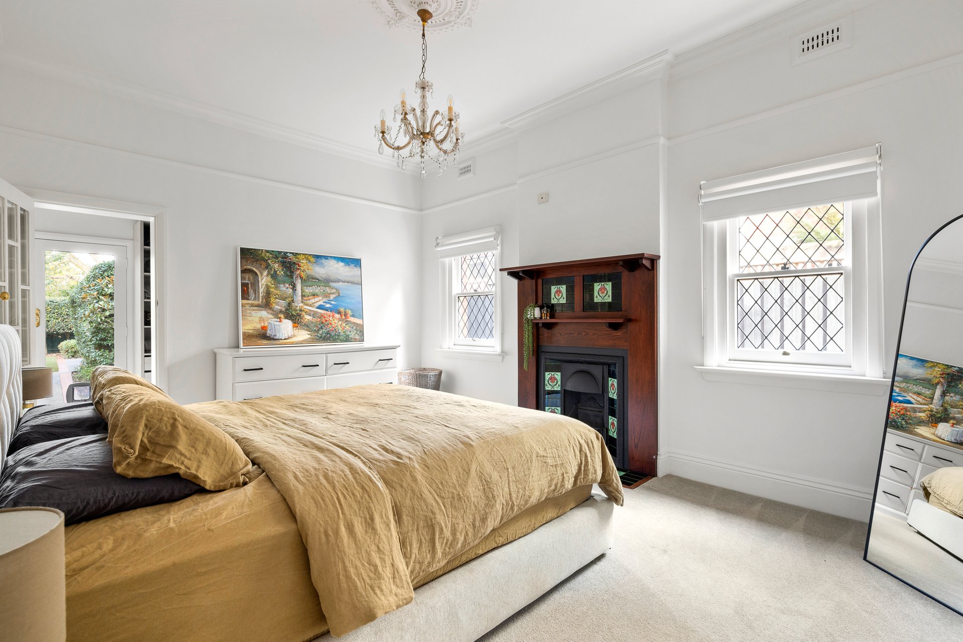 The main bedroom enjoys garden access, a walk-in robe and a charming heritage-inspired ensuite with clawfoot bath. Additional features include a powder room, ducted heating, split system air conditioning, automatic gates and a secure garage with storage.