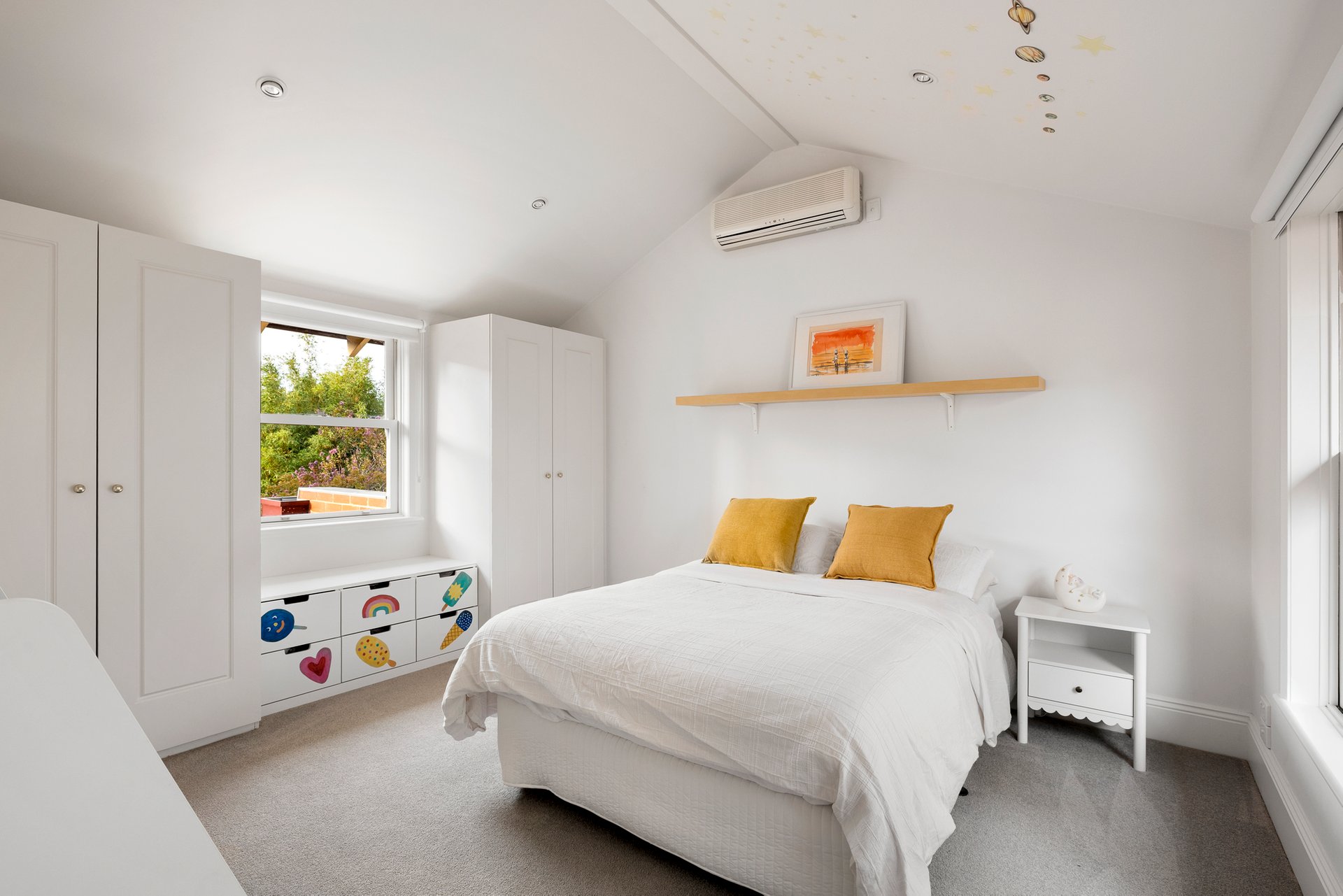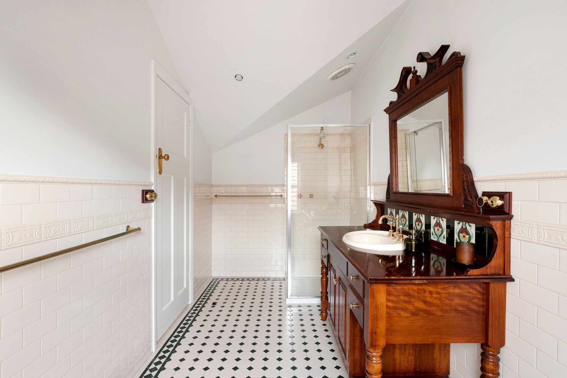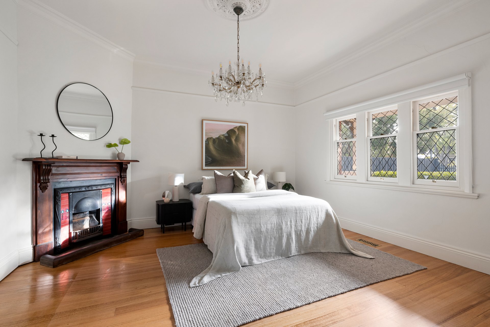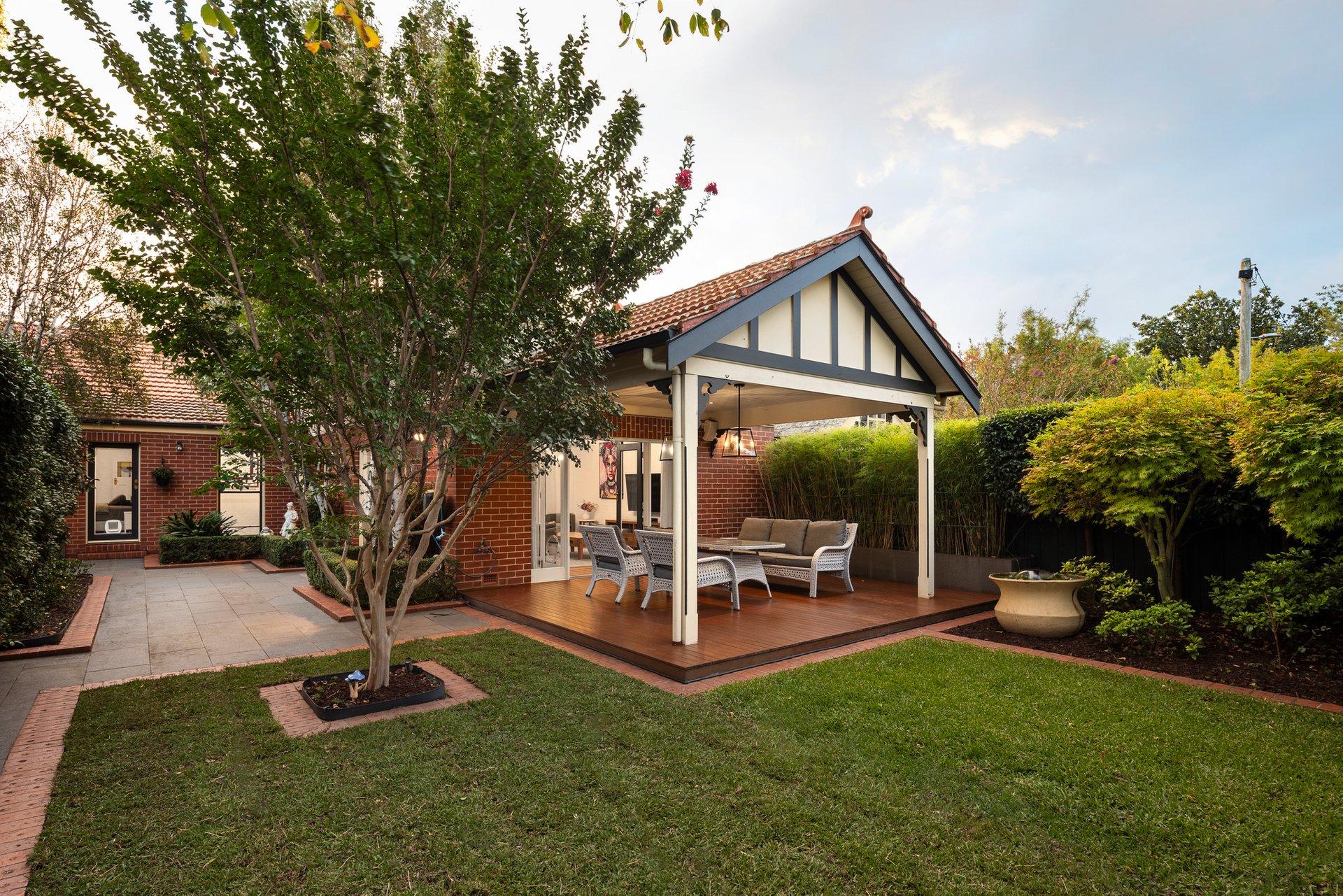 The main bedroom enjoys garden access, a walk-in robe and a charming heritage-inspired ensuite with clawfoot bath. Additional features include a powder room, ducted heating, split system air conditioning, automatic gates and a secure garage with storage.