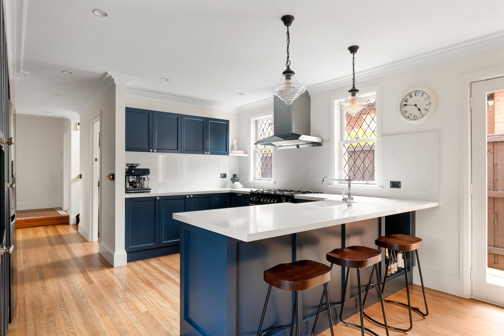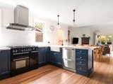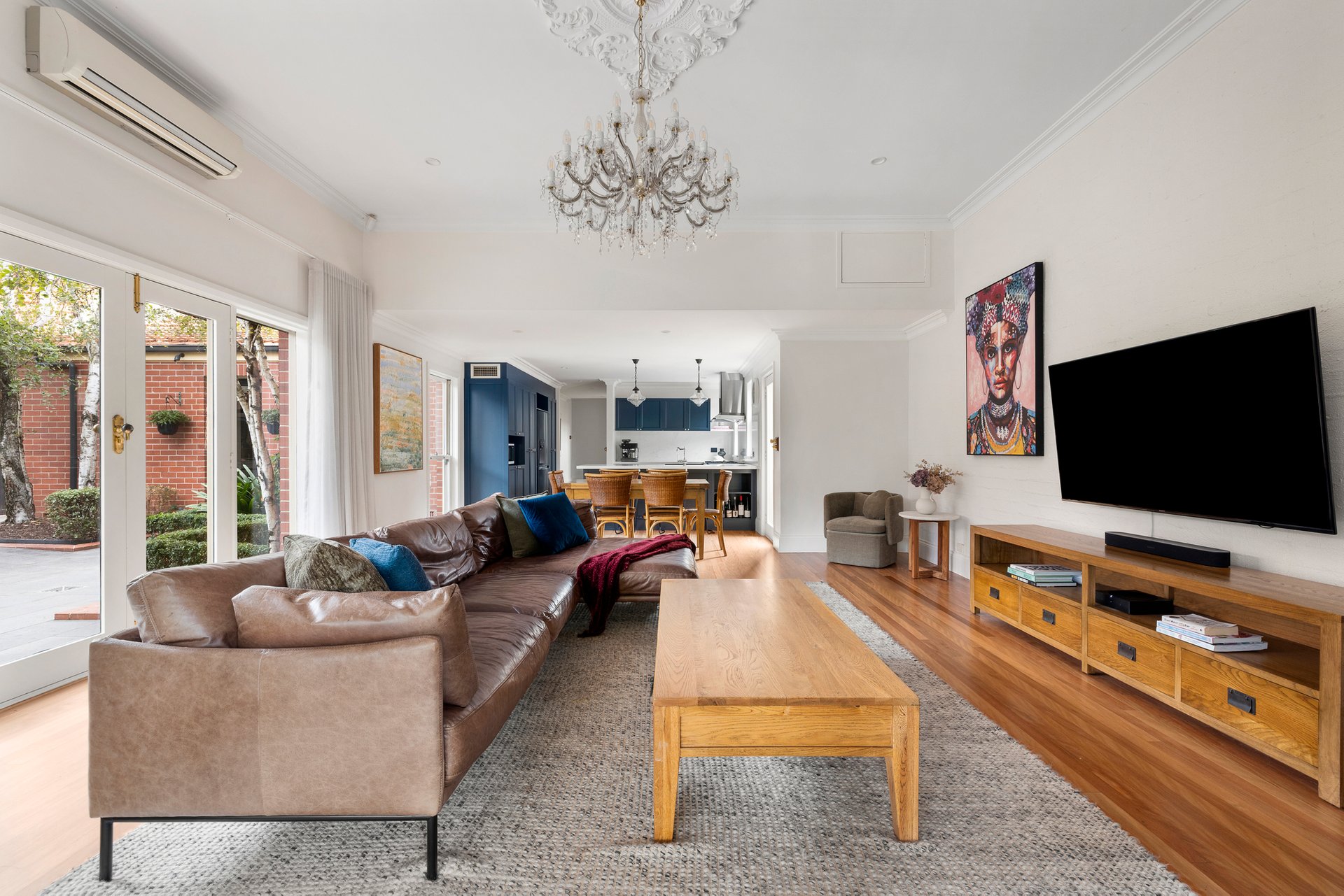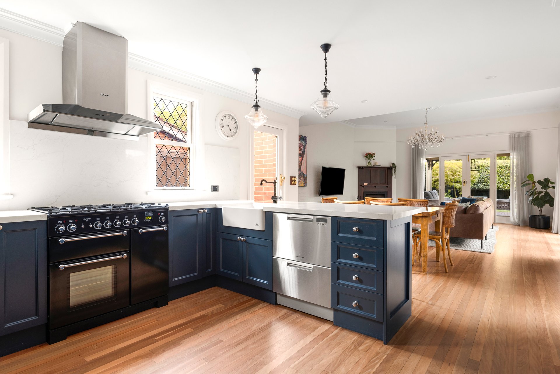 At the rear, a stunning renovation reveals a vast open-plan living and dining domain, designed for effortless entertaining. French doors extend the space to a covered alfresco and landscaped garden, while the beautifully appointed provincial-style kitchen showcases stone surfaces, elegant cabinetry, a Falcon cooker and a French-made Chambord farmhouse sink.