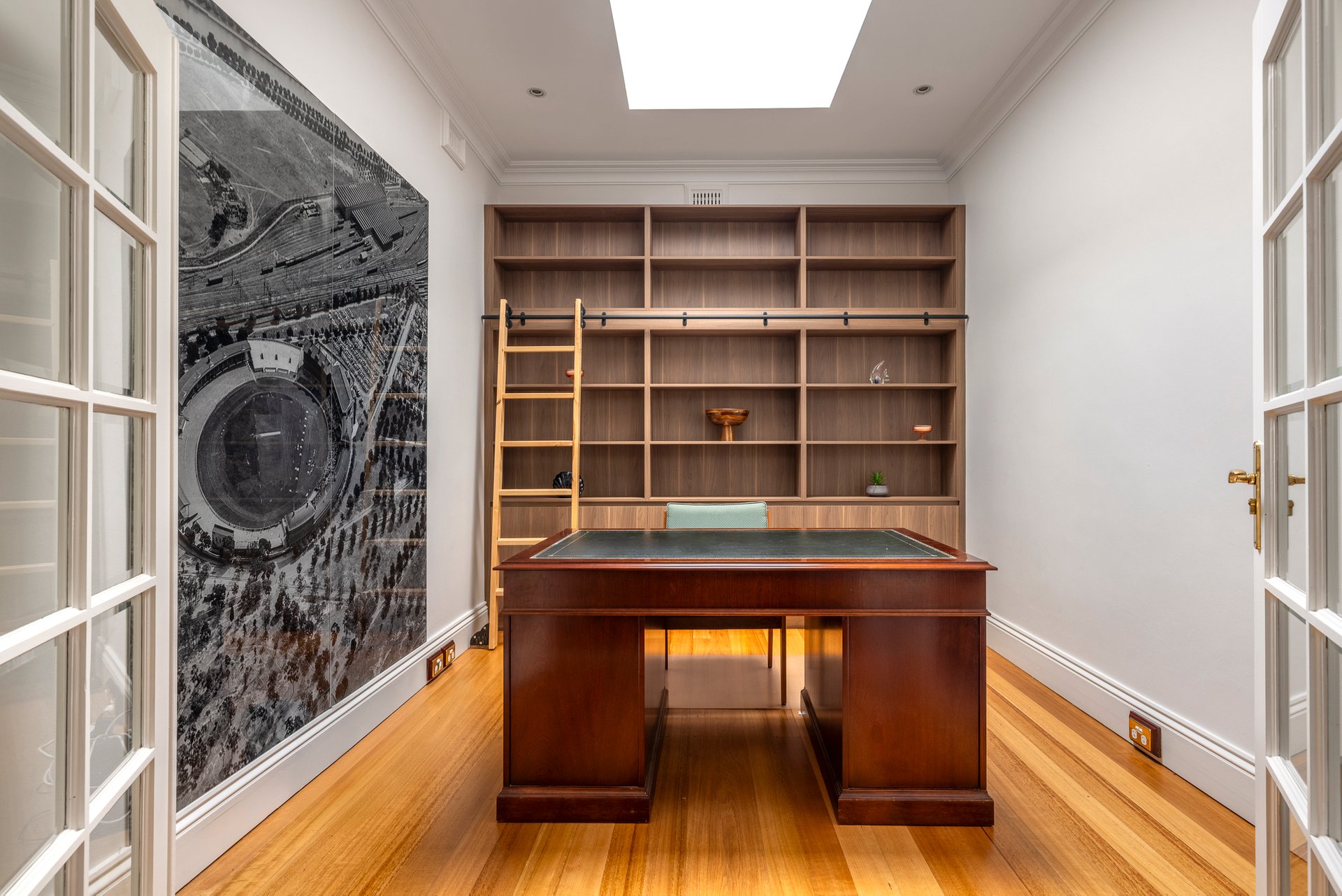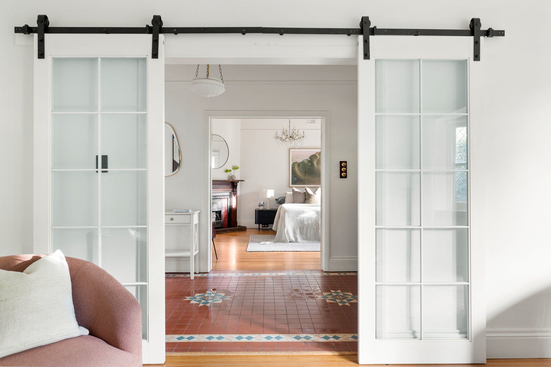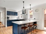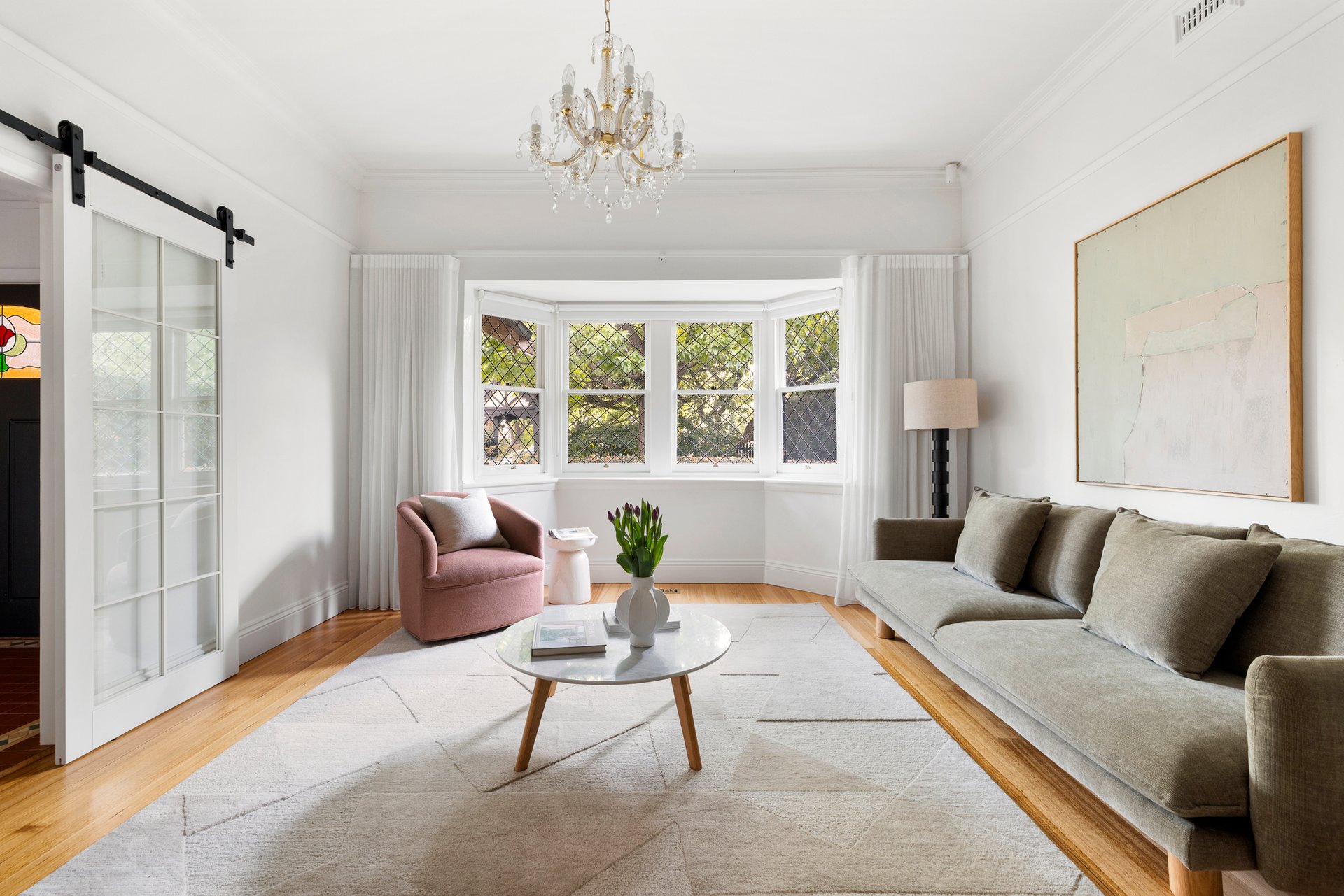 At the rear, a stunning renovation reveals a vast open-plan living and dining domain, designed for effortless entertaining. French doors extend the space to a covered alfresco and landscaped garden, while the beautifully appointed provincial-style kitchen showcases stone surfaces, elegant cabinetry, a Falcon cooker and a French-made Chambord farmhouse sink.