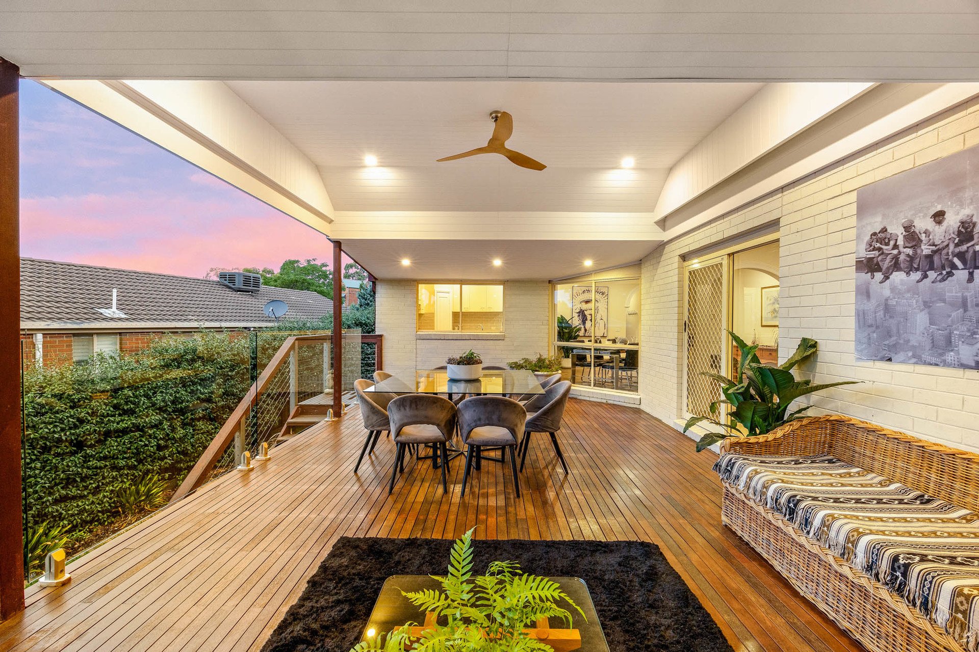 Multiple living zones unfold with ease, including a light-filled living area, open-plan family space and meals zone, anchored by a stylish kitchen appointed with stone benchtops, a breakfast bar, and quality stainless steel appliances including a dishwasher. Entertaining transitions effortlessly to the expansive outdoor deck, where a vaulted white ceiling, tropical fan, downlights, and frameless glass fencing establish a luxurious alfresco domain overlooking the manicured rear garden.