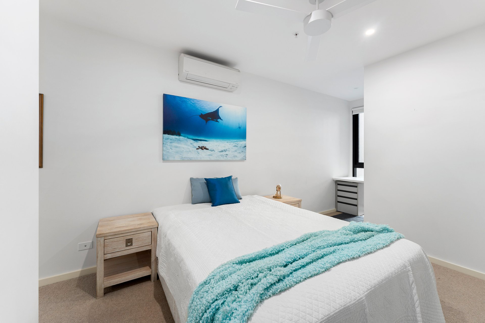 - Split system heating/cooling plus fans in living and bedrooms