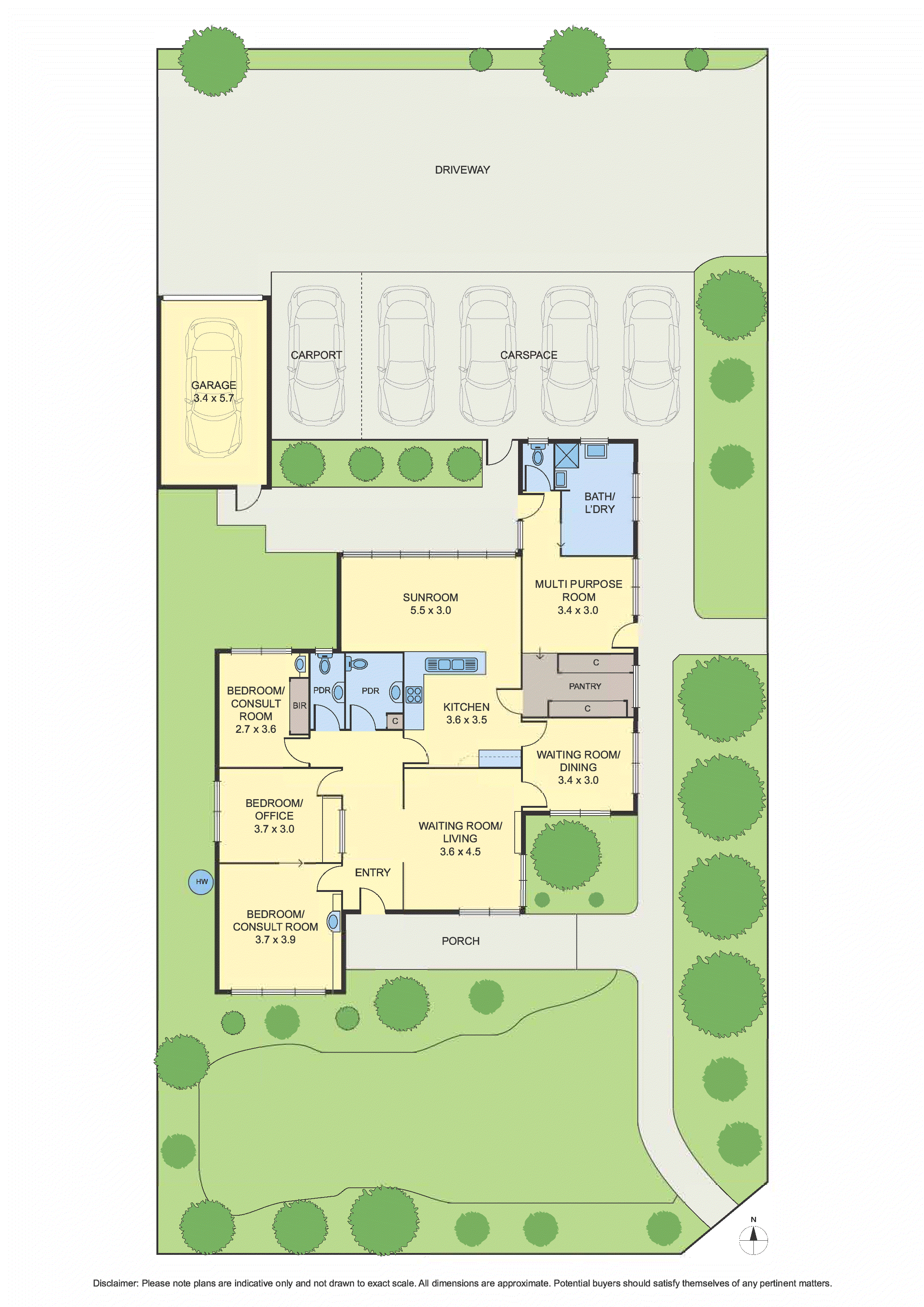 The existing residence/medical facility comprises 3 bedrooms (or consulting rooms), a light-filled sunroom, a spacious living/dining area, classic kitchen, bright bathroom, and a flexible multi-purpose room . Comfort is assured with ducted heating, refrigerative cooling, and double-glazed windows throughout. Adding further versatility are three toilets, including a disabled-access toilet. Expansive lawned and paved courtyard surrounds complete the picture.