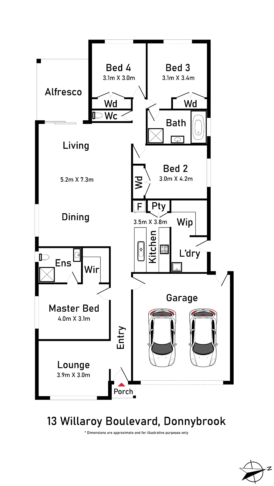 This stylish and modern four-bedroom home in the sought-after Donnybrae Estate offers comfort, space, and a touch of luxury. Perfect for families or investors, it is designed for easy and elegant living. Set on 350sqm (approx.), the home features a master bedroom with a private ensuite and walk-in robe, plus three additional bedrooms with built-in robes and a central bathroom.
