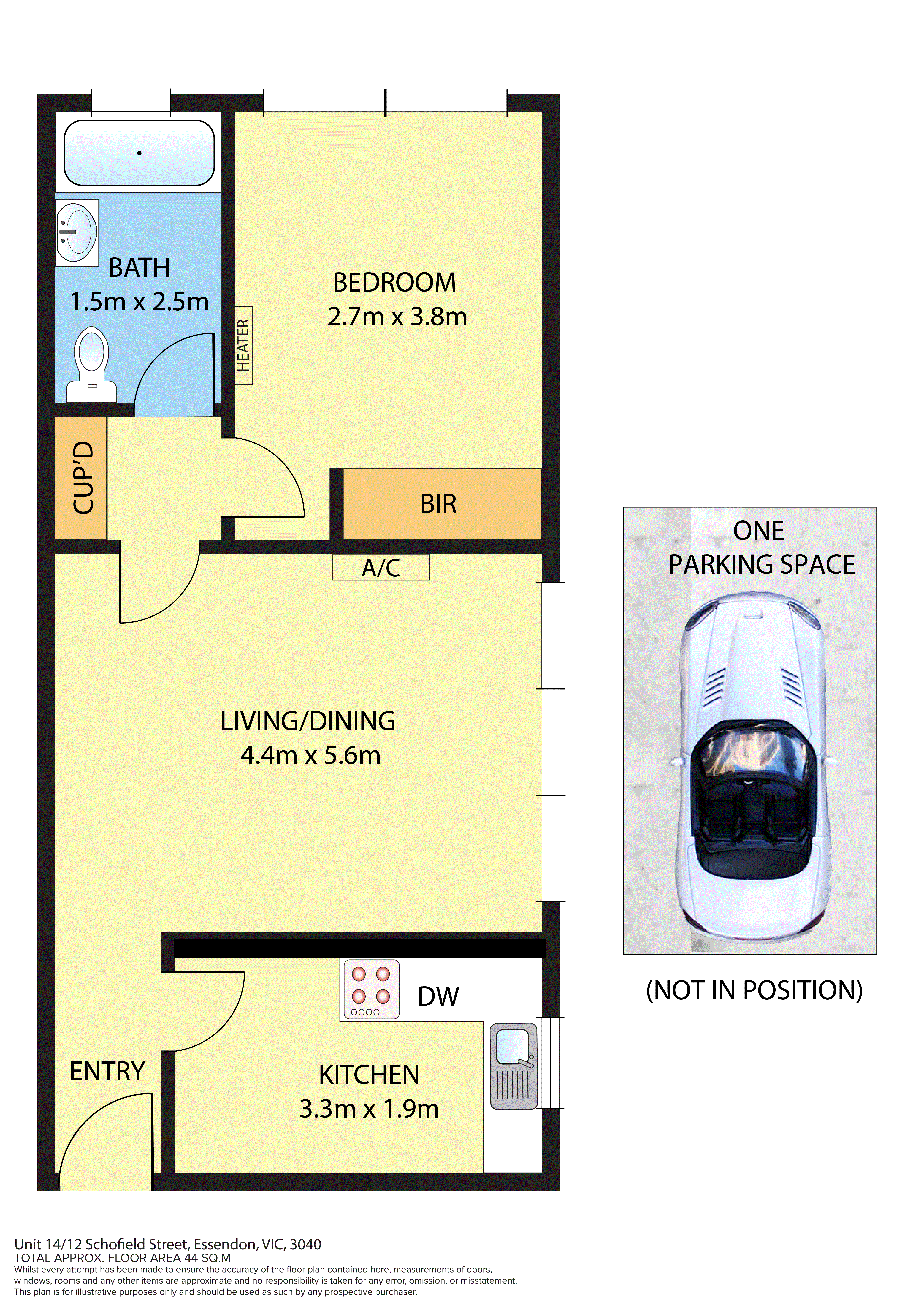 The bedroom is well proportioned and features built-in robes, while the adjoining bathroom is neatly presented with a full-sized bath and practical layout. Clever storage throughout the apartment enhances everyday living, making the home both functional and easy to maintain. Completing the package is the added convenience of one off-street car space.