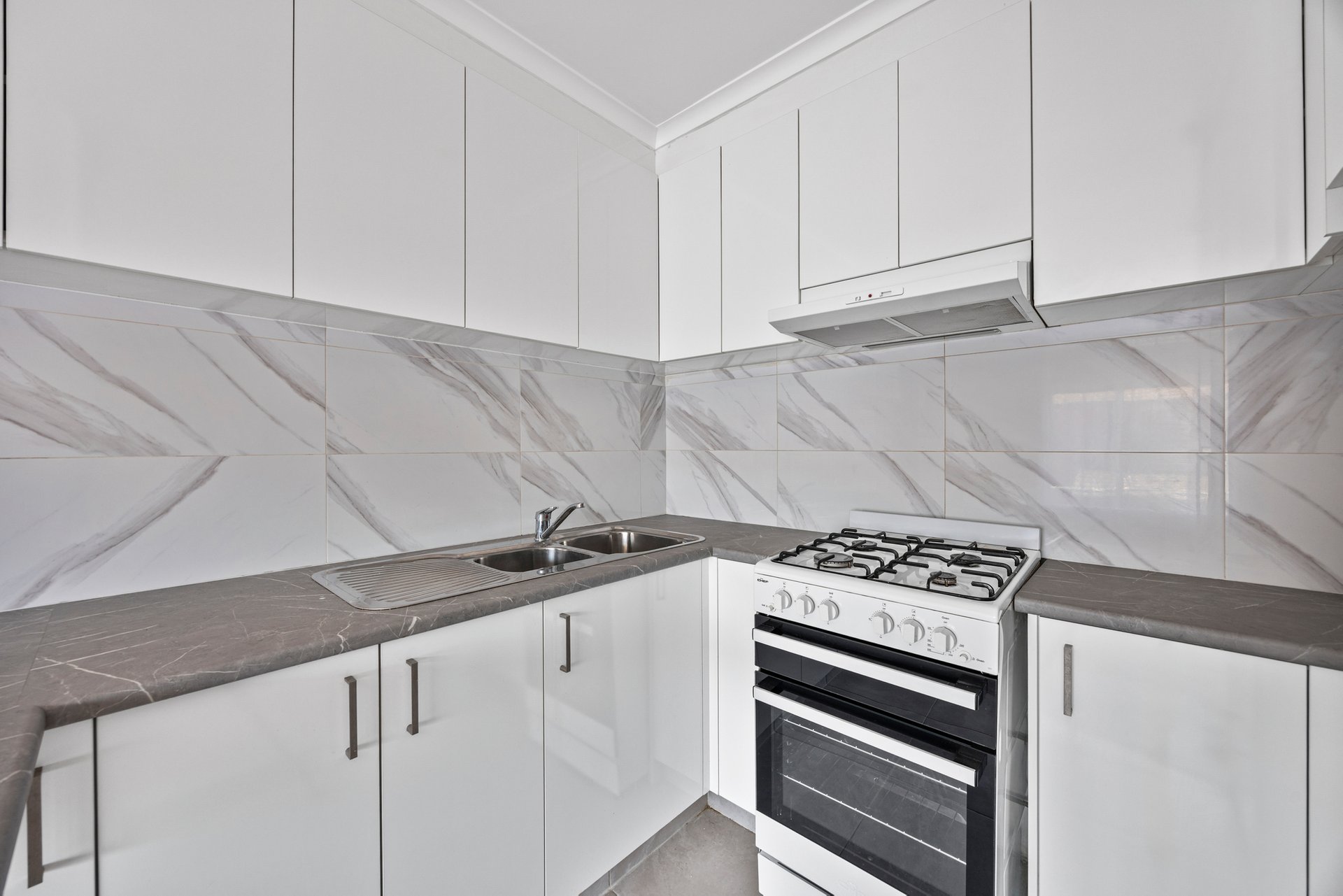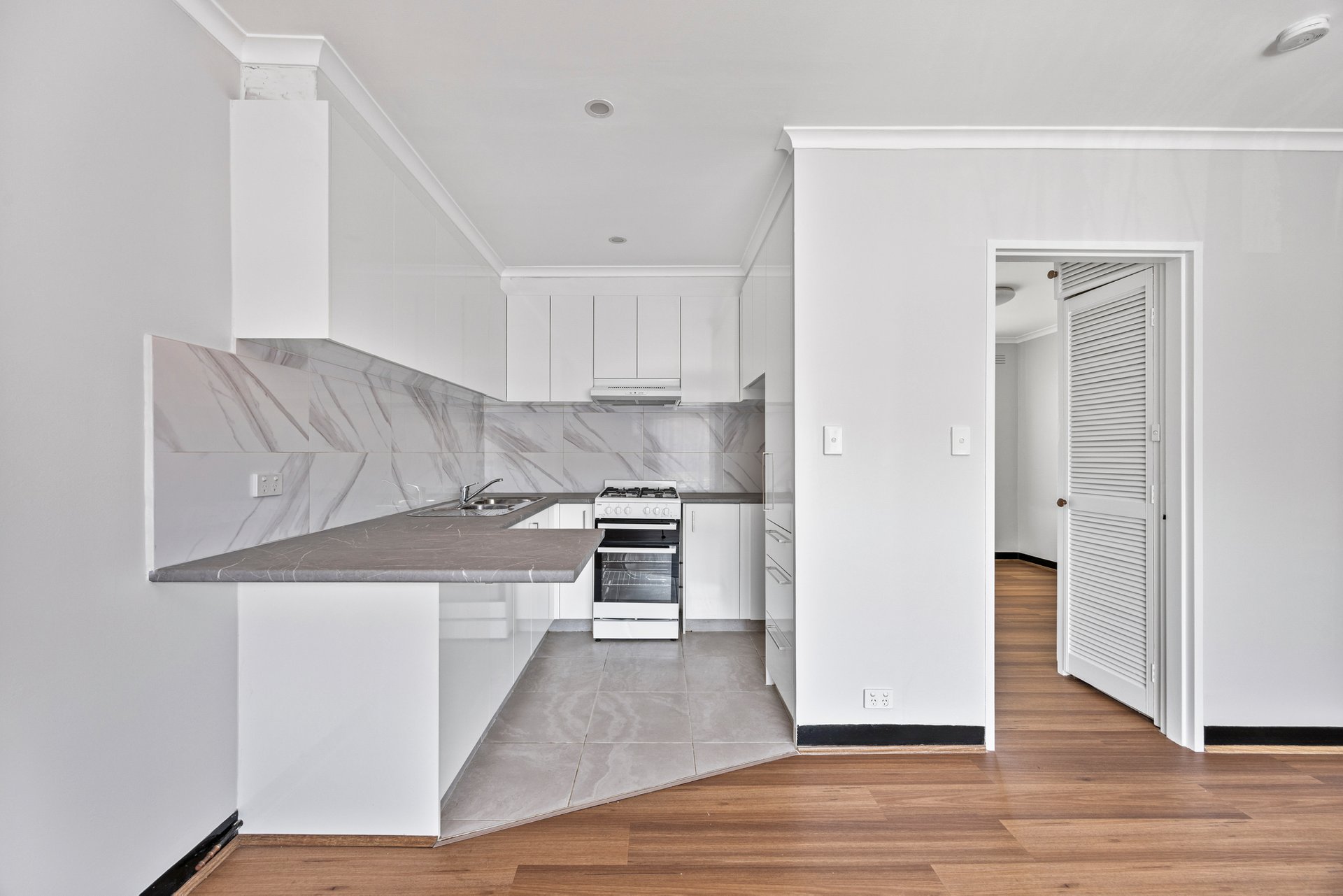 The adjoining kitchen is thoughtfully designed, equipped with laminate benchtops, a tiled splashback, freestanding gas stove and oven, a built-in pantry and ample overhead and under bench storage. Tiled floors and a double overmount sink add further functionality.