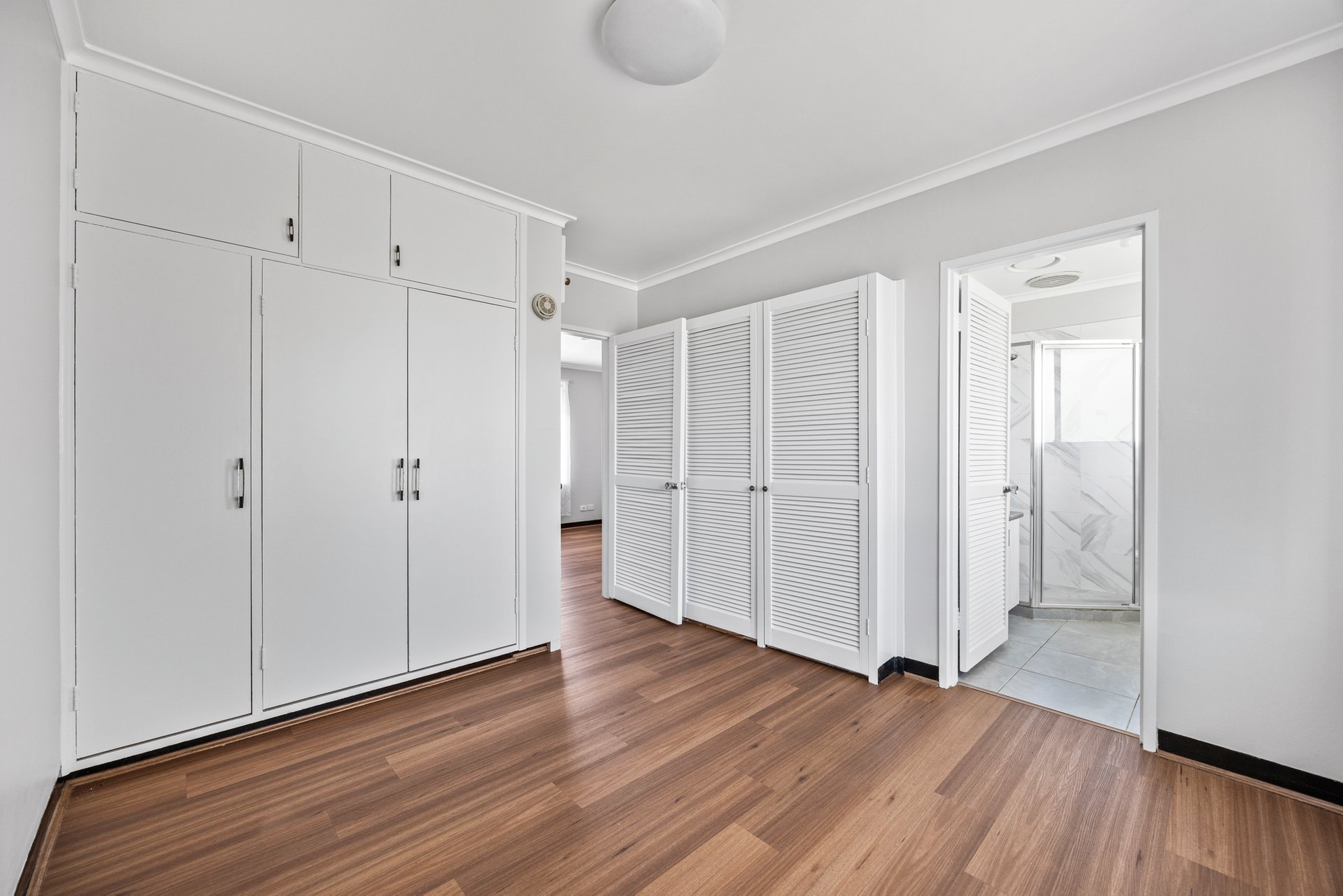 The bedroom continues the theme of comfort, featuring timber floors, a built in robe and natural light. The ensuite bathroom is neatly presented with tiled flooring, a single vanity with laminate benchtops, a shaving cabinet for additional storage and a combined laundry for added convenience.