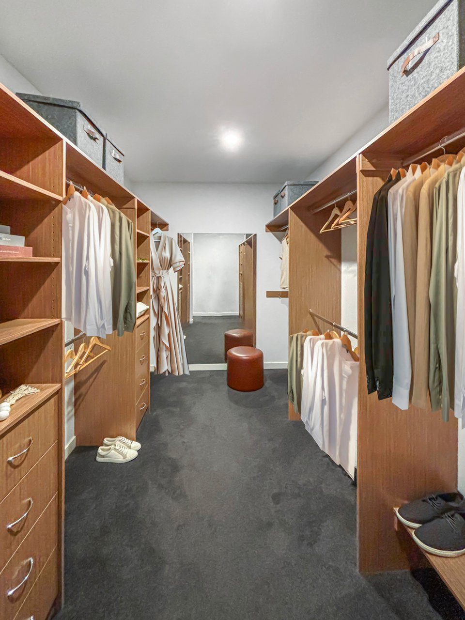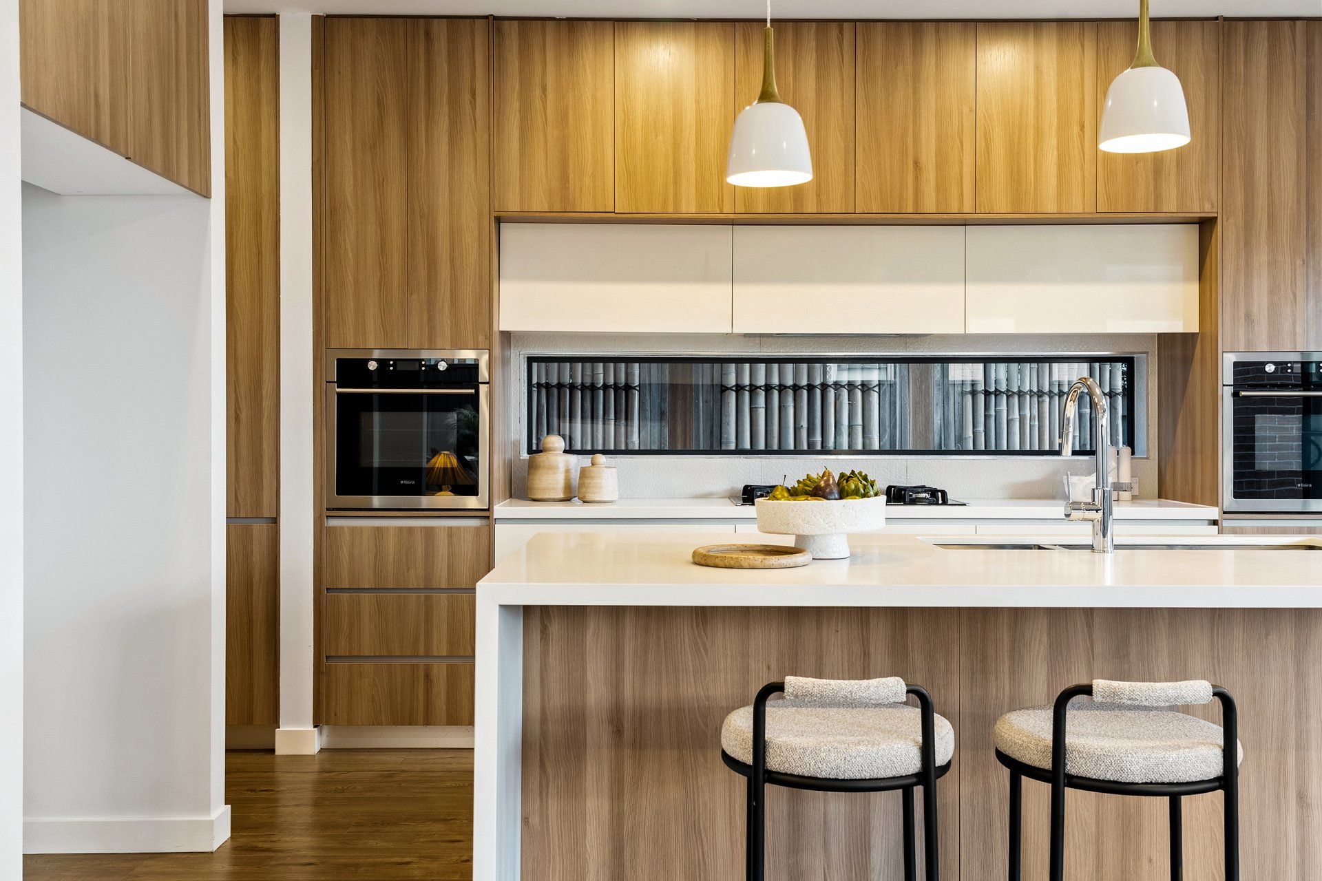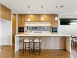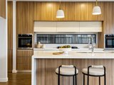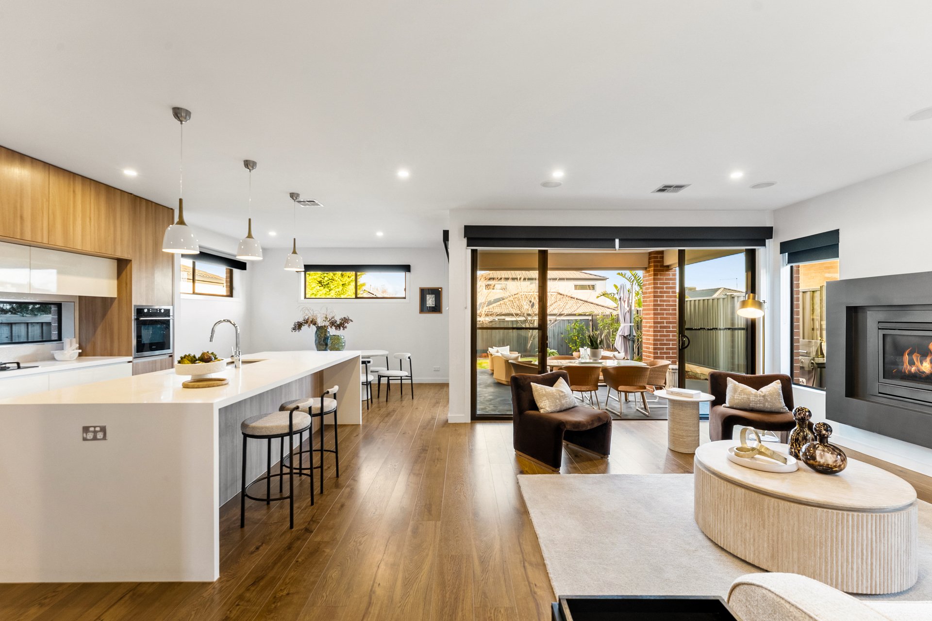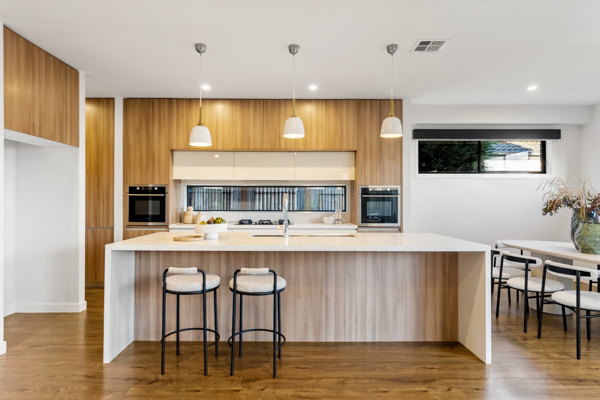 The designer kitchen is a true showpiece, featuring a 900mm gas cooktop, dual wall ovens, integrated double drawer dishwasher, and walk in pantry, all centred around a generous stone island bench that's made for gatherings.