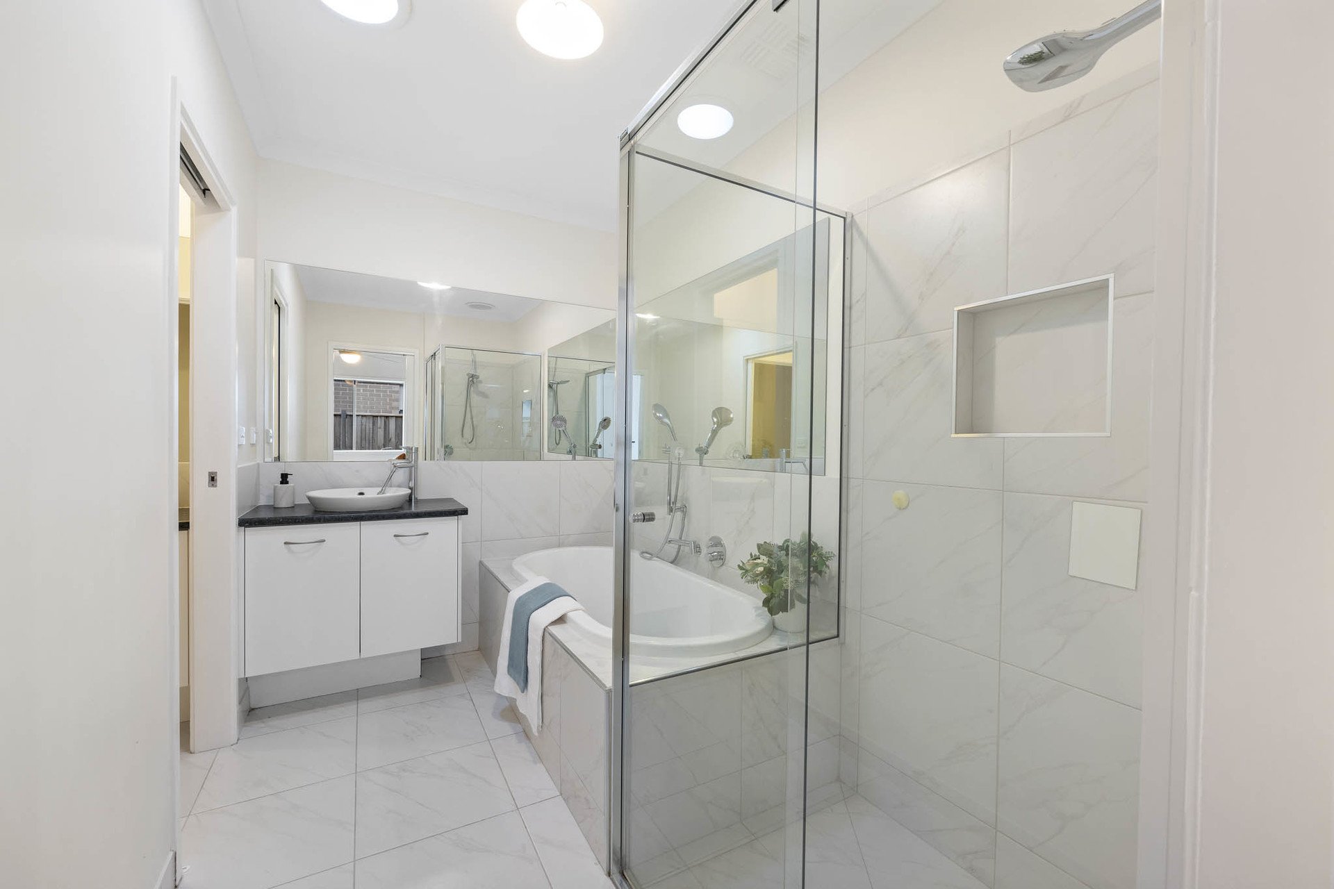 The master suite offers twin walk-in robes and a luxurious ensuite with double vanity, waterfall shower and designer tiles. Three further bedrooms with built-in robes are serviced by a stylish central bathroom with separate toilet and dual access.