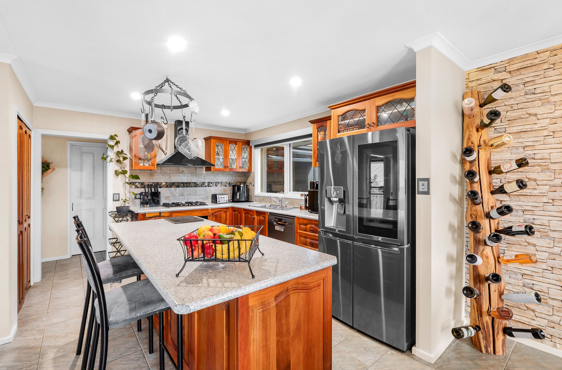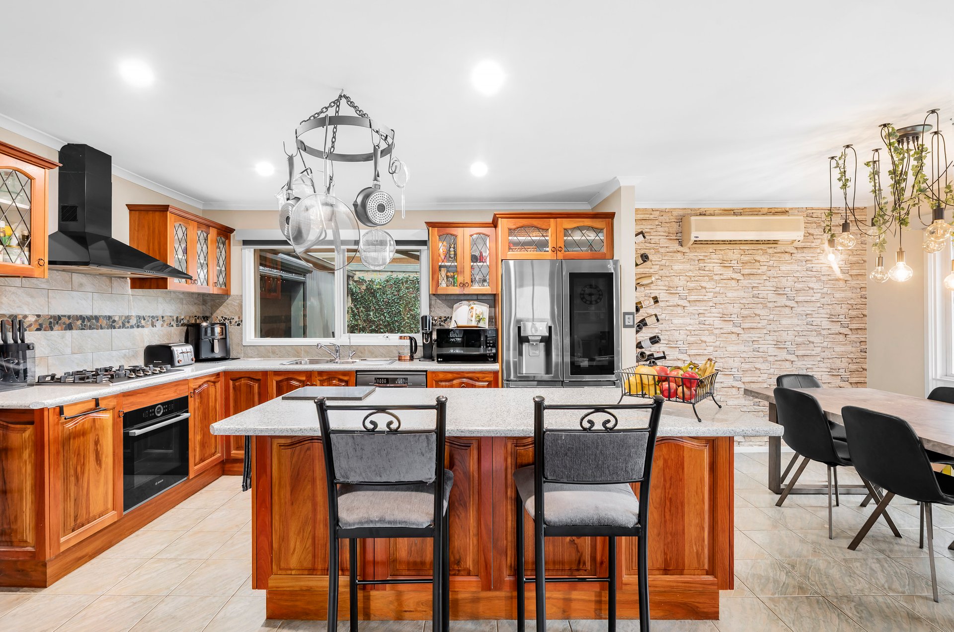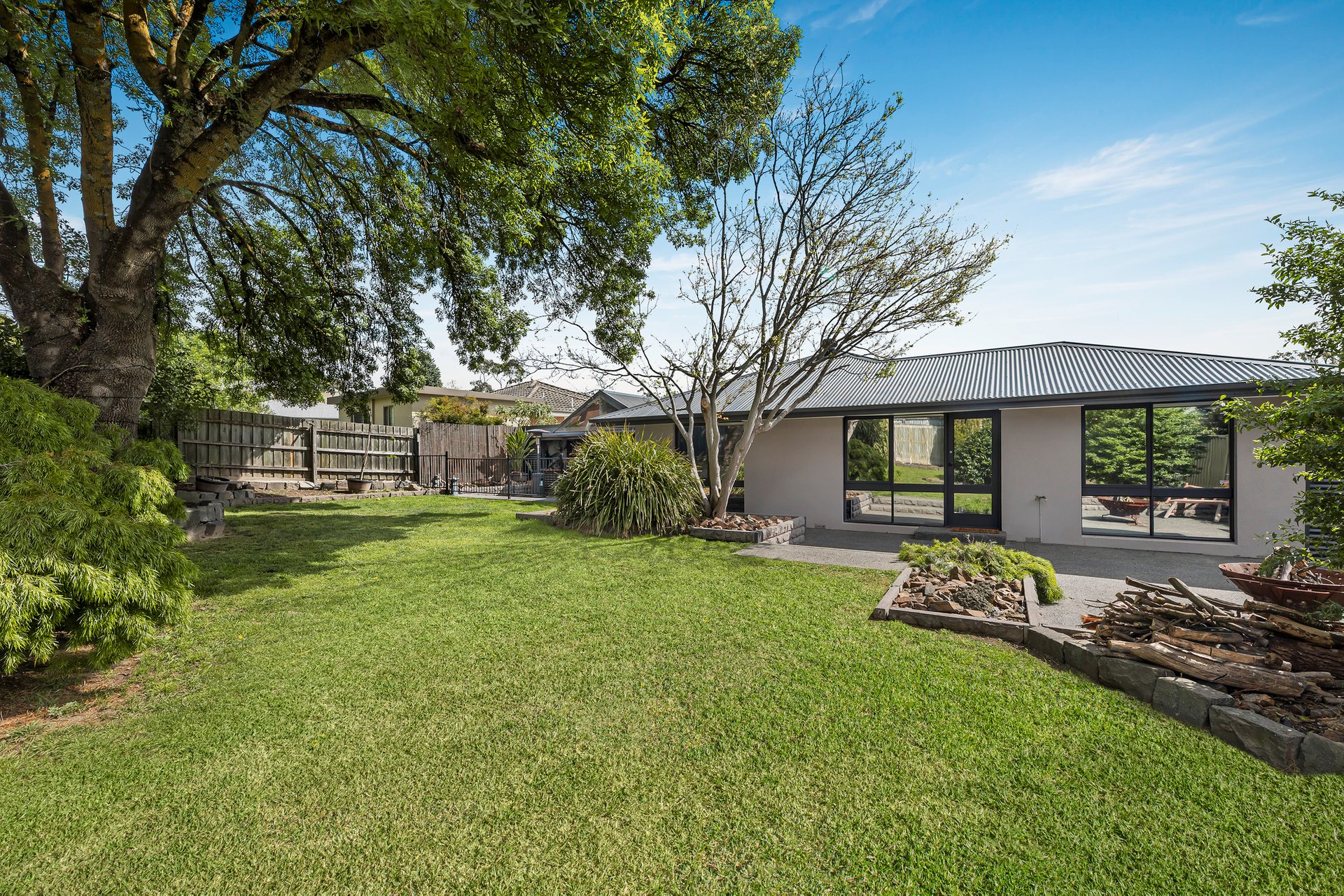 Behind private hedges, lies a rendered single-level residence adorned with timber flooring and sleek tiling. A large open plan lounge and dining room welcomes you inside, overseen by a solid timber kitchen that has all the essential appliances and a breakfast island. From here, an impressive covered alfresco awaits. Complete with a bar, stage and wood heater, it’s a space where family barbeques and grand occasions are effortlessly catered for. Beyond, a generous backyard with a firepit area and lush lawn offers more room for getting together with loved ones or for little ones and pets to play. Restful accommodation is provided by four robed bedrooms, one with an ensuite and another featuring a connecting study or retreat.