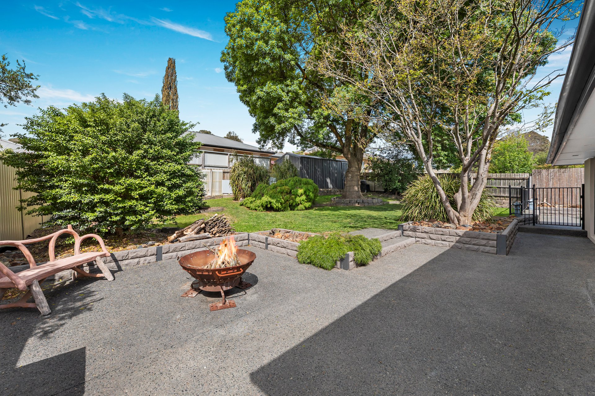 - Backyard with a firepit area and lush lawn