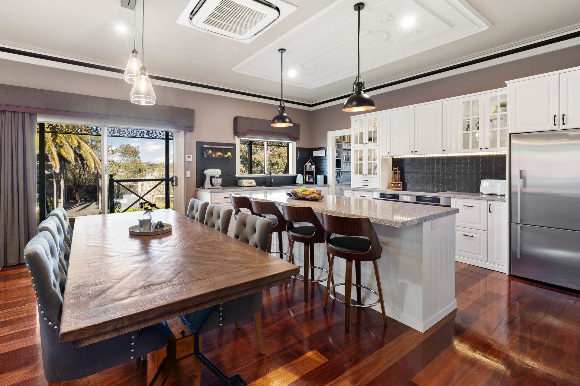 Beyond automatic wrought iron entry gates and a sweeping driveway, the residence emerges in striking Victorian style. A wide wraparound veranda welcomes, while inside, intricate period detail unfolds: Jarrah wainscoting, Karri Feature floorboards, soaring decorative ceilings with roses, and a stunning succession of corbelled arches framing the entrance hall with impressive symmetry.