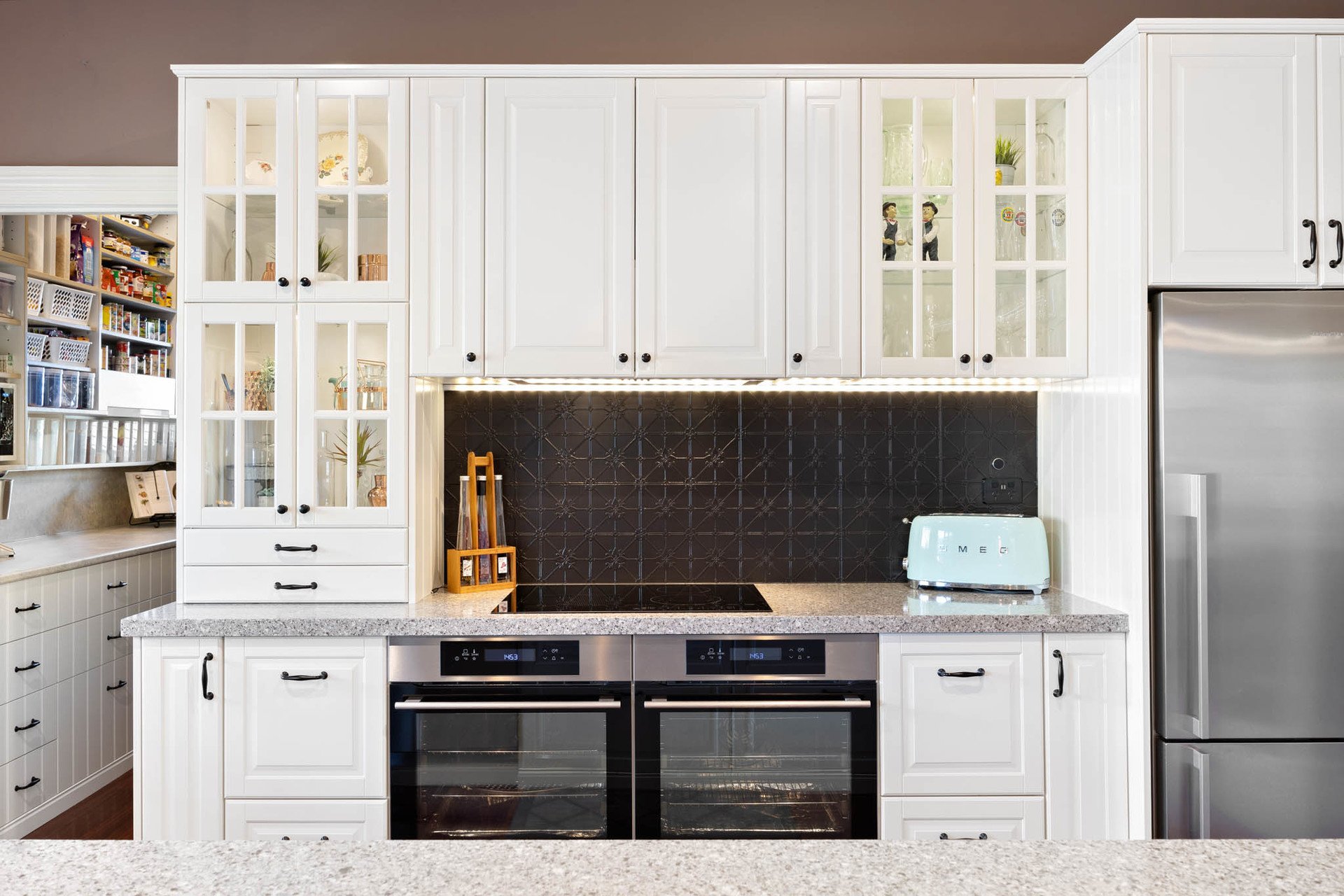 Multiple living and entertaining spaces including an elegant open lounge with an ornate Blackwood fireplace sets the tone, flowing to a dining area and superbly appointed kitchen showcasing engineered stone benches, a pressed metal look tiled splashback, white shaker cabinetry, double underbench ovens, an induction cooktop and Bosch dishwasher, accompanied by a generous butler's-style pantry. Meanwhile, a spectacular 2nd entertainment wing with country views comes complete with a home theatre with the capability to be opened to the entertaining area or enclosed beneath a raised circular ceiling, creating a true cinema experience.