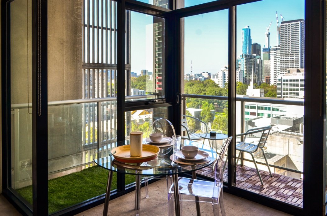 Floor-to-ceiling windows frame a full-width balcony with an elevated outlook.