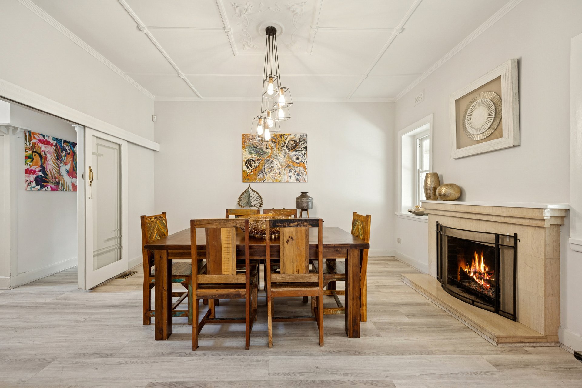 A light-filled front living room is framed by a bay window and open fireplace. Directly opposite, a versatile room adapts as a home office or fourth bedroom as needs change. Moving through, a dedicated dining room with its own fireplace sits alongside the kitchen and meals area, fitted with a stainless-steel oven, gas cooktop, and a dishwasher. At the rear, a second living room opens to a covered verandah, creating an easy transition between indoor and outdoor living. Mature gardens surround the backyard, while a secure front courtyard provides another usable outdoor area.